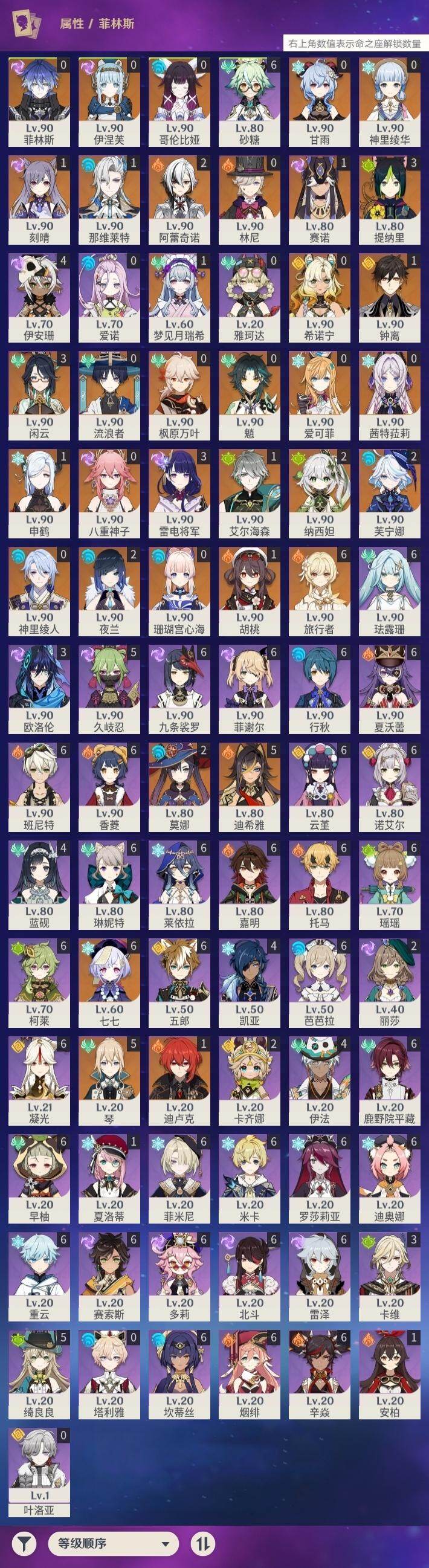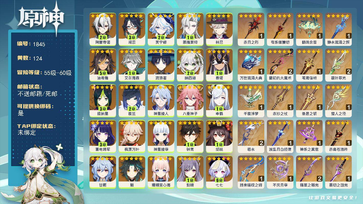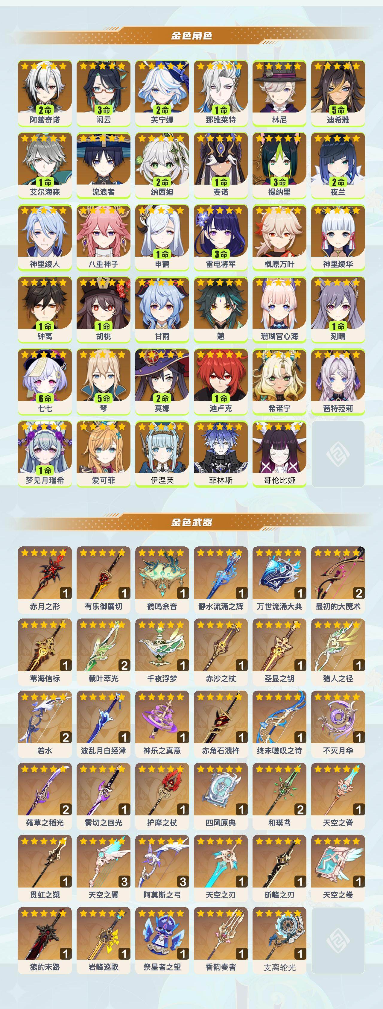 [16523224]60级/124黄/女主/35个五星角色/36个五星武器 2命阿蕾奇诺3命闲云2命芙宁娜1命那维莱特0命林尼5命迪希雅1命艾尔海森0命流浪者2命纳西妲1命赛诺3命提纳里2命夜兰0命神里绫人0命八重神子1命申鹤3命雷电将军0命枫原万叶0命神里绫华1命钟离1命胡桃0命甘雨0命魈0命珊瑚宫心海1命刻晴满命七七5命琴2命莫娜1命迪卢克0命希诺宁0命茜特菈莉1命梦见月瑞希0命爱可菲0命伊涅芙0命菲林斯0命哥伦比娅精1赤月之形精1有乐御簾切精1鹤鸣余音精1静水流涌之辉精1万世流涌大典精2最初的大魔术精1苇海信标精2裁叶萃光精1千夜浮梦精1赤沙之杖精1圣显之钥精1猎人之径精2若水精1波乱月白经津精1神乐之真意精1赤角石溃杵精1终末嗟叹之诗精1不灭月华精2薙草之稻光精1雾切之回光精1护摩之杖精1四风原典精2和璞鸢精1天空之脊精1贯虹之槊精3天空之翼精3阿莫斯之弓精1天空之刃精1斫峰之刃精1天空之卷精1狼的末路精1岩峰巡歌精1祭星者之望精1香韵奏者精1支离轮光