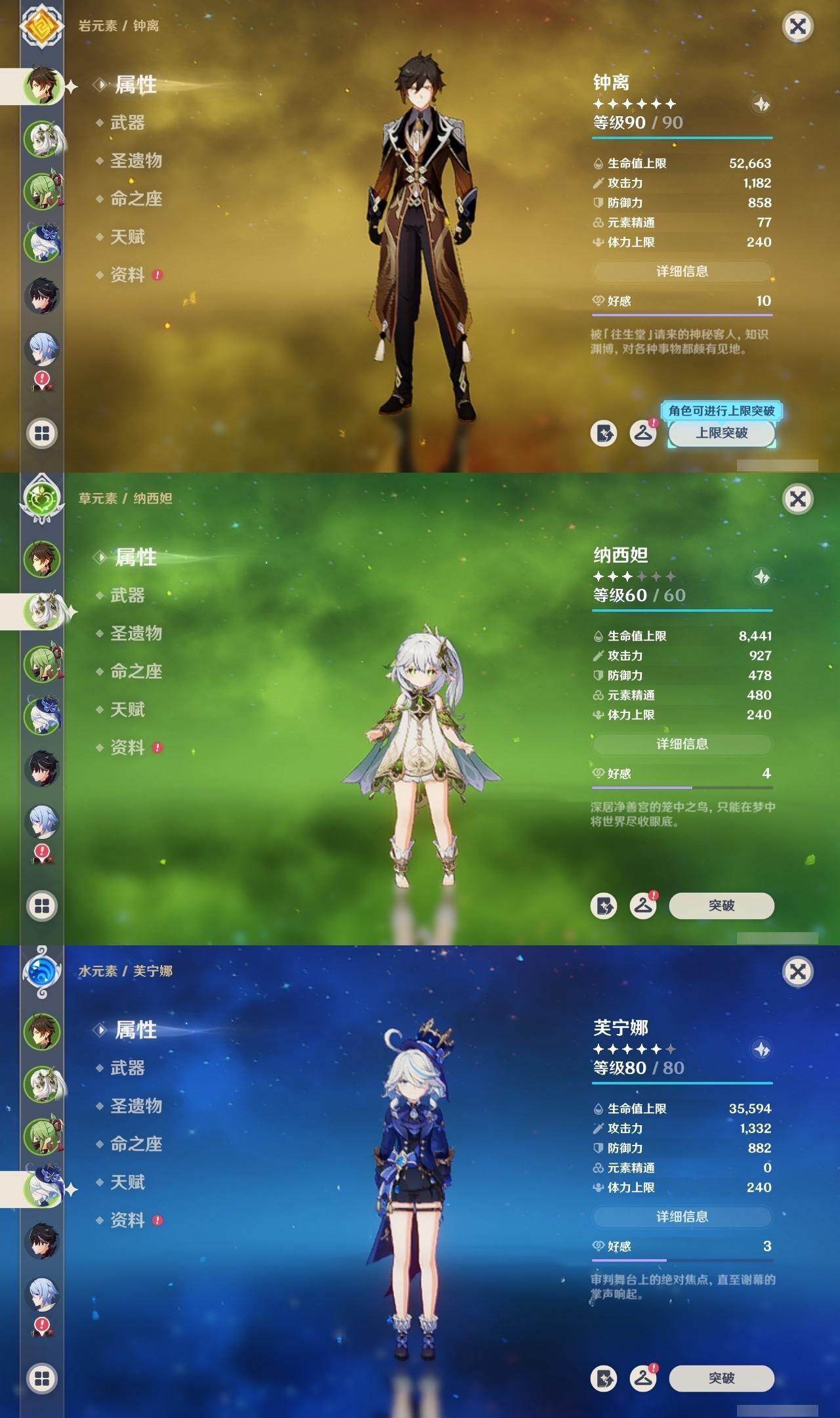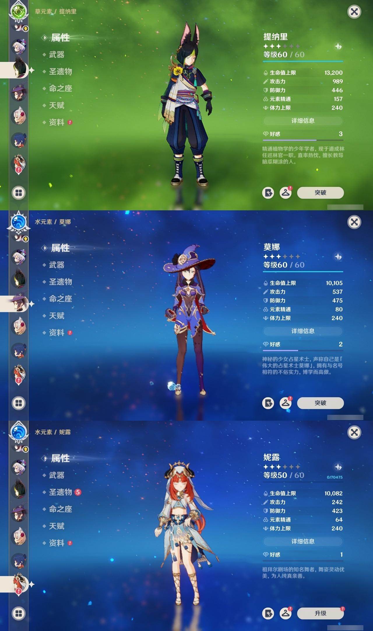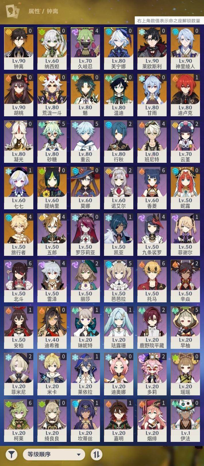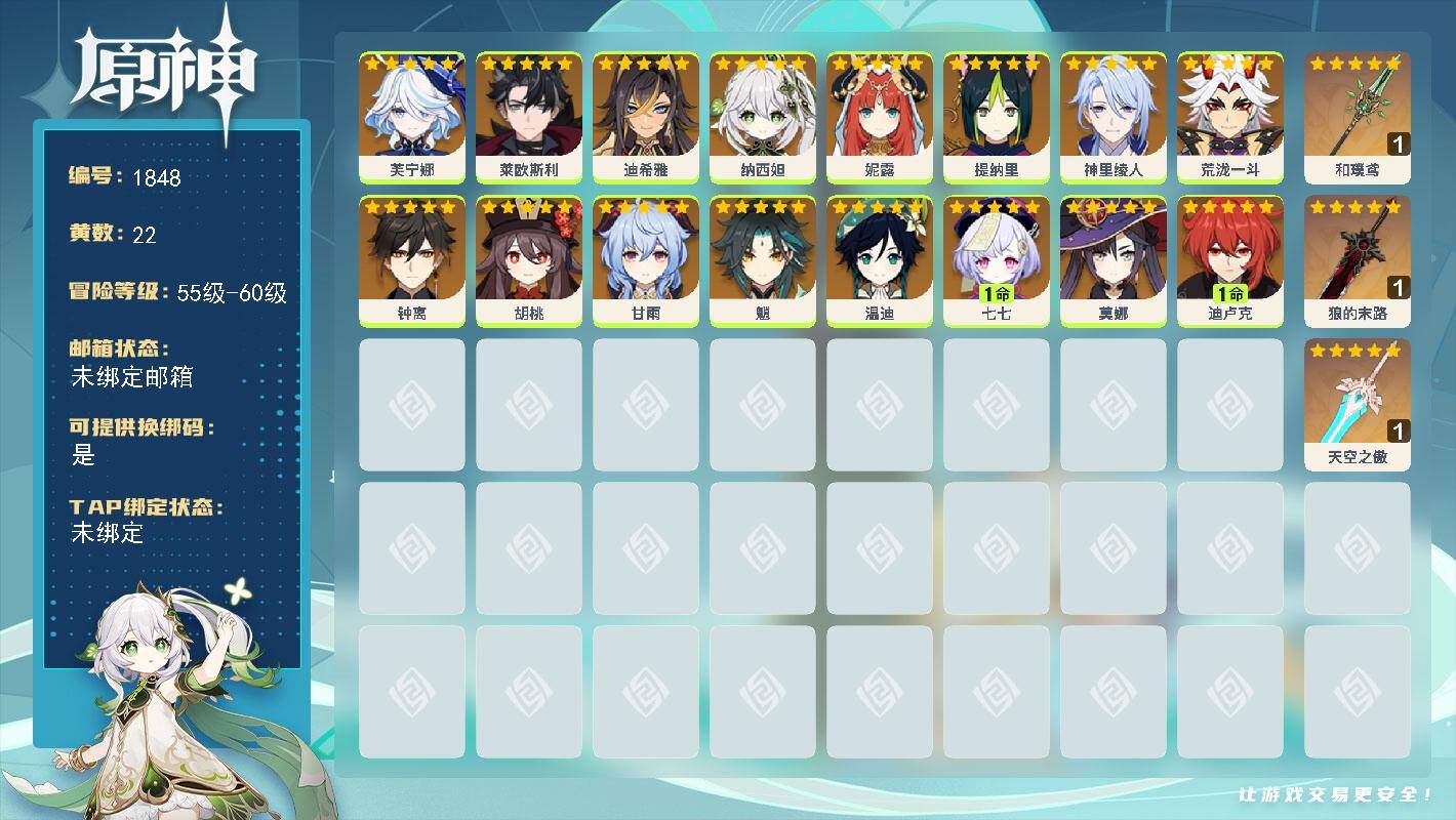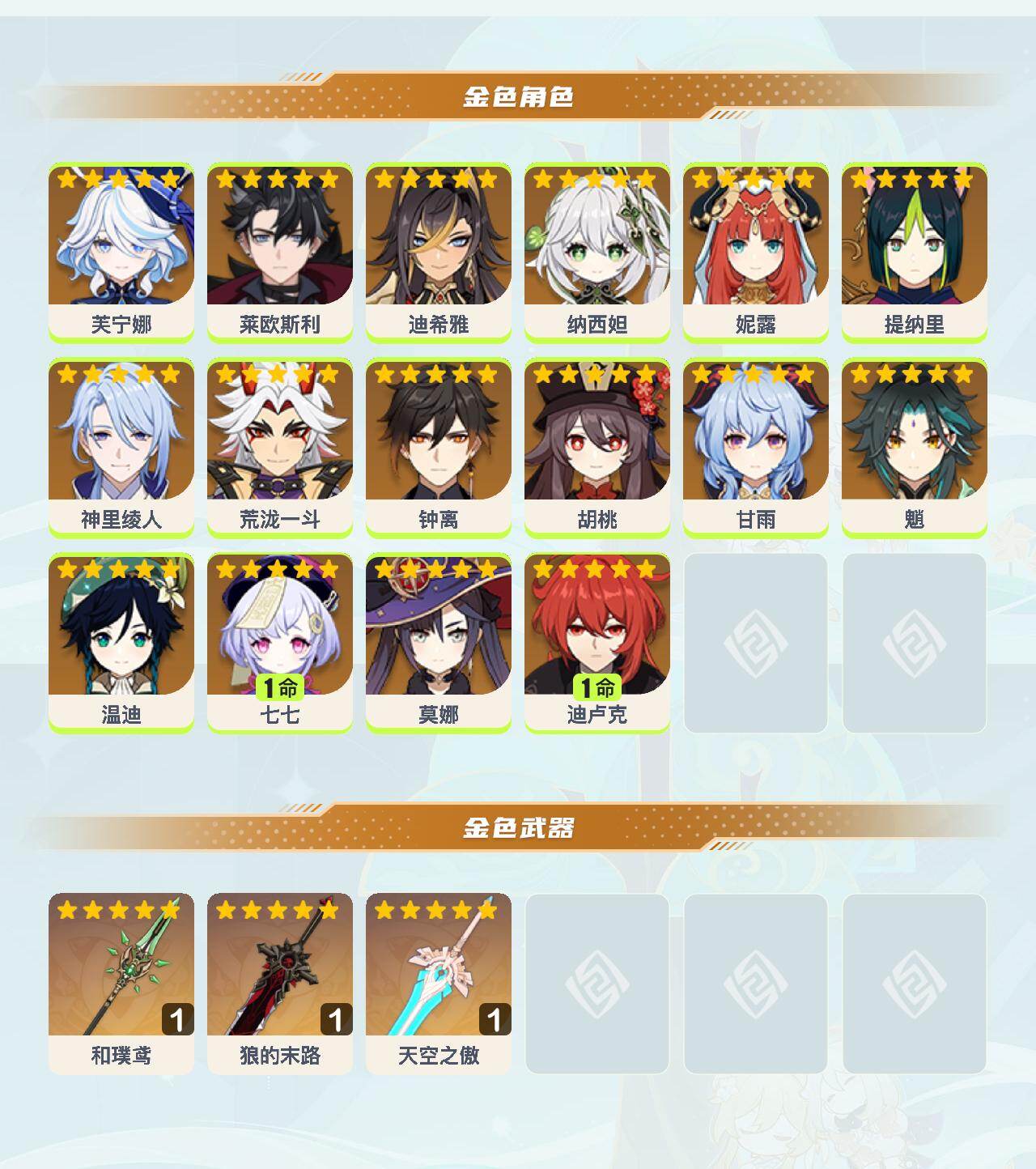 [16524082]57级/22黄/男主/16个五星角色/4个五星武器 0命芙宁娜0命莱欧斯利0命迪希雅0命纳西妲0命妮露0命提纳里0命神里绫人0命荒泷一斗0命钟离0命胡桃0命甘雨0命魈0命温迪1命七七0命莫娜1命迪卢克精1和璞鸢精1狼的末路精1天空之傲