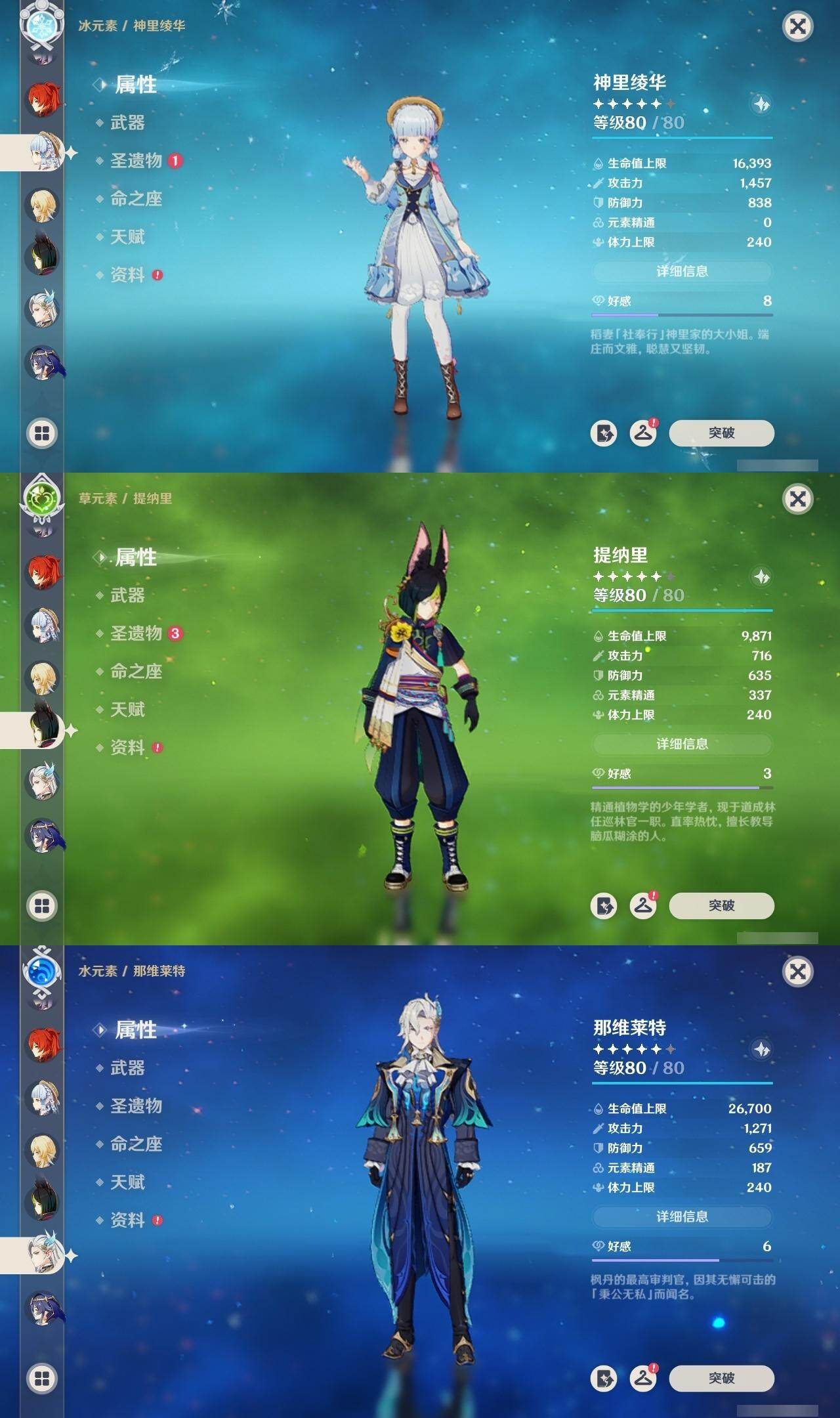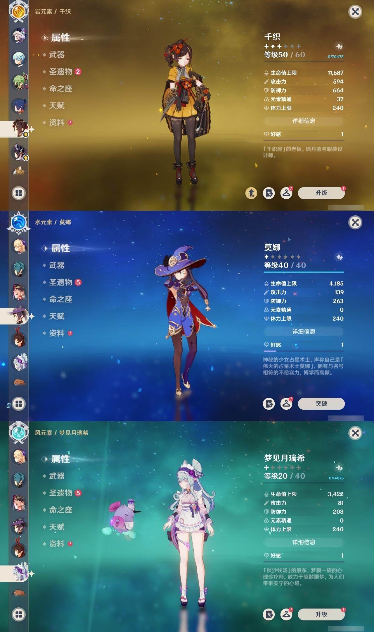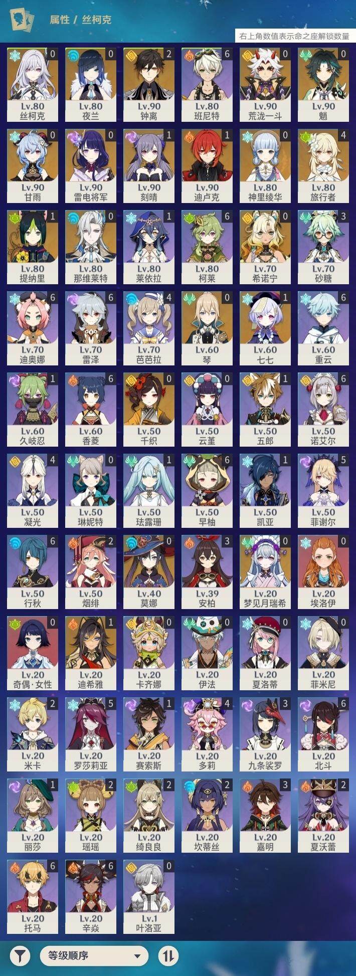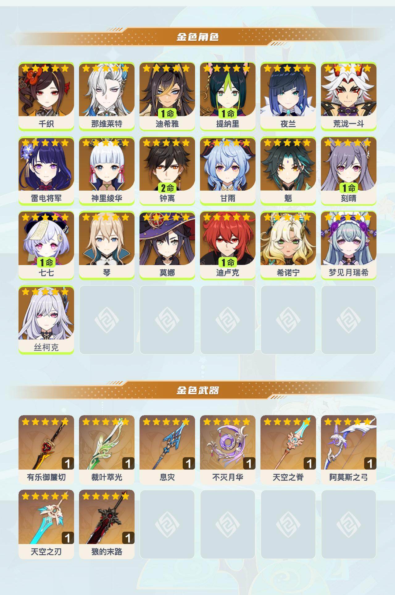 58级/36黄/女主/19个五星角色/10个五星武器 0命千织0命那维莱特1命迪希雅1命提纳里0命夜兰0命荒泷一斗0命雷电将军0命神里绫华2命钟离0命甘雨0命魈1命刻晴1命七七0命琴0命莫娜1命迪卢克0命希诺宁0命梦见月瑞希0命丝柯克精1有乐御簾切精1裁叶萃光精1息灾精1不灭月华精1天空之脊精1阿莫斯之弓精1天空之刃精1狼的末路
