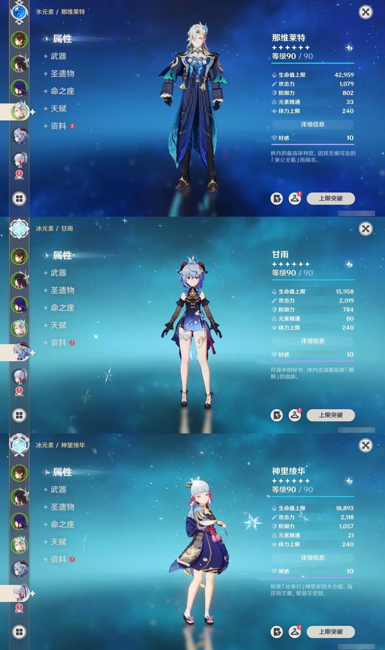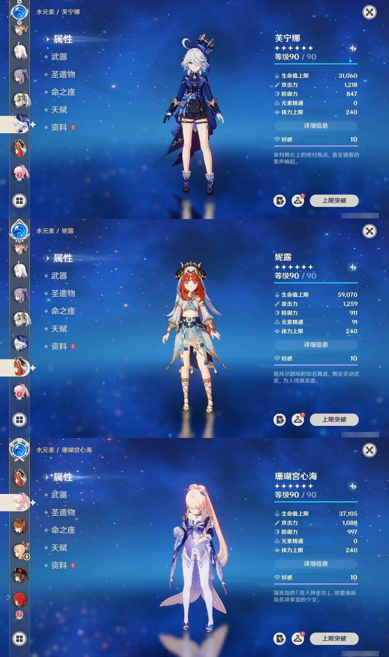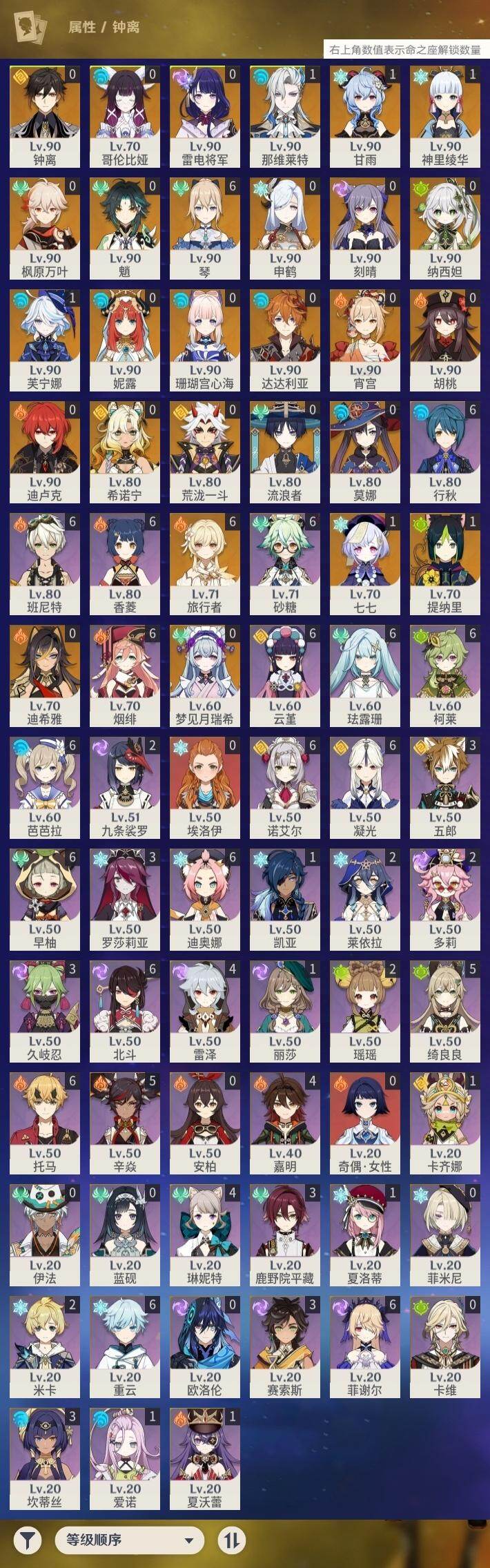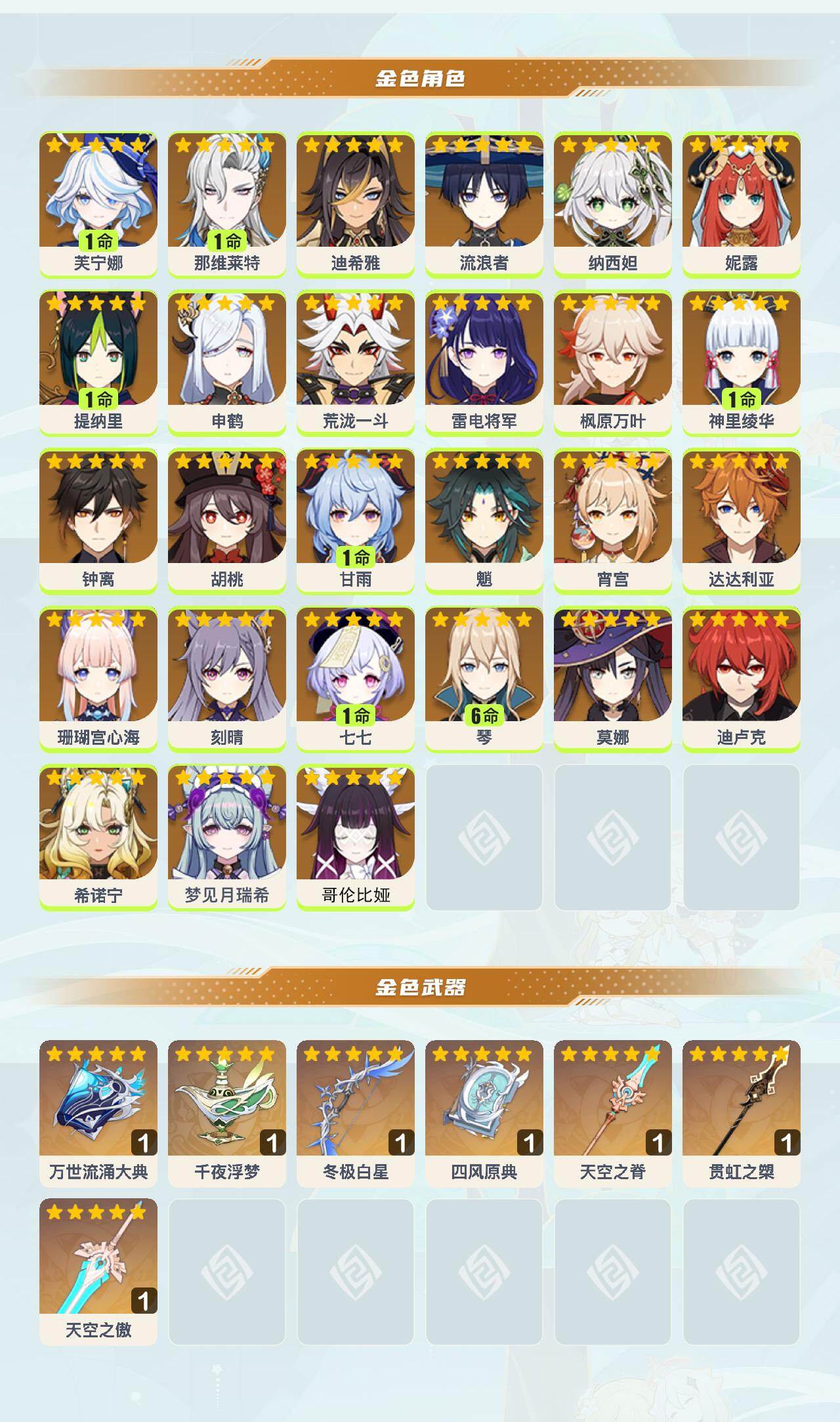 60级/49黄/女主/27个五星角色/10个五星武器 1命芙宁娜1命那维莱特0命迪希雅0命流浪者0命纳西妲0命妮露1命提纳里0命申鹤0命荒泷一斗0命雷电将军0命枫原万叶1命神里绫华0命钟离0命胡桃1命甘雨0命魈0命宵宫0命达达利亚0命珊瑚宫心海0命刻晴1命七七满命琴0命莫娜0命迪卢克0命希诺宁0命梦见月瑞希0命哥伦比娅精1万世流涌大典精1千夜浮梦精1冬极白星精1四风原典精1天空之脊精1贯虹之槊精1天空之傲