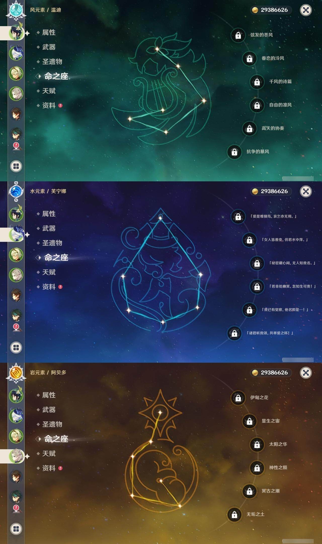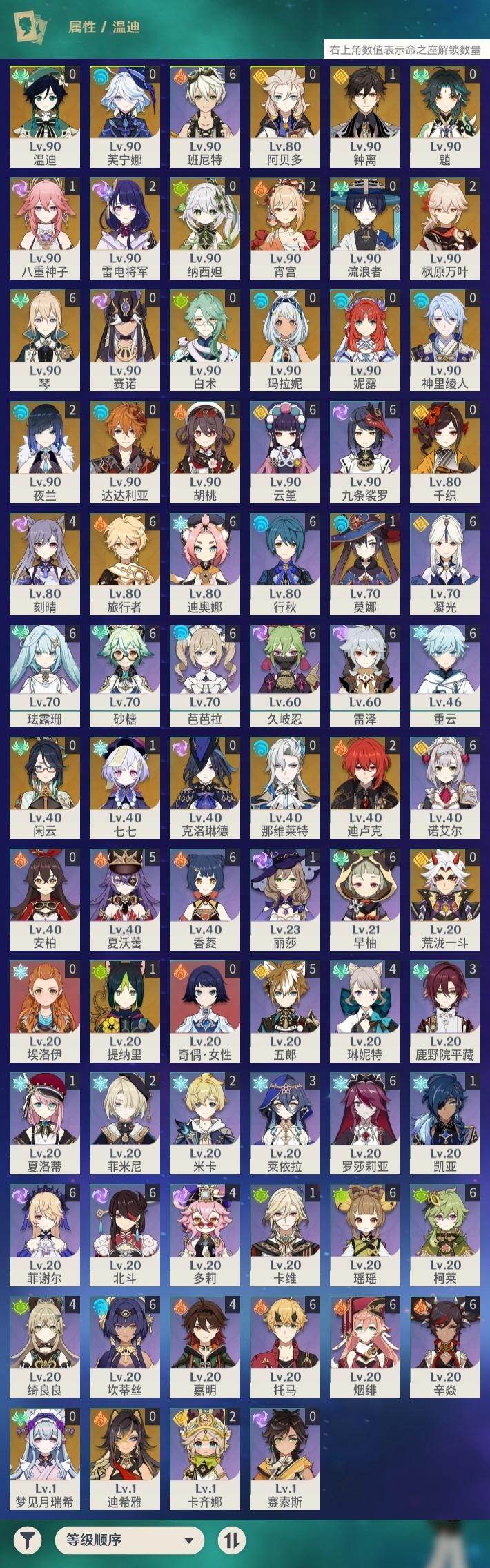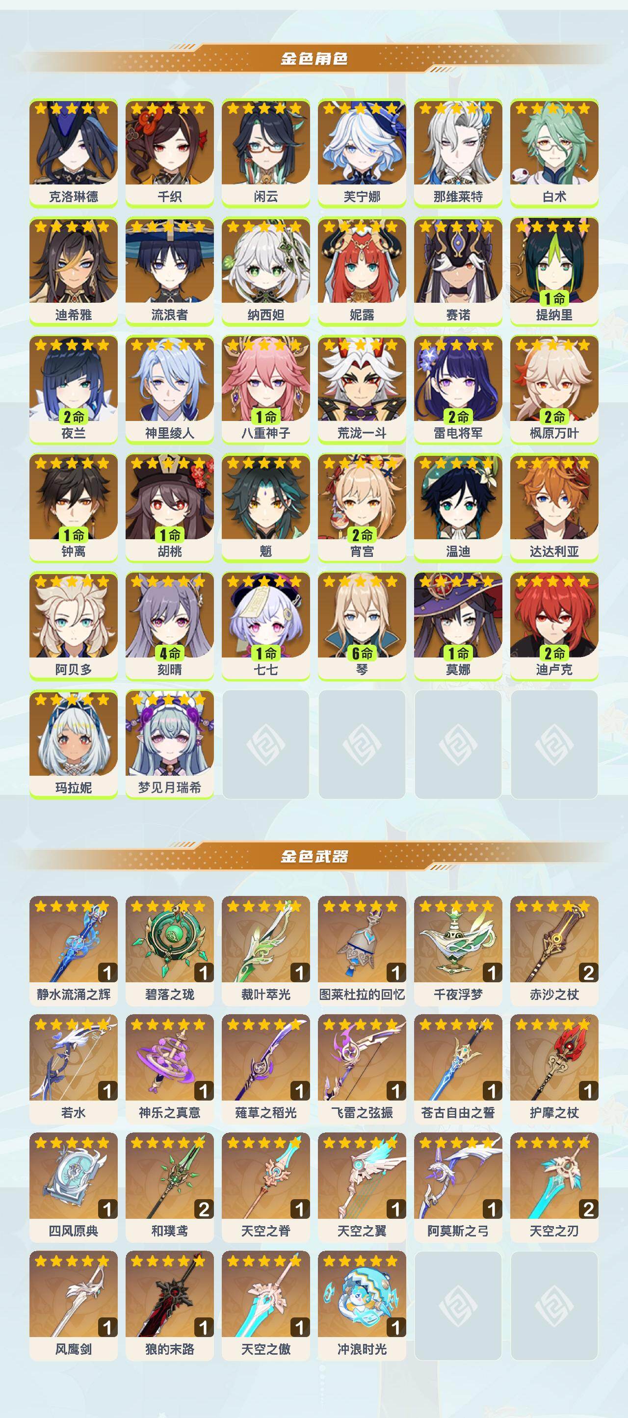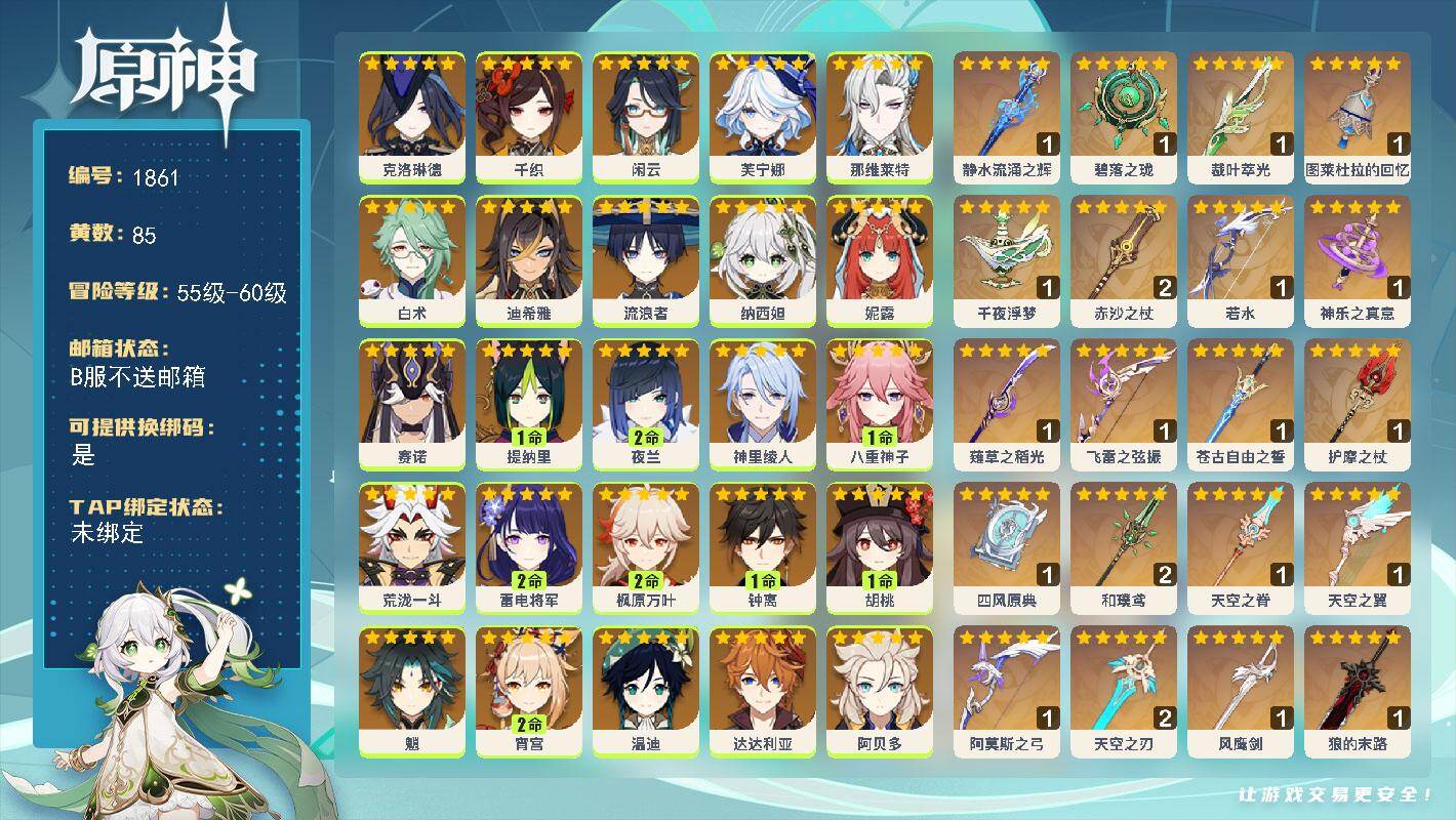 [16530687]60级/85黄/男主/32个五星角色/24个五星武器 0命克洛琳德0命千织0命闲云0命芙宁娜0命那维莱特0命白术0命迪希雅0命流浪者0命纳西妲0命妮露0命赛诺1命提纳里2命夜兰0命神里绫人1命八重神子0命荒泷一斗2命雷电将军2命枫原万叶1命钟离1命胡桃0命魈2命宵宫0命温迪0命达达利亚0命阿贝多4命刻晴1命七七满命琴1命莫娜2命迪卢克0命玛拉妮0命梦见月瑞希精1静水流涌之辉精1碧落之珑精1裁叶萃光精1图莱杜拉的回忆精1千夜浮梦精2赤沙之杖精1若水精1神乐之真意精1薙草之稻光精1飞雷之弦振精1苍古自由之誓精1护摩之杖精1四风原典精2和璞鸢精1天空之脊精1天空之翼精1阿莫斯之弓精2天空之刃精1风鹰剑精1狼的末路精1天空之傲精1冲浪时光