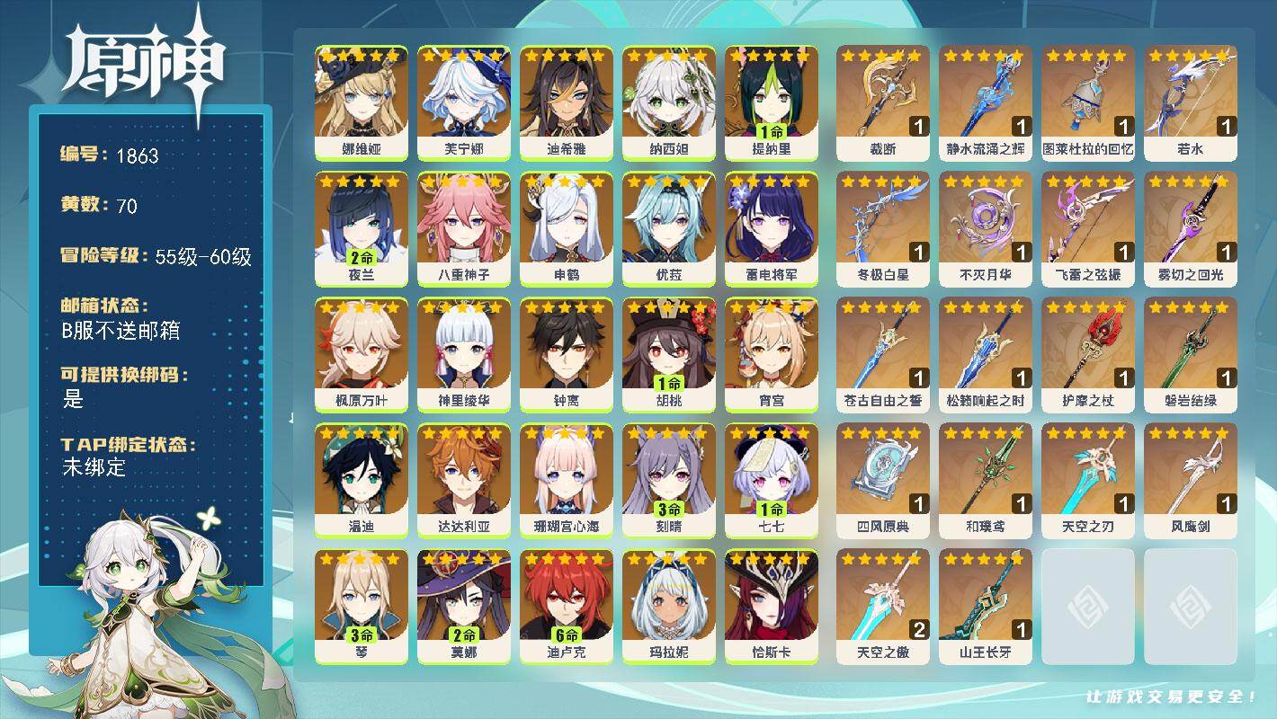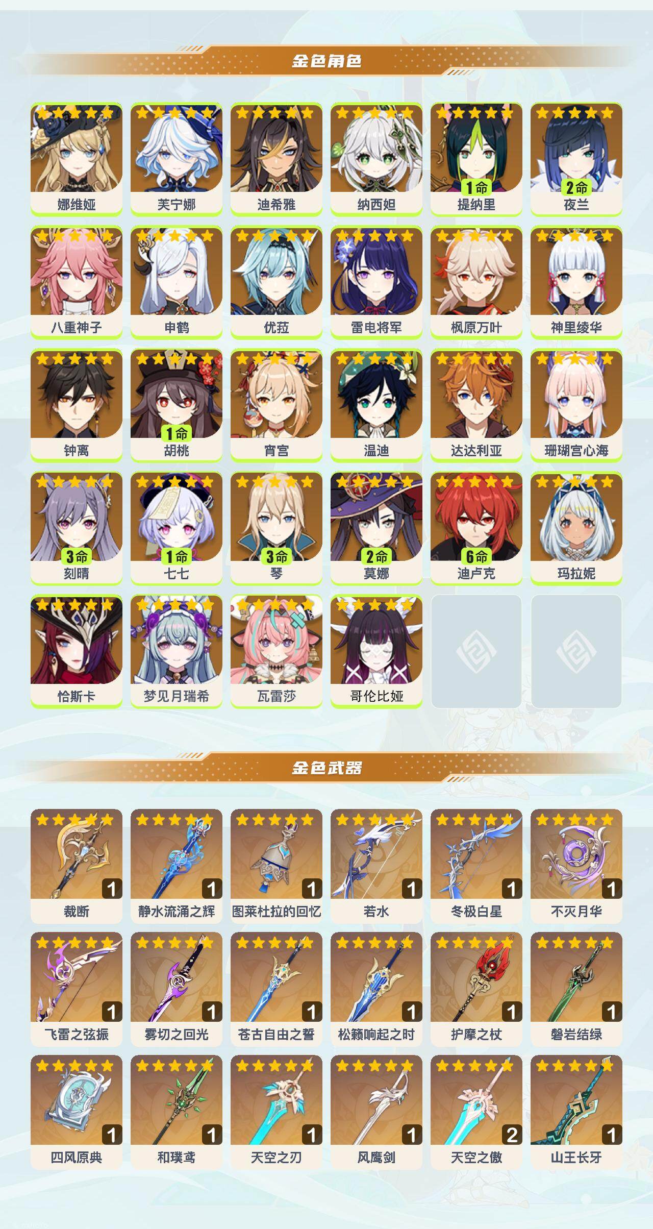 [16531733]60级/70黄/女主/28个五星角色/22个五星武器 0命娜维娅0命芙宁娜0命迪希雅0命纳西妲1命提纳里2命夜兰0命八重神子0命申鹤0命优菈0命雷电将军0命枫原万叶0命神里绫华0命钟离1命胡桃0命宵宫0命温迪0命达达利亚0命珊瑚宫心海3命刻晴1命七七3命琴2命莫娜满命迪卢克0命玛拉妮0命恰斯卡0命梦见月瑞希0命瓦雷莎0命哥伦比娅精1裁断精1静水流涌之辉精1图莱杜拉的回忆精1若水精1冬极白星精1不灭月华精1飞雷之弦振精1雾切之回光精1苍古自由之誓精1松籁响起之时精1护摩之杖精1磐岩结绿精1四风原典精1和璞鸢精1天空之刃精1风鹰剑精2天空之傲精1山王长牙
