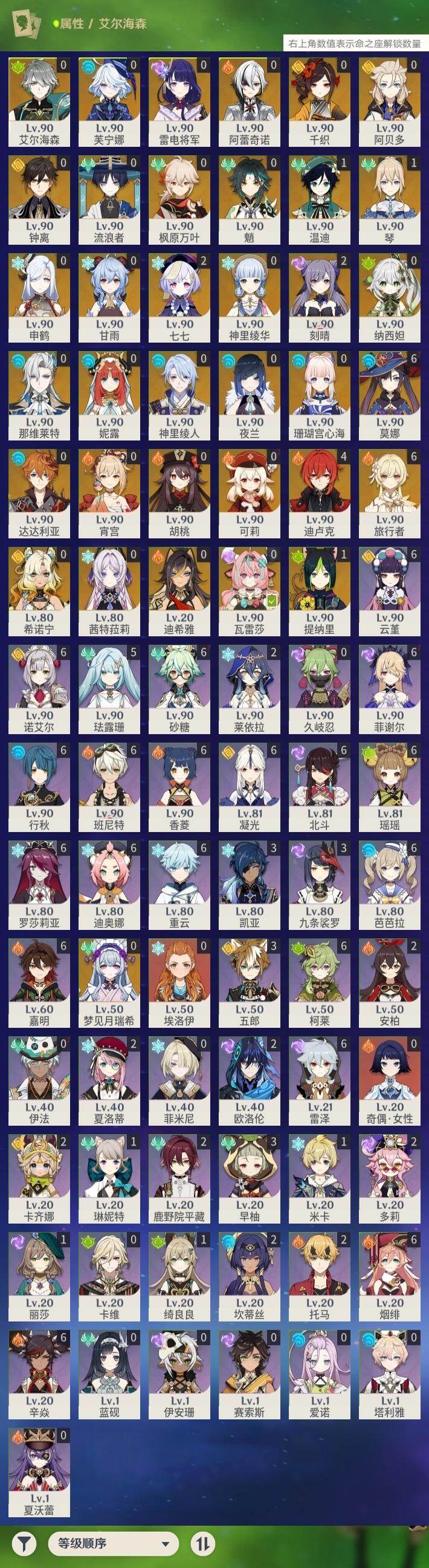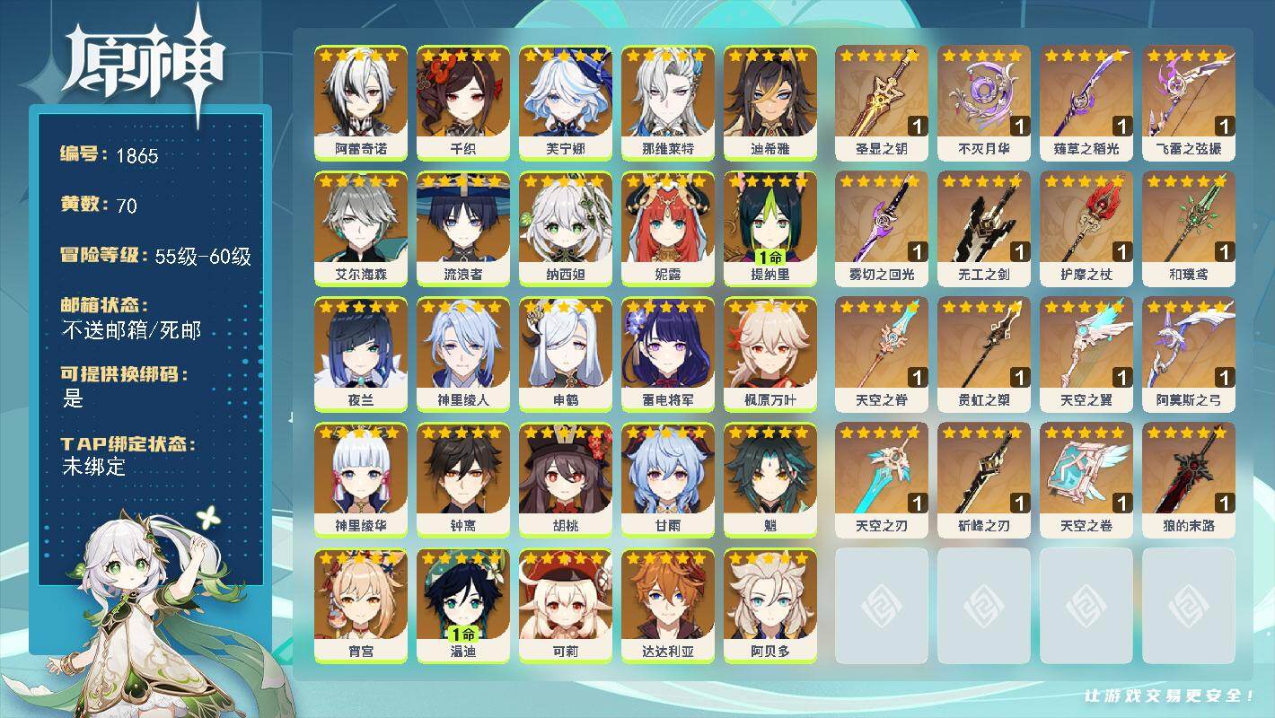[16532031]60级/70黄/女主/35个五星角色/18个五星武器 0命阿蕾奇诺0命千织0命芙宁娜0命那维莱特0命迪希雅0命艾尔海森0命流浪者0命纳西妲0命妮露1命提纳里0命夜兰0命神里绫人0命申鹤0命雷电将军0命枫原万叶0命神里绫华0命钟离0命胡桃0命甘雨0命魈0命宵宫1命温迪0命可莉0命达达利亚0命阿贝多0命珊瑚宫心海2命刻晴2命七七1命琴满命莫娜4命迪卢克0命希诺宁0命茜特菈莉0命梦见月瑞希0命瓦雷莎精1圣显之钥精1不灭月华精1薙草之稻光精1飞雷之弦振精1雾切之回光精1无工之剑精1护摩之杖精1和璞鸢精1天空之脊精1贯虹之槊精1天空之翼精1阿莫斯之弓精1天空之刃精1斫峰之刃精1天空之卷精1狼的末路