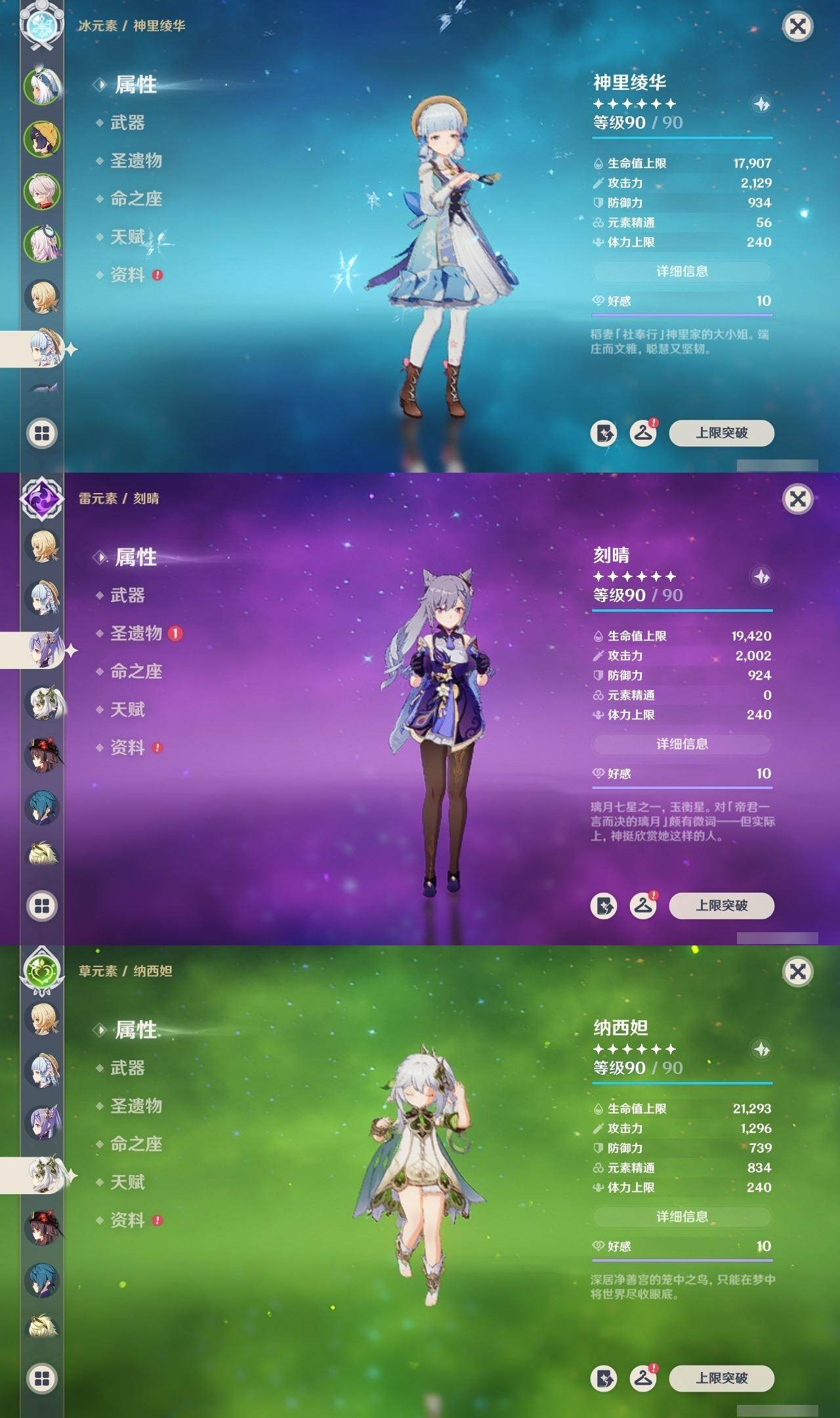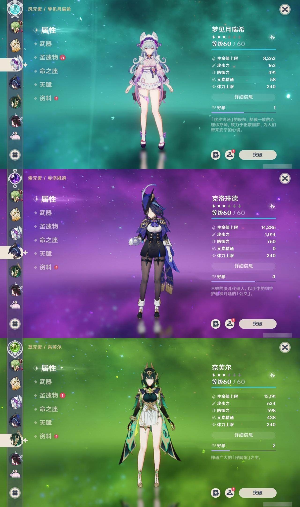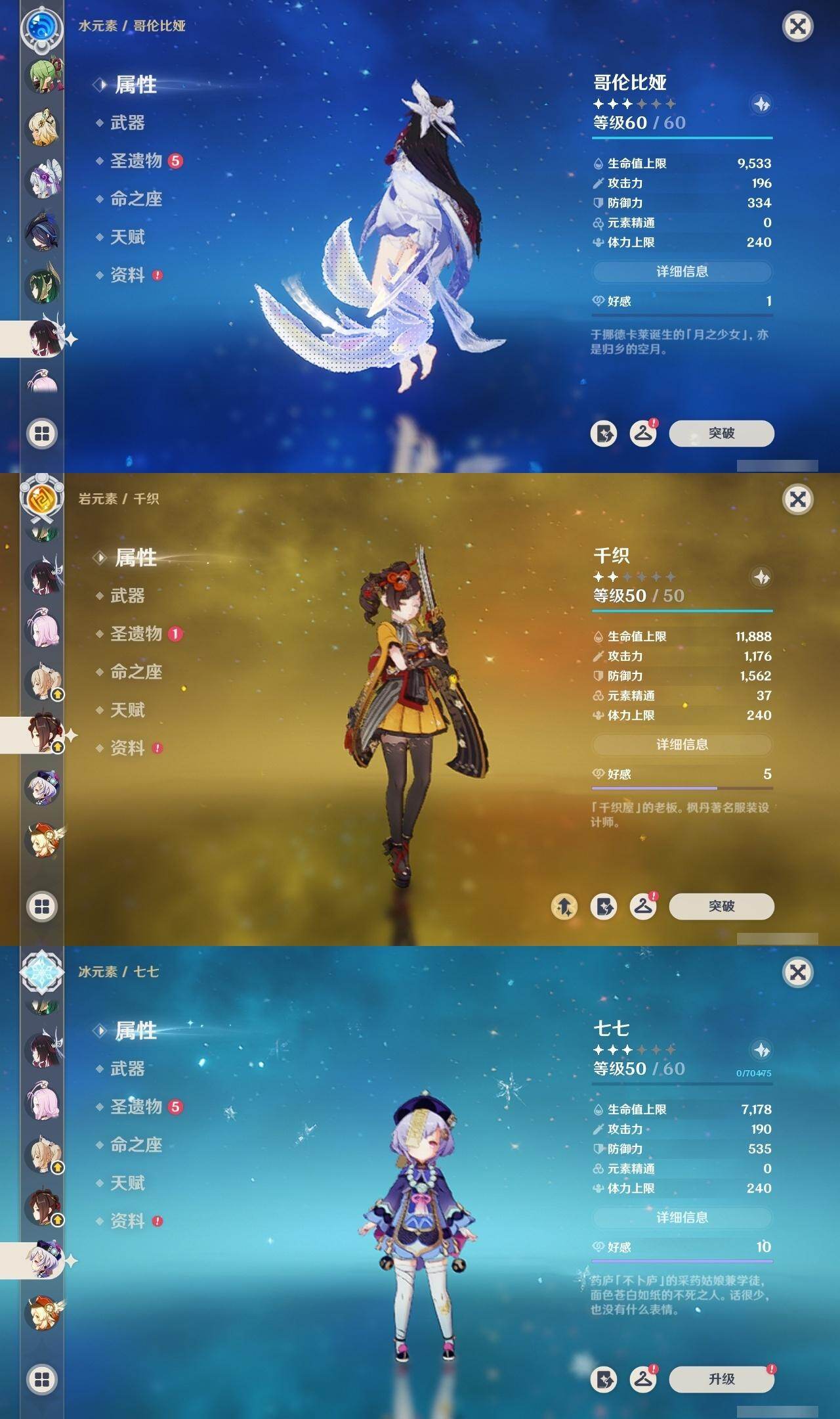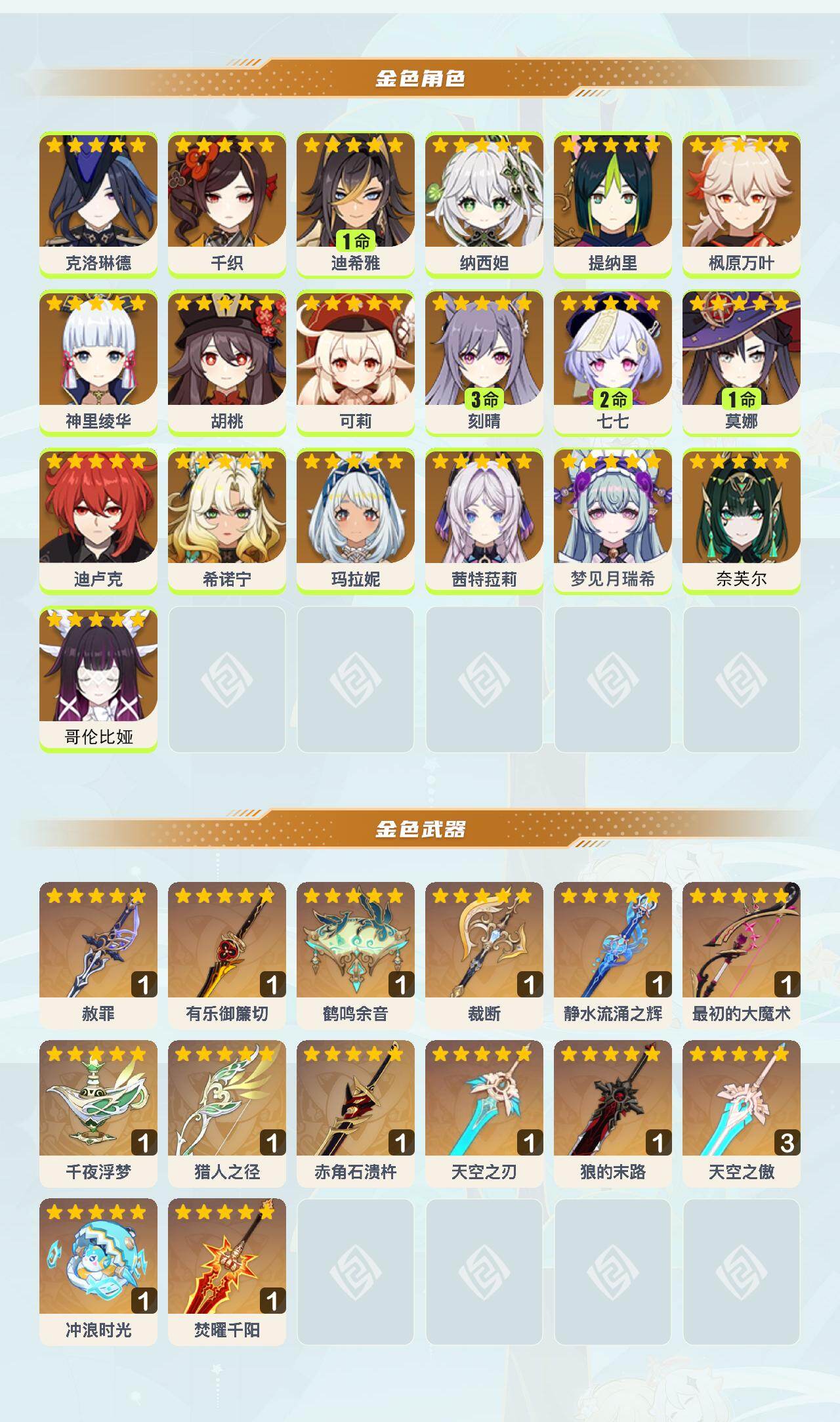 58级/43黄/女主/19个五星角色/15个五星武器 0命克洛琳德0命千织1命迪希雅0命纳西妲0命提纳里0命枫原万叶0命神里绫华0命胡桃0命可莉3命刻晴2命七七1命莫娜0命迪卢克0命希诺宁0命玛拉妮0命茜特菈莉0命梦见月瑞希0命奈芙尔0命哥伦比娅精1赦罪精1有乐御簾切精1鹤鸣余音精1裁断精1静水流涌之辉精1最初的大魔术精1千夜浮梦精1猎人之径精1赤角石溃杵精1天空之刃精1狼的末路精3天空之傲精1冲浪时光精1焚曜千阳
