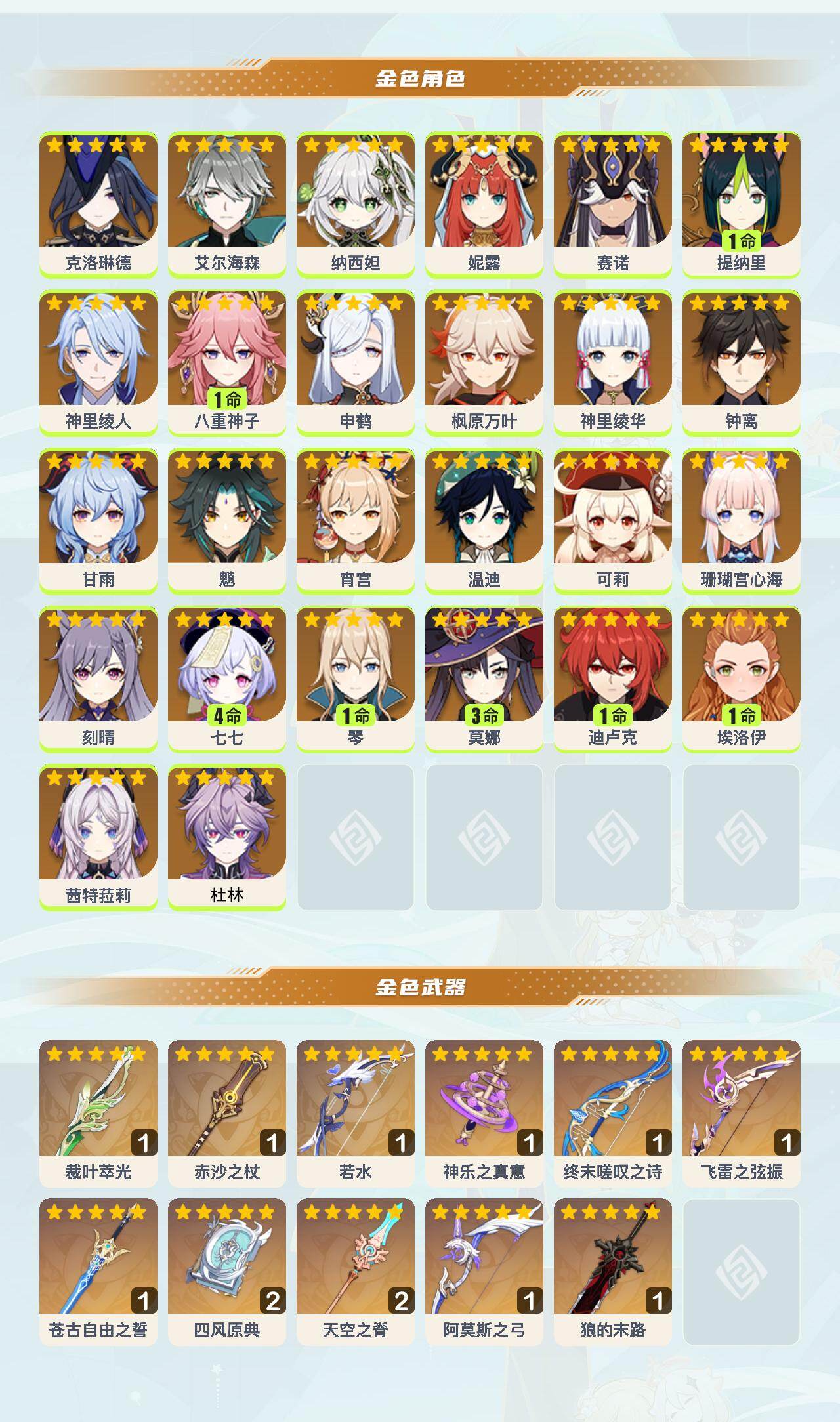 【ysa1044】60级/50黄/女主/26个五星角色/11个五星武器/0命神里绫华/1命八重神子/0命钟离/0命魈/0命温迪/0命申鹤/0命甘雨/0命赛诺/0命纳西妲/0命枫原万叶/0命茜特菈莉/0命艾尔海森/0命神里绫人/0命杜林/0命宵宫/0命可莉/0命克洛琳德/1命提纳里/0命珊瑚宫心海/3命莫娜/1命迪卢克/0命妮露/4命七七/1命琴/0命埃洛伊/0命刻晴/精1飞雷之弦振/精1阿莫斯之弓/精1神乐之真意/精2四风原典/精1赤沙之杖/精1裁叶萃光/精1苍古自由之誓/精1若水/精1终末嗟叹之诗/精1狼的末路/精2天空之脊