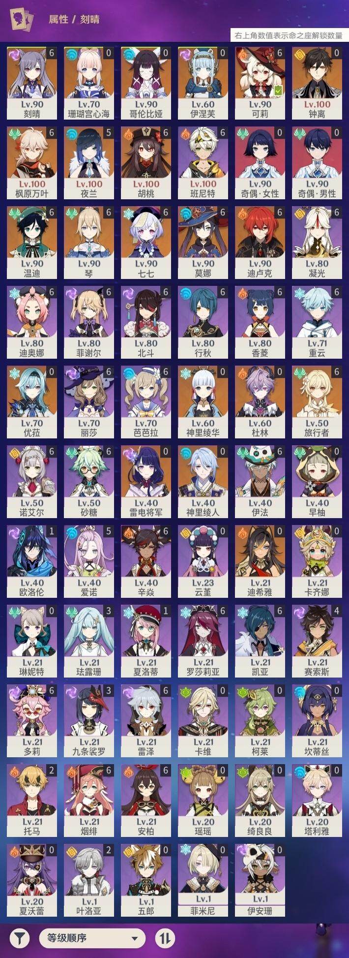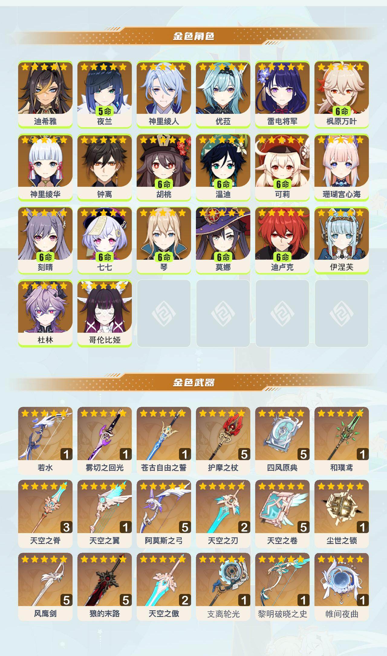 58级/148黄/女主/20个五星角色/26个五星武器 0命迪希雅5命夜兰0命神里绫人0命优菈0命雷电将军满命枫原万叶0命神里绫华0命钟离满命胡桃满命温迪满命可莉0命珊瑚宫心海满命刻晴满命七七满命琴满命莫娜满命迪卢克0命伊涅芙0命杜林0命哥伦比娅精1若水精1雾切之回光精1苍古自由之誓精5护摩之杖精5四风原典精1和璞鸢精3天空之脊精1天空之翼精5阿莫斯之弓精2天空之刃精5天空之卷精1尘世之锁精5风鹰剑精5狼的末路精2天空之傲精1支离轮光精1黎明破晓之史精1帷间夜曲