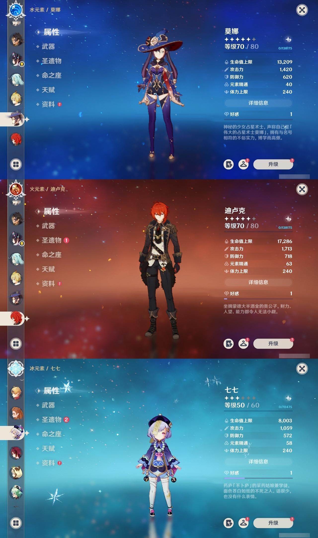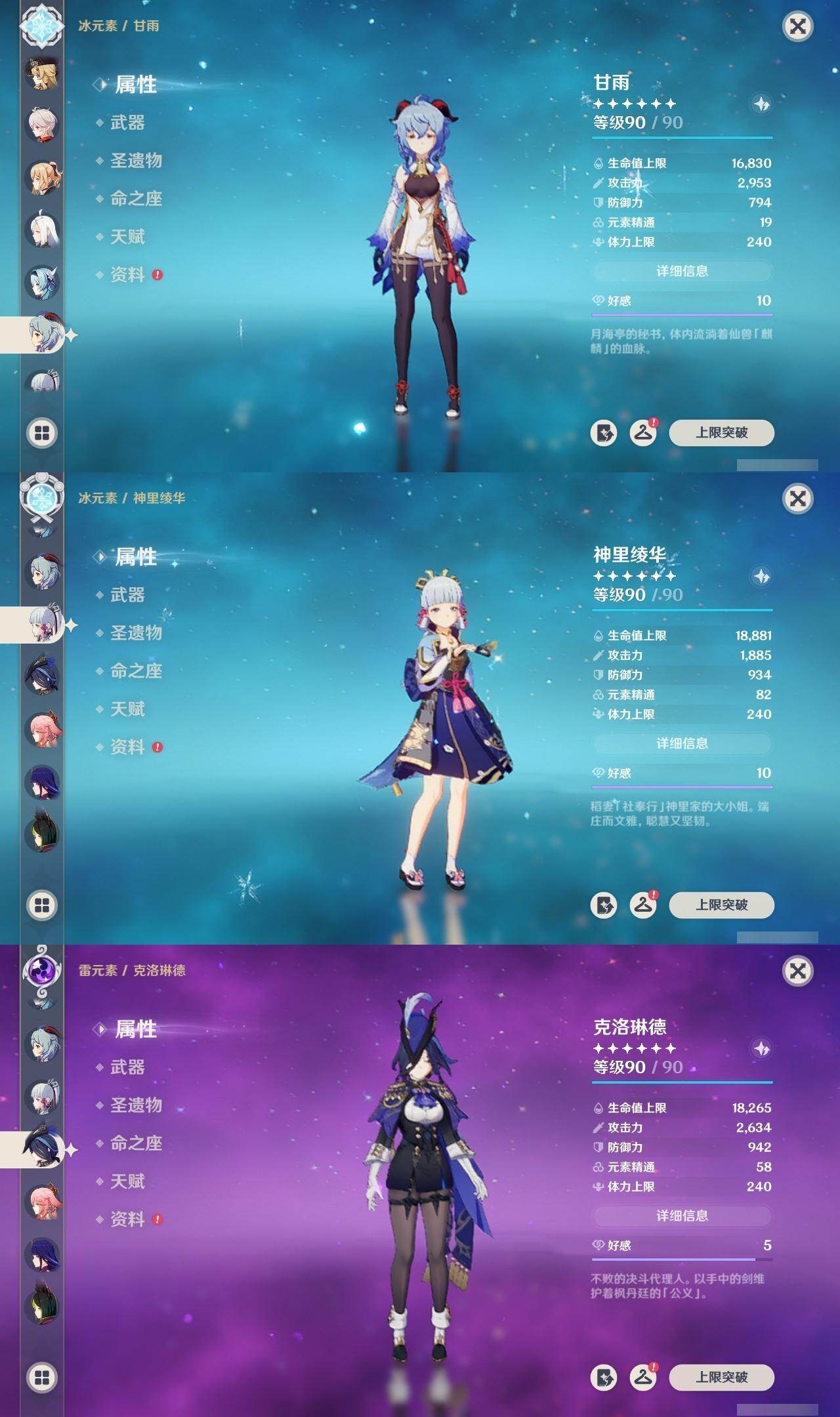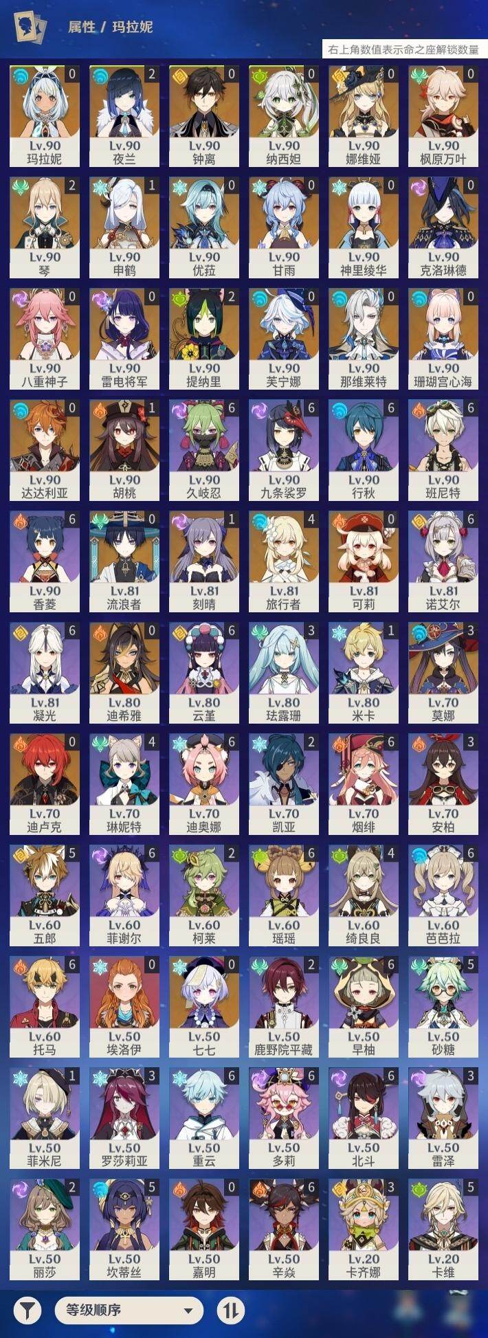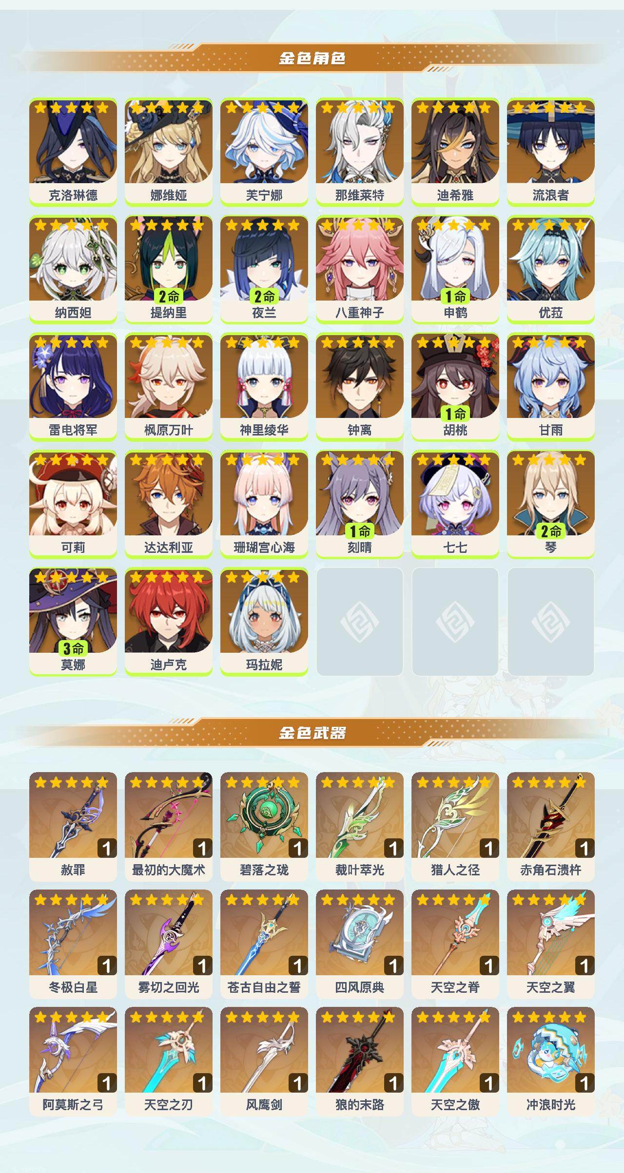 60级/60黄/女主/27个五星角色/21个五星武器 0命克洛琳德0命娜维娅0命芙宁娜0命那维莱特0命迪希雅0命流浪者0命纳西妲2命提纳里2命夜兰0命八重神子1命申鹤0命优菈0命雷电将军0命枫原万叶0命神里绫华0命钟离1命胡桃0命甘雨0命可莉0命达达利亚0命珊瑚宫心海1命刻晴0命七七2命琴3命莫娜0命迪卢克0命玛拉妮精1赦罪精1最初的大魔术精1碧落之珑精1裁叶萃光精1猎人之径精1赤角石溃杵精1冬极白星精1雾切之回光精1苍古自由之誓精1四风原典精1天空之脊精1天空之翼精1阿莫斯之弓精1天空之刃精1风鹰剑精1狼的末路精1天空之傲精1冲浪时光