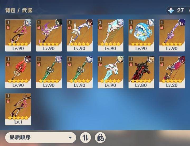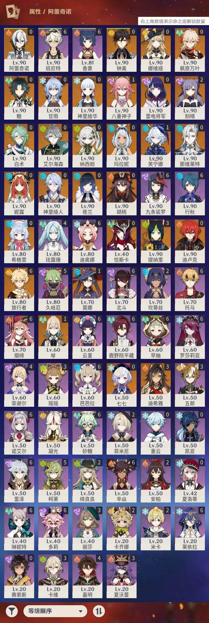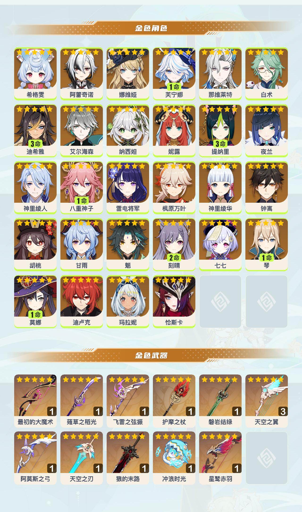 60级/55黄/男主/28个五星角色/13个五星武器 0命希格雯0命阿蕾奇诺0命娜维娅1命芙宁娜0命那维莱特0命白术3命迪希雅0命艾尔海森0命纳西妲0命妮露3命提纳里0命夜兰0命神里绫人1命八重神子0命雷电将军0命枫原万叶0命神里绫华0命钟离0命胡桃0命甘雨0命魈2命刻晴0命七七1命琴1命莫娜0命迪卢克0命玛拉妮0命恰斯卡精1最初的大魔术精1薙草之稻光精1飞雷之弦振精1护摩之杖精1磐岩结绿精3天空之翼精1阿莫斯之弓精1天空之刃精1狼的末路精1冲浪时光精1星鹫赤羽