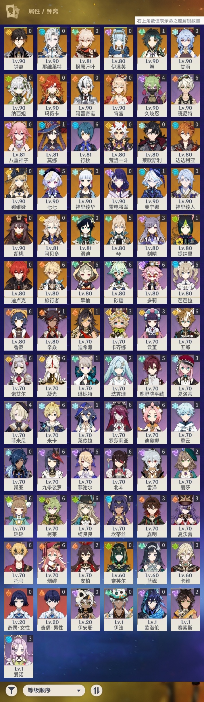 【原神】【lyys11606】冒险等级:60,五星数量:45,五星角色:七七 5命琴 5命刻晴 3命迪希雅 1命芙宁娜 1命魈 1命莫娜 1命提纳里 1命神里绫华温迪玛薇卡宵宫钟离荒泷一斗达达利亚八重神子神里绫人阿贝多那维莱特莱欧斯利娜维娅阿蕾奇诺伊涅芙纳西妲奈芙尔迪卢克枫原万叶甘雨胡桃雷电将军__五星武器:和璞鸢 4精四风原典 2精万世流涌大典静水流涌之辉赤月之形风鹰剑护摩之杖狼的末路雾切之回光薙草之稻光神乐之真意贯虹之槊若水__四星角色:班尼特 6命行秋 6命九条裟罗 6命香菱 6命凝光 6命迪奥娜 6命砂糖 6命绮良良 6命瑶瑶 6命莱依拉 6命米卡 6命多莉 6命柯莱 6命芭芭拉 6命早柚 6命托马 6命五郎 6命烟绯 6命重云 6命诺艾尔 6命罗莎莉亚 6命雷泽 6命菲谢尔 6命北斗 6命鹿野院平藏 5命坎蒂丝 5命久岐忍 4命菲米尼 4命卡齐娜 3命云堇 3命夏洛蒂 3命夏沃蕾 3命嘉明 3命爱诺 3命珐露珊 2命赛索斯 2命辛焱 1命琳妮特 1命奇偶·女性奇偶·男性卡维欧洛伦蓝砚伊法伊安珊