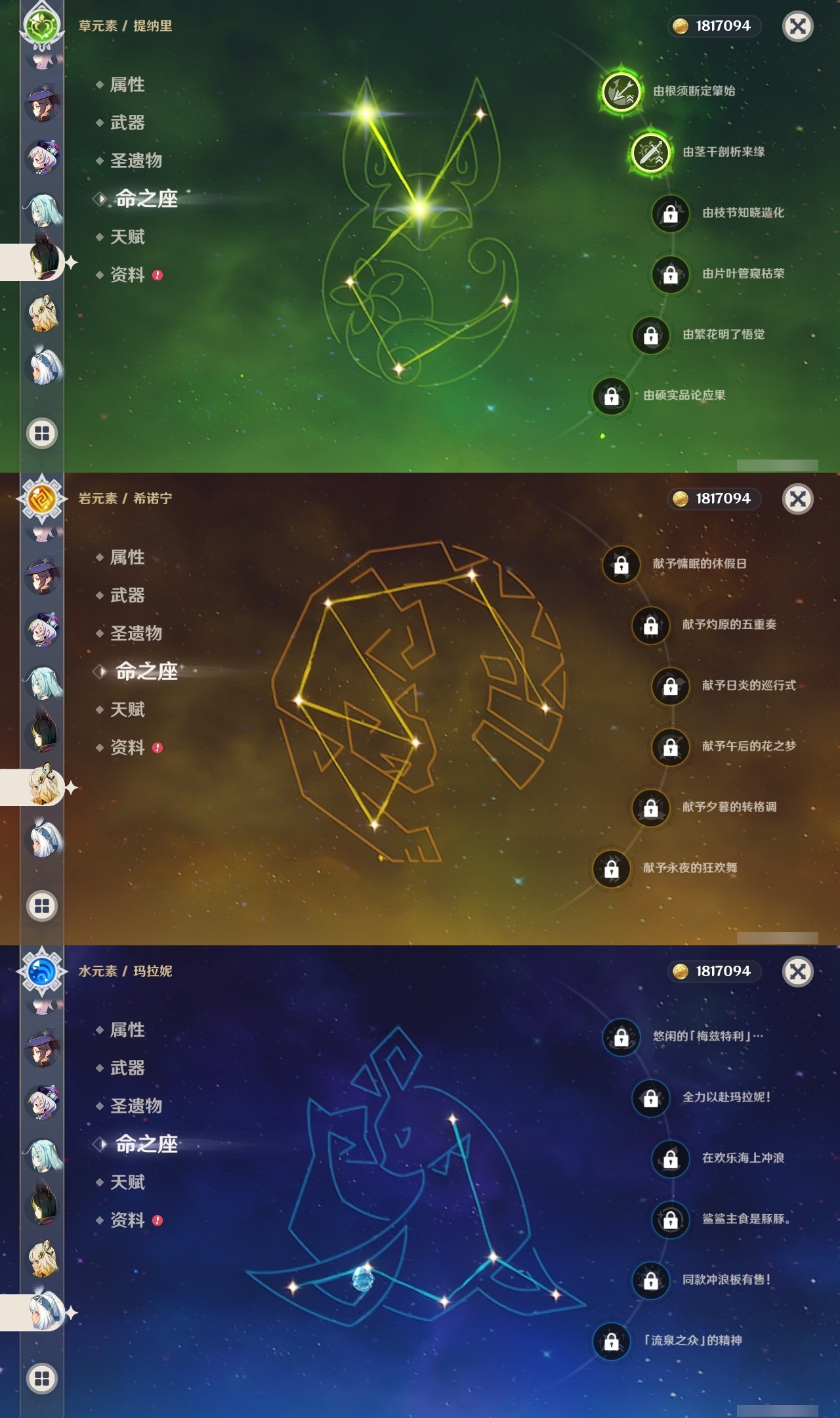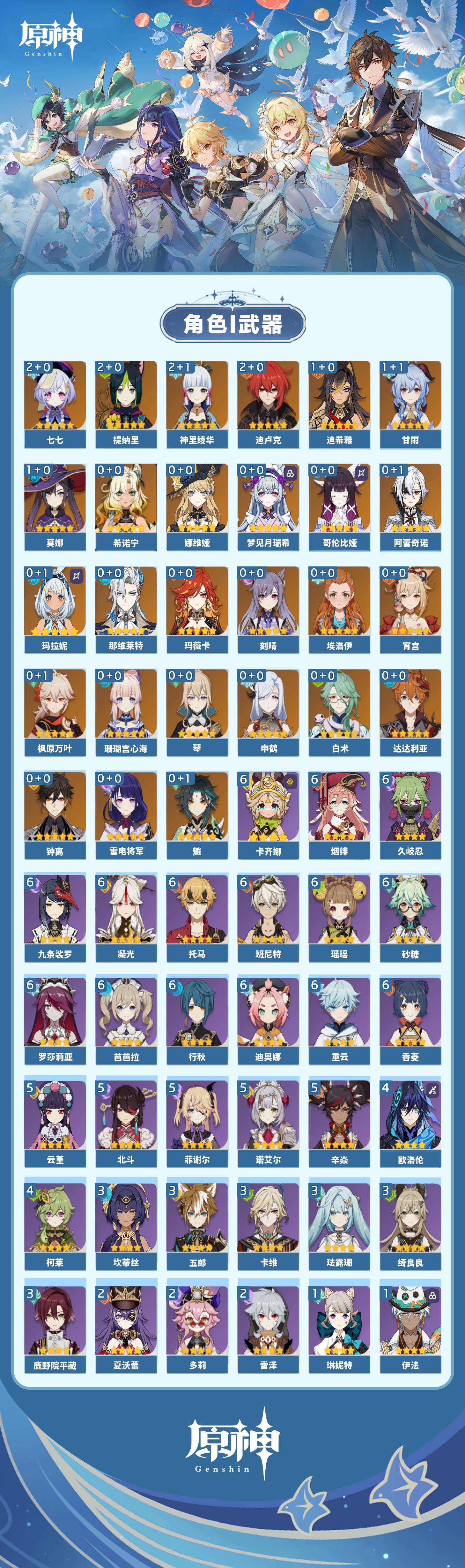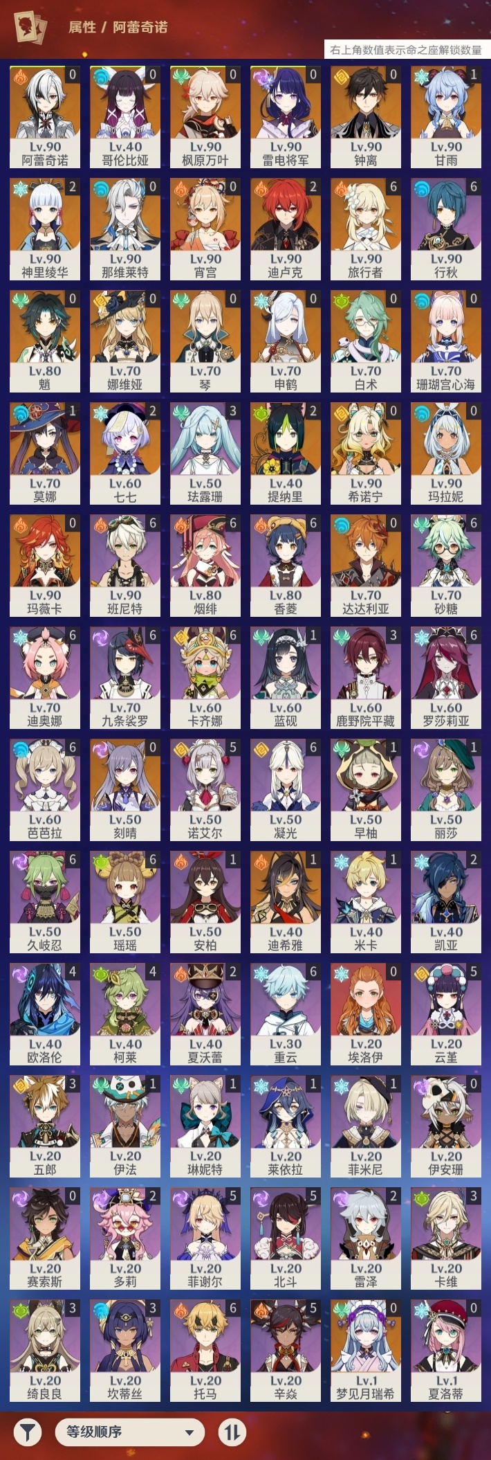 【原神】【lyys11611】冒险等级:59,五星数量:37,五星角色:迪卢克 2命七七 2命神里绫华 2命提纳里 2命迪希雅 1命甘雨 1命莫娜 1命玛拉妮琴珊瑚宫心海希诺宁白术玛薇卡宵宫钟离达达利亚梦见月瑞希申鹤那维莱特娜维娅阿蕾奇诺哥伦比娅枫原万叶魈刻晴雷电将军__五星武器:冲浪时光赤月之形阿莫斯之弓苍古自由之誓风鹰剑和璞鸢四风原典天空之脊天空之卷雾切之回光__四星角色:卡齐娜 6命班尼特 6命行秋 6命九条裟罗 6命香菱 6命久岐忍 6命凝光 6命迪奥娜 6命砂糖 6命瑶瑶 6命芭芭拉 6命托马 6命烟绯 6命重云 6命罗莎莉亚 6命云堇 5命辛焱 5命诺艾尔 5命菲谢尔 5命北斗 5命柯莱 4命欧洛伦 4命鹿野院平藏 3命珐露珊 3命绮良良 3命坎蒂丝 3命卡维 3命五郎 3命多莉 2命雷泽 2命夏沃蕾 2命莱依拉 1命米卡 1命蓝砚 1命早柚 1命菲米尼 1命琳妮特 1命伊法 1命埃洛伊夏洛蒂伊安珊赛索斯