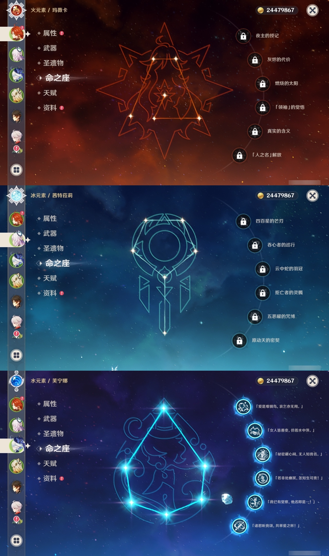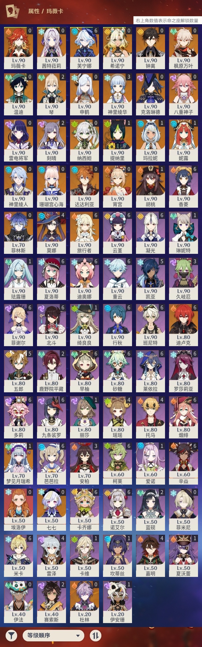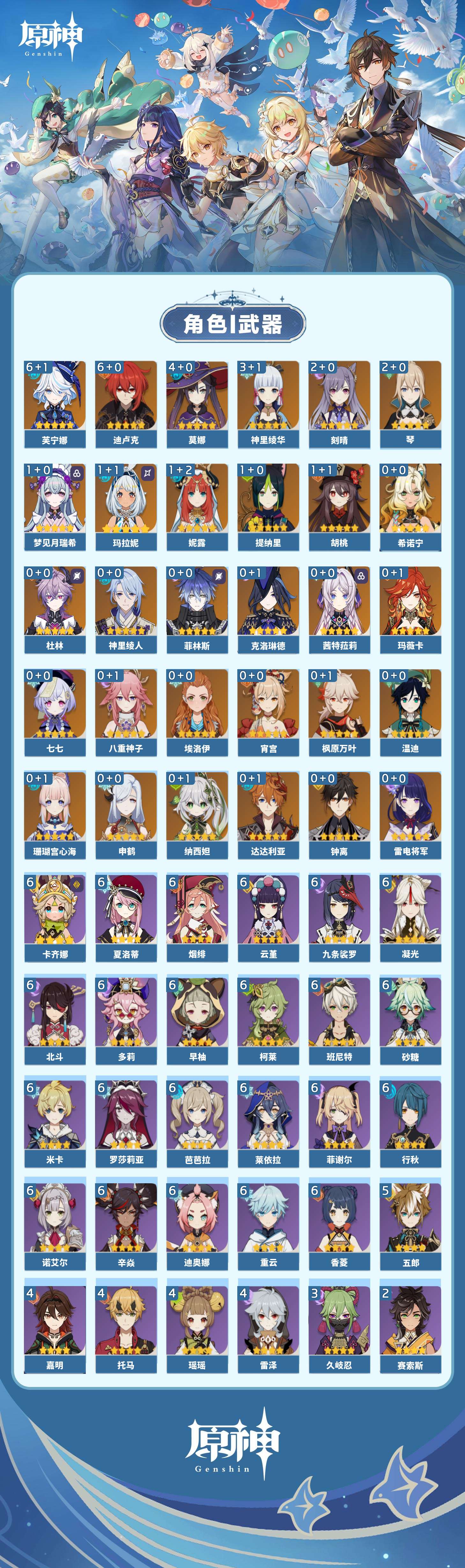 【原神】【lyys11578】冒险等级:60,五星数量:52,五星角色:芙宁娜 6命迪卢克 6命莫娜 4命神里绫华 3命刻晴 2命琴 2命玛拉妮 1命梦见月瑞希 1命胡桃 1命提纳里 1命妮露 1命七七珊瑚宫心海希诺宁温迪玛薇卡茜特菈莉宵宫钟离达达利亚申鹤八重神子神里绫人纳西妲菲林斯杜林枫原万叶克洛琳德雷电将军__五星武器:圣显之钥 2精冲浪时光碧落之珑焚曜千阳静水流涌之辉不灭月华苍古自由之誓风鹰剑和璞鸢护摩之杖磐岩结绿四风原典天空之傲天空之脊天空之卷天空之刃天空之翼雾切之回光冬极白星神乐之真意千夜浮梦赦罪__四星角色:卡齐娜 6命班尼特 6命行秋 6命九条裟罗 6命香菱 6命凝光 6命迪奥娜 6命砂糖 6命莱依拉 6命米卡 6命多莉 6命柯莱 6命芭芭拉 6命云堇 6命早柚 6命烟绯 6命重云 6命辛焱 6命诺艾尔 6命罗莎莉亚 6命菲谢尔 6命北斗 6命夏洛蒂 6命五郎 5命瑶瑶 4命托马 4命雷泽 4命嘉明 4命久岐忍 3命鹿野院平藏 2命蓝砚 2命赛索斯 2命珐露珊 1命绮良良 1命坎蒂丝 1命卡维 1命琳妮特 1命夏沃蕾 1命伊安珊 1命爱诺 1命埃洛伊菲米尼伊法