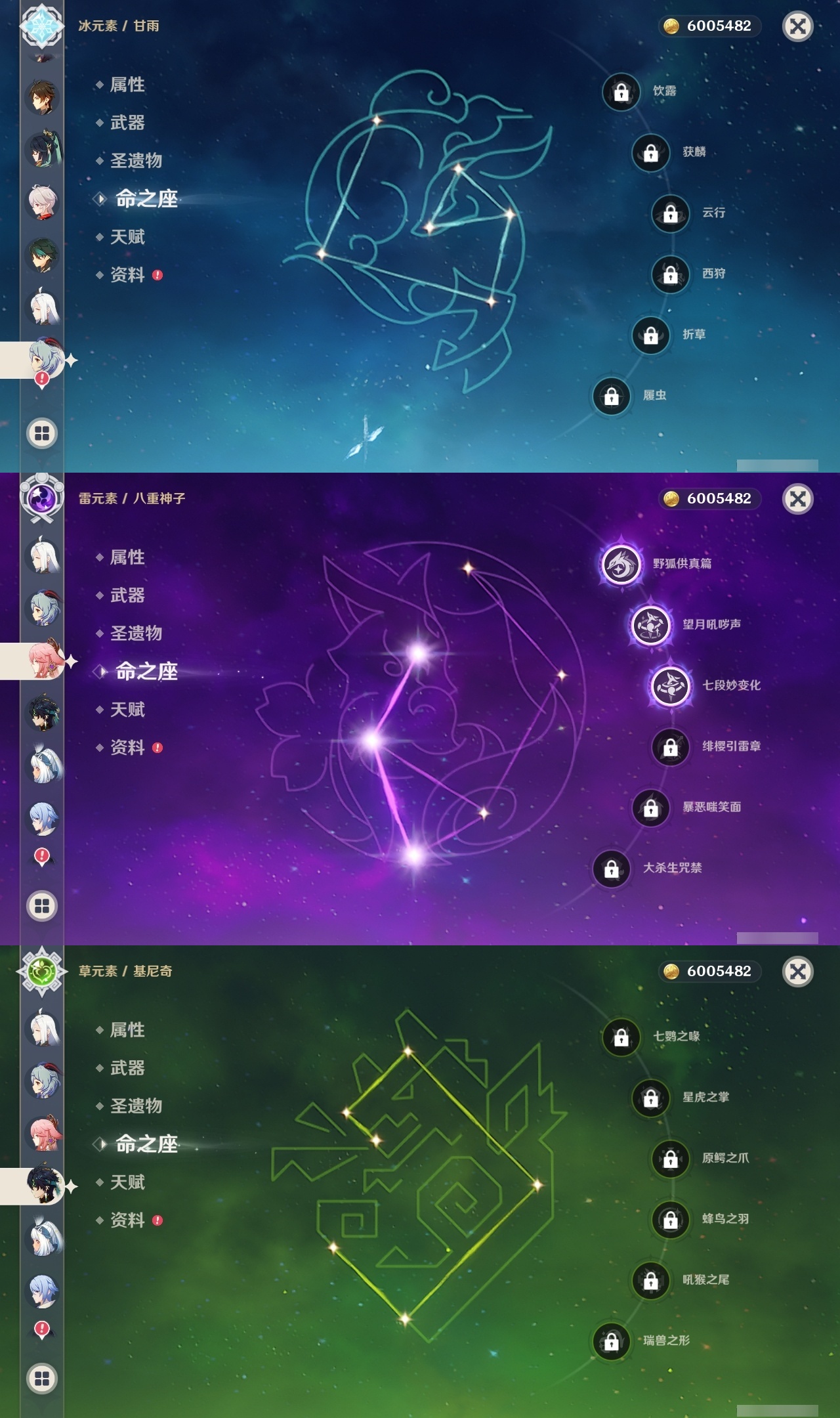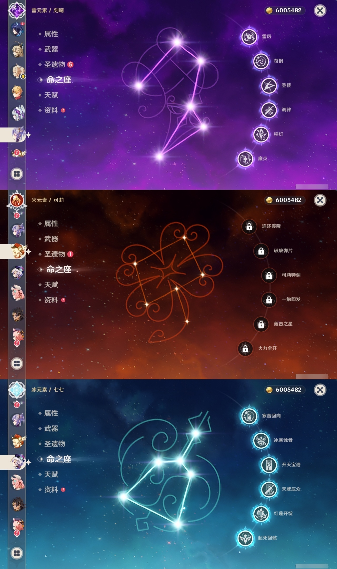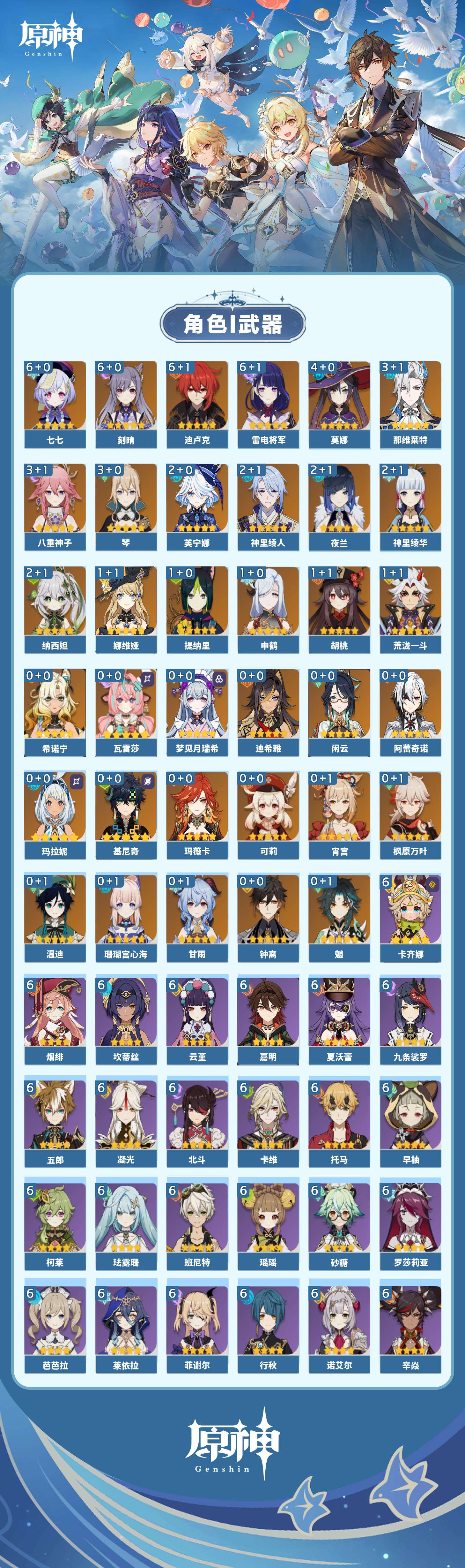 【原神】满命,冒险等级:60,五星数量:59,五星角色:迪卢克 6命刻晴 6命雷电将军 6命七七 6命莫娜 4命那维莱特 3命琴 3命八重神子 3命芙宁娜 2命神里绫华 2命神里绫人 2命夜兰 2命纳西妲 2命娜维娅 1命胡桃 1命荒泷一斗 1命申鹤 1命提纳里 1命玛拉妮基尼奇珊瑚宫心海希诺宁温迪玛薇卡宵宫迪希雅钟离梦见月瑞希瓦雷莎闲云阿蕾奇诺枫原万叶甘雨魈可莉__五星武器:天空之翼 3精风鹰剑 2精万世流涌大典裁断阿莫斯之弓不灭月华苍古自由之誓飞雷之弦振和璞鸢护摩之杖狼的末路天空之傲天空之脊天空之刃无工之剑雾切之回光薙草之稻光终末嗟叹之诗斫峰之刃赤角石溃杵神乐之真意波乱月白经津若水千夜浮梦__四星角色:卡齐娜 6命班尼特 6命行秋 6命九条裟罗 6命香菱 6命鹿野院平藏 6命珐露珊 6命凝光 6命迪奥娜 6命砂糖 6命瑶瑶 6命莱依拉 6命坎蒂丝 6命柯莱 6命卡维 6命芭芭拉 6命云堇 6命早柚 6命托马 6命五郎 6命烟绯 6命辛焱 6命诺艾尔 6命罗莎莉亚 6命雷泽 6命菲谢尔 6命北斗 6命夏沃蕾 6命嘉明 6命重云 5命琳妮特 5命多莉 4命久岐忍 3命绮良良 3命米卡 3命菲米尼 3命欧洛伦 2命伊安珊 1命夏洛蒂伊法塔利雅爱诺赛索斯