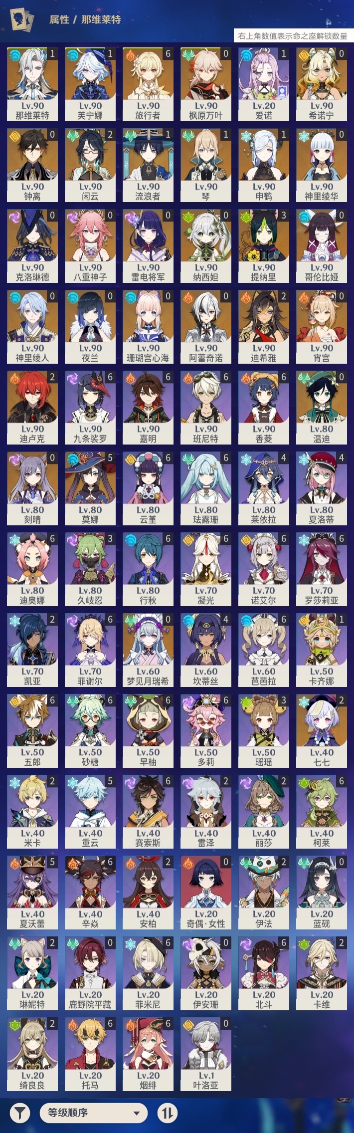 【原神】【lyys11620】冒险等级:60,五星数量:48,五星角色:莫娜 5命提纳里 3命迪希雅 2命闲云 2命迪卢克 2命七七 2命那维莱特 1命芙宁娜 1命琴 1命申鹤 1命流浪者 1命珊瑚宫心海希诺宁神里绫华温迪宵宫钟离梦见月瑞希八重神子神里绫人夜兰阿蕾奇诺纳西妲哥伦比娅枫原万叶克洛琳德刻晴雷电将军__五星武器:岩峰巡歌万世流涌大典静水流涌之辉鹤鸣余音裁叶萃光帷间夜曲风鹰剑四风原典天空之卷天空之刃天空之翼雾切之回光薙草之稻光息灾神乐之真意波乱月白经津若水千夜浮梦赦罪__四星角色:班尼特 6命行秋 6命九条裟罗 6命香菱 6命珐露珊 6命凝光 6命迪奥娜 6命砂糖 6命多莉 6命柯莱 6命芭芭拉 6命云堇 6命早柚 6命托马 6命五郎 6命烟绯 6命辛焱 6命诺艾尔 6命罗莎莉亚 6命菲谢尔 6命北斗 6命菲米尼 6命嘉明 6命赛索斯 6命重云 5命夏沃蕾 5命莱依拉 4命坎蒂丝 4命夏洛蒂 4命久岐忍 3命瑶瑶 3命绮良良 2命米卡 2命卡维 2命雷泽 2命琳妮特 2命伊法 2命卡齐娜 1命爱诺 1命奇偶·女性鹿野院平藏蓝砚伊安珊