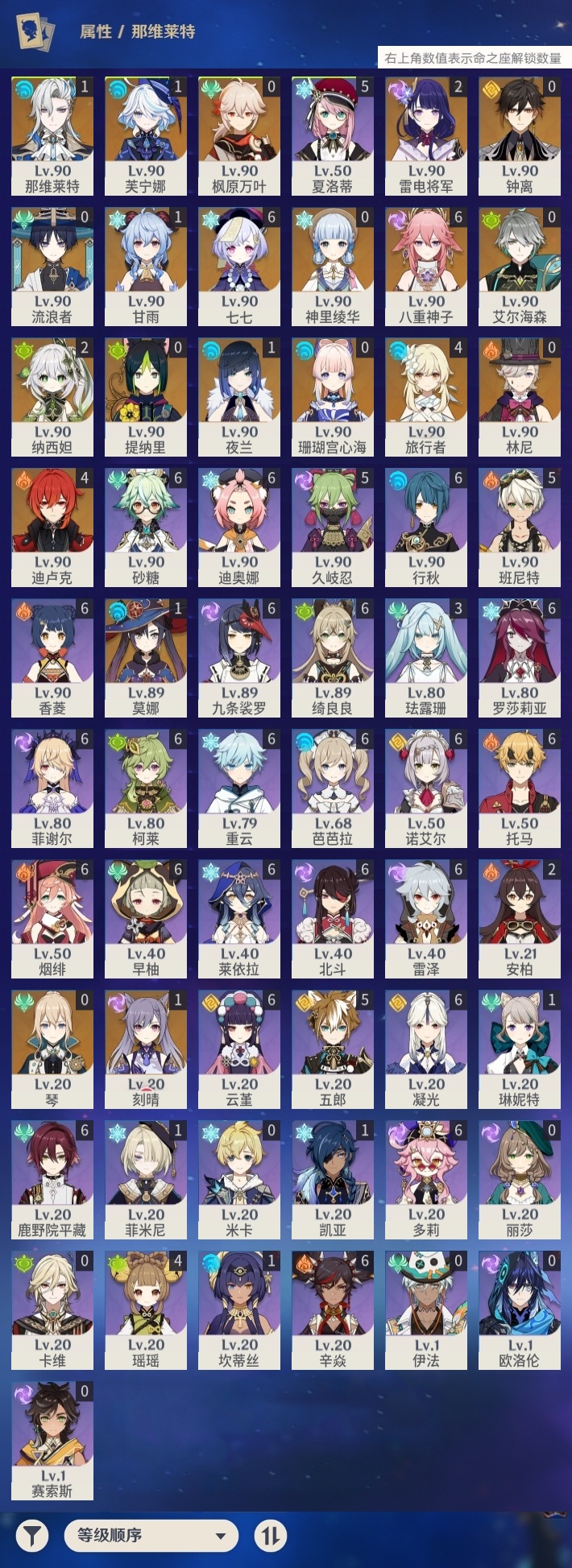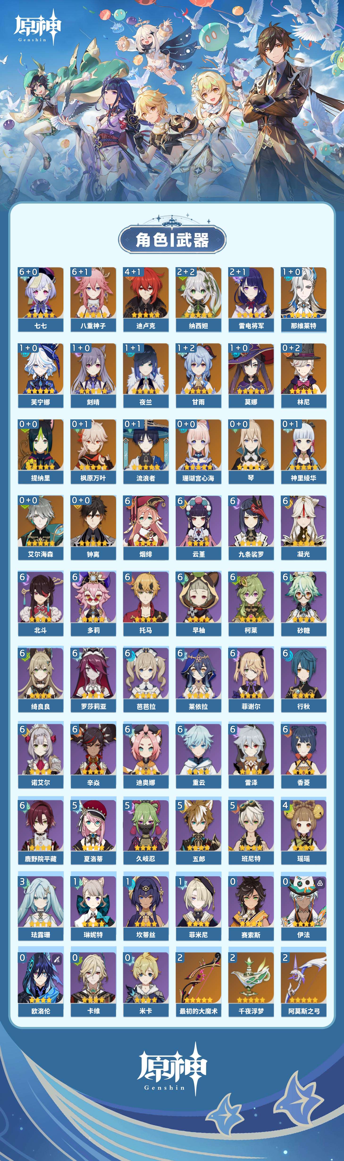【原神】【lyys11622】冒险等级:60,五星数量:36,五星角色:七七 6命八重神子 6命迪卢克 4命雷电将军 2命纳西妲 2命那维莱特 1命芙宁娜 1命甘雨 1命刻晴 1命莫娜 1命夜兰 1命琴珊瑚宫心海神里绫华钟离林尼提纳里艾尔海森流浪者枫原万叶__五星武器:最初的大魔术 2精阿莫斯之弓 2精千夜浮梦 2精图莱杜拉的回忆苍古自由之誓和璞鸢狼的末路天空之傲天空之脊天空之刃雾切之回光薙草之稻光神乐之真意波乱月白经津若水圣显之钥__四星角色:行秋 6命九条裟罗 6命香菱 6命鹿野院平藏 6命凝光 6命迪奥娜 6命砂糖 6命绮良良 6命莱依拉 6命多莉 6命柯莱 6命芭芭拉 6命云堇 6命早柚 6命托马 6命烟绯 6命重云 6命辛焱 6命诺艾尔 6命罗莎莉亚 6命雷泽 6命菲谢尔 6命北斗 6命班尼特 5命久岐忍 5命五郎 5命夏洛蒂 5命瑶瑶 4命珐露珊 3命坎蒂丝 1命菲米尼 1命琳妮特 1命米卡卡维欧洛伦伊法赛索斯