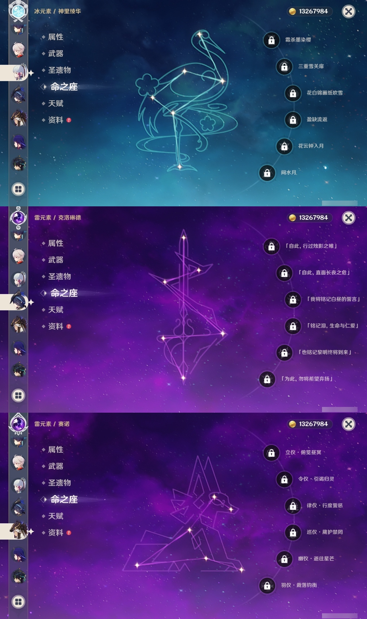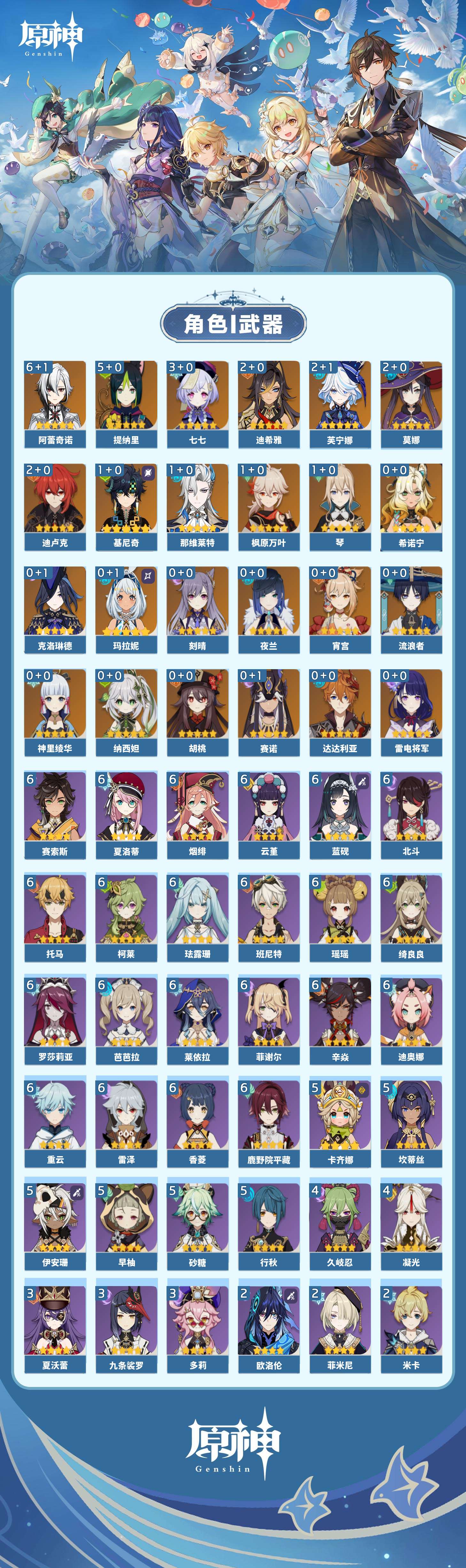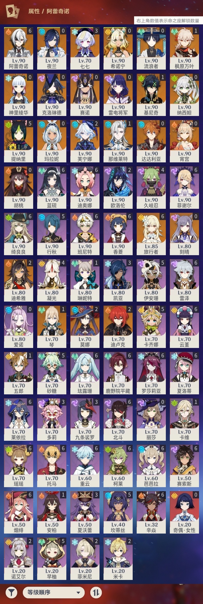 【原神】【lyys11624】冒险等级:60,五星数量:36,五星角色:阿蕾奇诺 6命提纳里 5命七七 3命迪希雅 2命芙宁娜 2命迪卢克 2命莫娜 2命基尼奇 1命那维莱特 1命枫原万叶 1命琴 1命玛拉妮希诺宁神里绫华宵宫达达利亚夜兰赛诺纳西妲流浪者胡桃克洛琳德刻晴雷电将军__五星武器:天空之翼 2精冲浪时光金流监督静水流涌之辉赤月之形阿莫斯之弓风鹰剑天空之傲天空之刃赤沙之杖赦罪__四星角色:班尼特 6命香菱 6命鹿野院平藏 6命珐露珊 6命迪奥娜 6命绮良良 6命瑶瑶 6命莱依拉 6命柯莱 6命芭芭拉 6命云堇 6命蓝砚 6命托马 6命烟绯 6命重云 6命辛焱 6命罗莎莉亚 6命雷泽 6命菲谢尔 6命北斗 6命夏洛蒂 6命赛索斯 6命卡齐娜 5命行秋 5命砂糖 5命坎蒂丝 5命早柚 5命伊安珊 5命久岐忍 4命凝光 4命九条裟罗 3命多莉 3命夏沃蕾 3命米卡 2命欧洛伦 2命诺艾尔 2命菲米尼 2命卡维 1命五郎 1命琳妮特 1命奇偶·女性爱诺