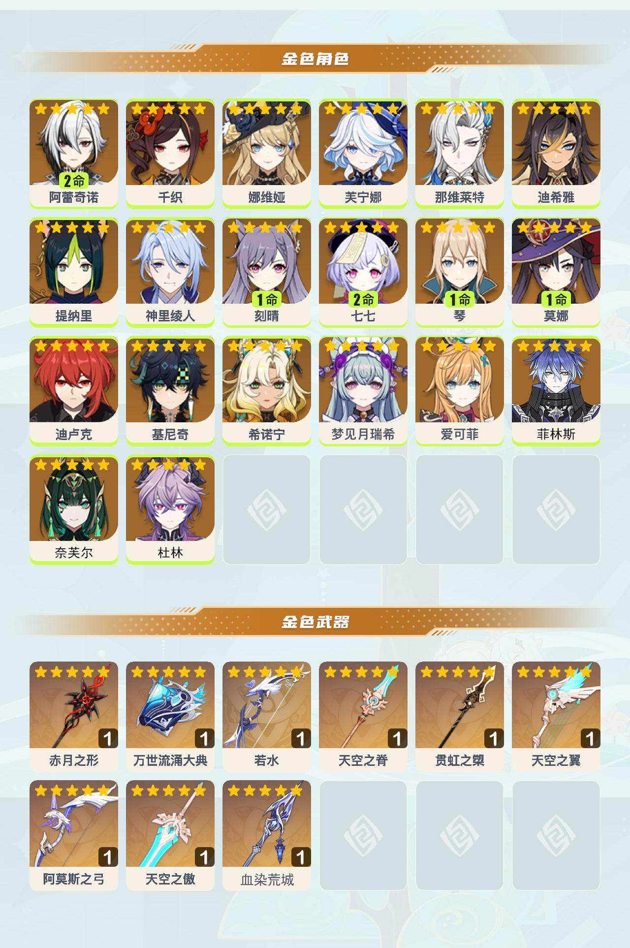 【yszg644】57级/36黄/女主/20个五星角色/9个五星武器/2命阿蕾奇诺/0命芙宁娜/0命希诺宁/0命杜林/0命奈芙尔/0命基尼奇/0命那维莱特/0命千织/0命菲林斯/0命神里绫人/0命娜维娅/0命爱可菲/1命刻晴/1命莫娜/0命梦见月瑞希/1命琴/2命七七/0命迪希雅/0命提纳里/0命迪卢克/精1万世流涌大典/精1赤月之形/精1天空之脊/精1贯虹之槊/精1血染荒城/精1阿莫斯之弓/精1若水/精1天空之翼/精1天空之傲
