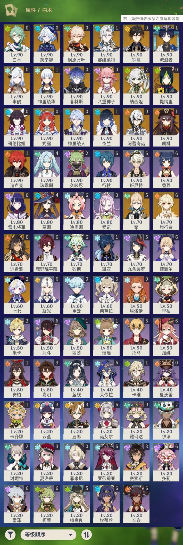 【原神】【lyys11635】冒险等级:60,五星数量:45,五星角色:琴 5命莫娜 4命七七 2命纳西妲 2命那维莱特 1命迪卢克 1命胡桃 1命神里绫华 1命夜兰 1命流浪者 1命白术迪希雅钟离申鹤八重神子神里绫人芙宁娜提纳里阿蕾奇诺妮露菲林斯哥伦比娅枫原万叶雷电将军__五星武器:山王长牙万世流涌大典图莱杜拉的回忆阿莫斯之弓帷间夜曲苍古自由之誓飞雷之弦振风鹰剑和璞鸢护摩之杖四风原典天空之傲天空之卷天空之刃雾切之回光若水赤沙之杖圣显之钥千夜浮梦白雨心弦__四星角色:班尼特 6命行秋 6命香菱 6命鹿野院平藏 6命凝光 6命迪奥娜 6命砂糖 6命莱依拉 6命坎蒂丝 6命多莉 6命柯莱 6命芭芭拉 6命早柚 6命托马 6命烟绯 6命辛焱 6命诺艾尔 6命罗莎莉亚 6命雷泽 6命菲谢尔 6命北斗 6命九条裟罗 5命绮良良 5命珐露珊 4命云堇 3命五郎 3命夏洛蒂 3命嘉明 3命赛索斯 3命久岐忍 2命米卡 2命琳妮特 2命伊法 2命卡齐娜 1命瑶瑶 1命卡维 1命蓝砚 1命埃洛伊重云菲米尼夏沃蕾爱诺
