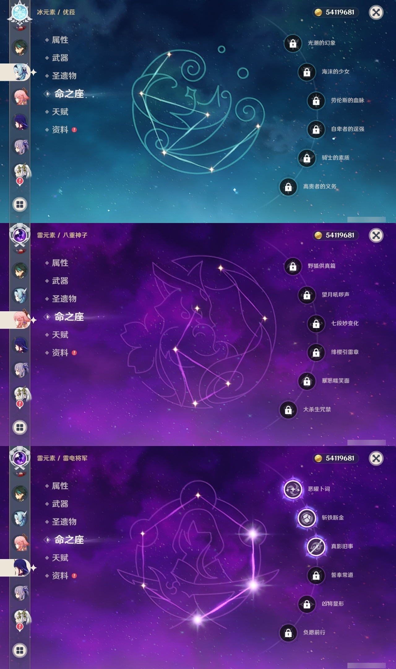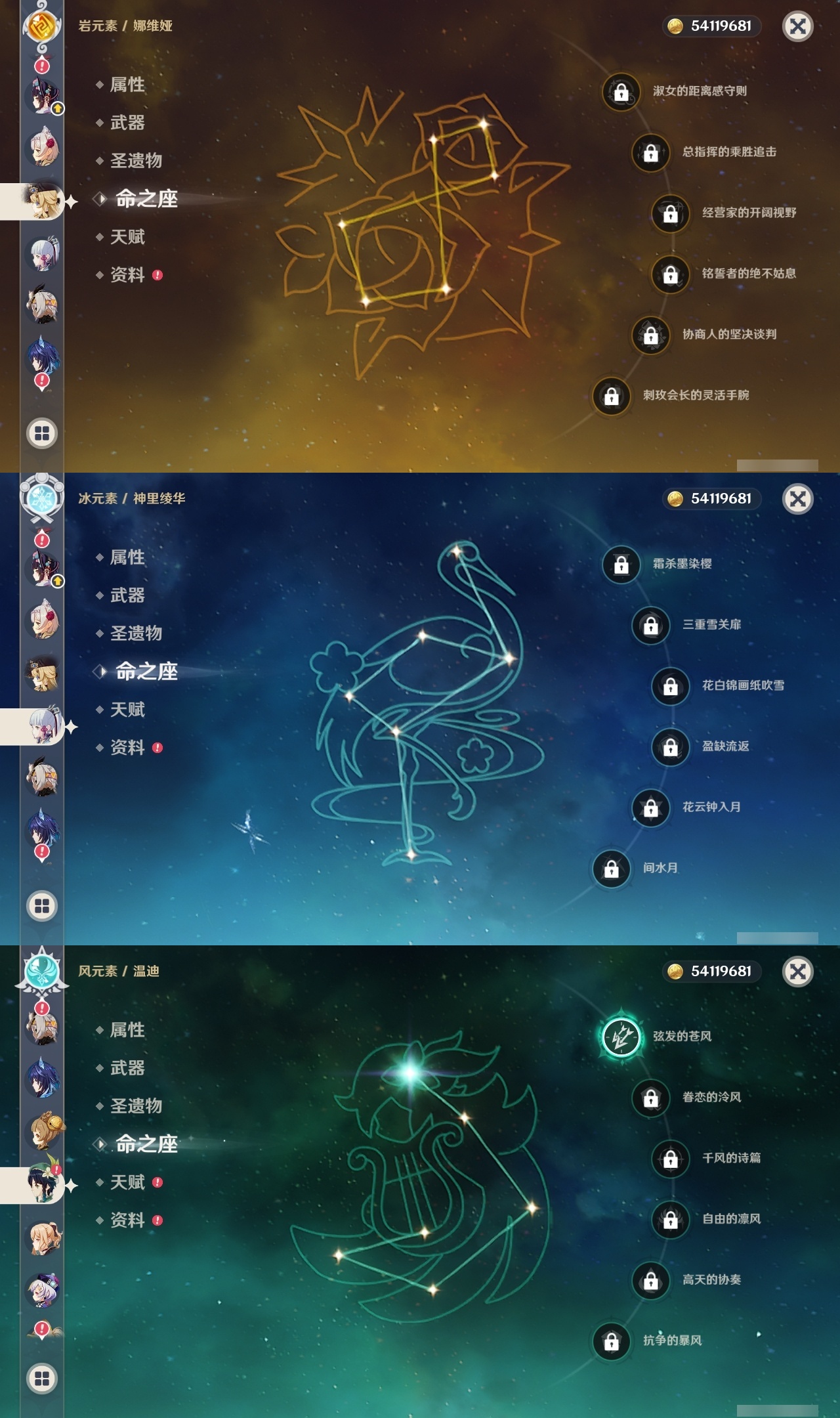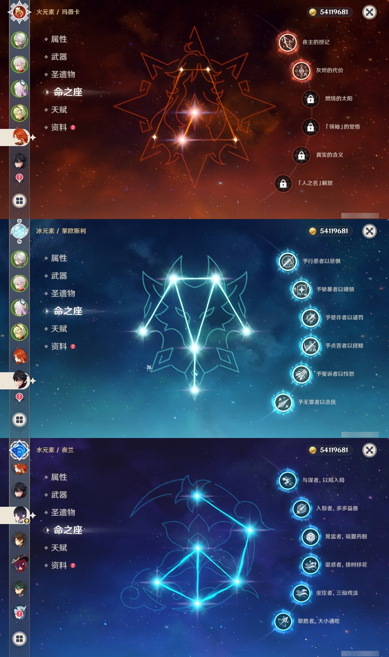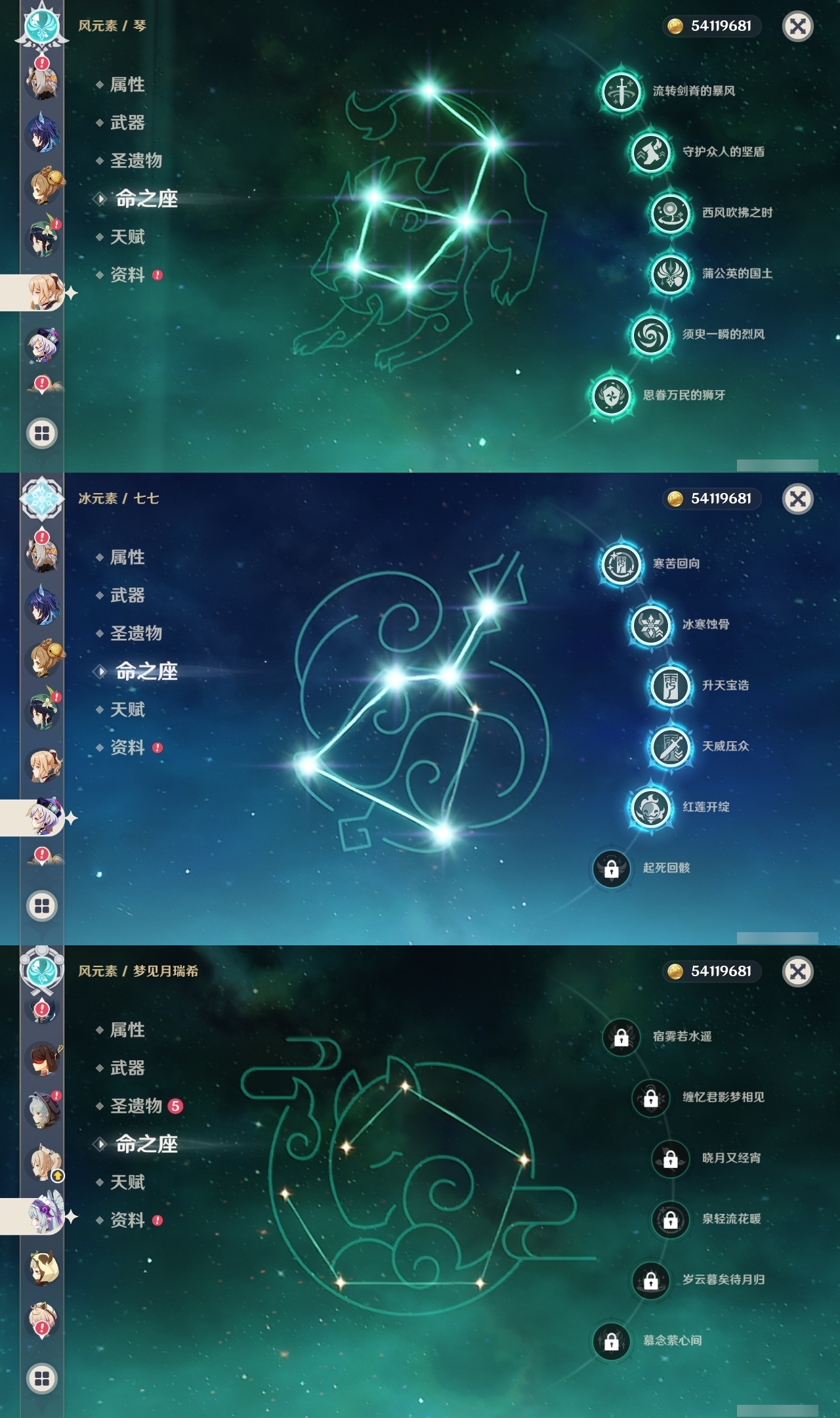 【原神】满命,冒险等级:60,五星数量:53,五星角色:莱欧斯利 6命琴 6命夜兰 6命七七 5命刻晴 4命迪希雅 3命雷电将军 3命玛薇卡 2命魈 2命纳西妲 2命恰斯卡 1命阿蕾奇诺 1命枫原万叶 1命胡桃 1命温迪 1命提纳里 1命珊瑚宫心海神里绫华茜特菈莉宵宫优菈钟离梦见月瑞希八重神子芙宁娜娜维娅迪卢克__五星武器:无工之剑 2精星鹫赤羽焚曜千阳金流监督静水流涌之辉阿莫斯之弓不灭月华苍古自由之誓飞雷之弦振风鹰剑护摩之杖天空之傲天空之卷天空之刃天空之翼雾切之回光薙草之稻光终末嗟叹之诗息灾贯虹之槊若水赤沙之杖千夜浮梦__四星角色:班尼特 6命行秋 6命九条裟罗 6命香菱 6命凝光 6命迪奥娜 6命砂糖 6命瑶瑶 6命坎蒂丝 6命多莉 6命柯莱 6命芭芭拉 6命欧洛伦 6命云堇 6命早柚 6命托马 6命烟绯 6命重云 6命辛焱 6命诺艾尔 6命罗莎莉亚 6命菲谢尔 6命北斗 6命久岐忍 5命鹿野院平藏 5命雷泽 5命莱依拉 4命珐露珊 3命五郎 3命嘉明 3命米卡 2命蓝砚 2命琳妮特 2命夏洛蒂 2命伊法 2命伊安珊 2命卡齐娜 1命绮良良 1命菲米尼 1命爱诺 1命赛索斯 1命埃洛伊奇偶·女性奇偶·男性夏沃蕾塔利雅