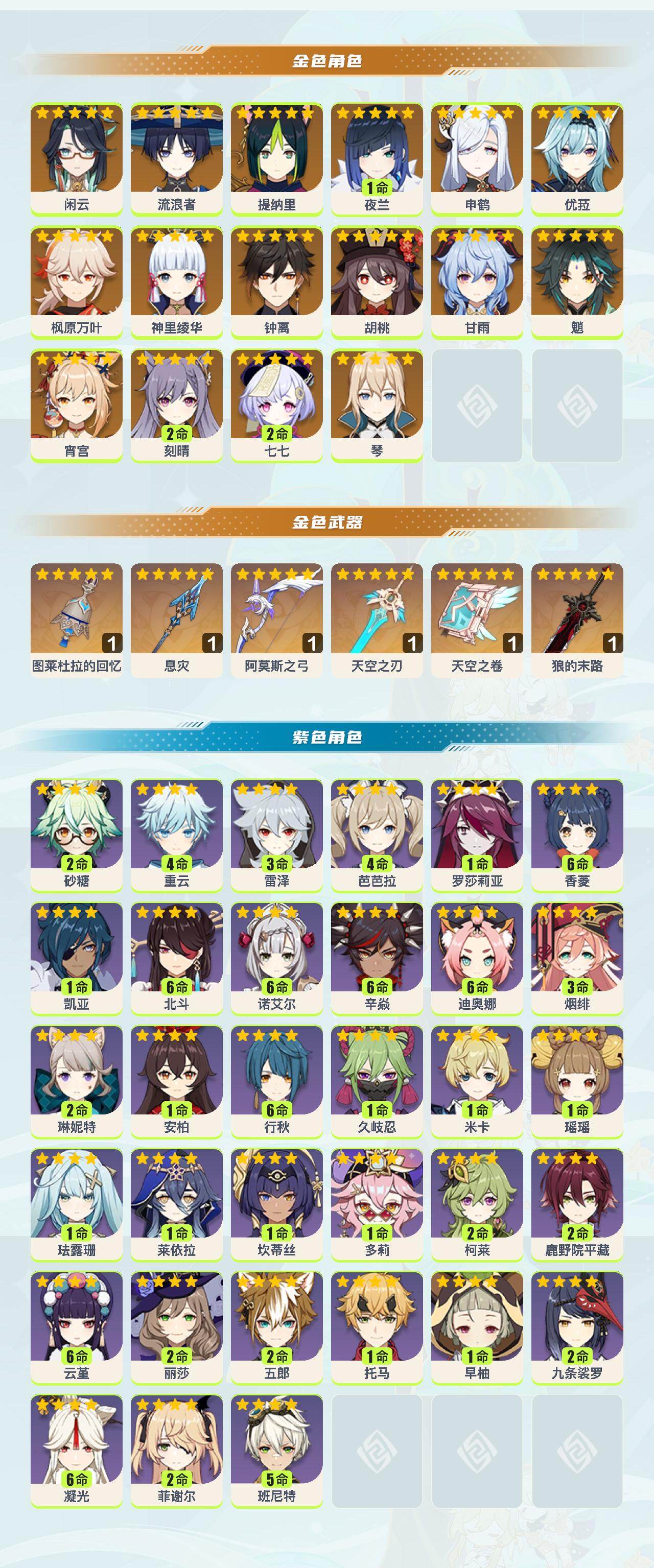 【ysz3126】56级/男主/18个五星角色/0命闲云/0命流浪者/0命提纳里/1命夜兰/0命申鹤/0命宵宫/0命神里绫华/0命枫原万叶/0命优菈/0命胡桃/0命魈/0命甘雨/0命钟离/0命琴/2命刻晴/2命七七/精1图莱杜拉的回忆/精1息灾/精1天空之卷/精1狼的末路/精1阿莫斯之弓/精1天空之刃/2命琳妮特/1命米卡/0命瑶瑶/0命珐露珊/0命莱依拉/1命坎蒂丝/1命多莉/2命柯莱/2命鹿野院平藏/0命久岐忍/满命云堇/2命五郎/1命托马/2命九条裟罗/1命早柚/3命烟绯/1命罗莎莉亚/满命辛焱/满命迪奥娜/2命砂糖/3命雷泽/2命菲谢尔/2命丽莎/满命北斗/满命香菱/0命安柏/5命班尼特/满命行秋/4命芭芭拉/满命凝光/满命诺艾尔/0命凯亚/4命重云