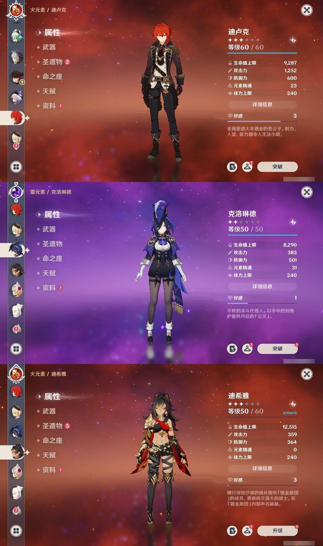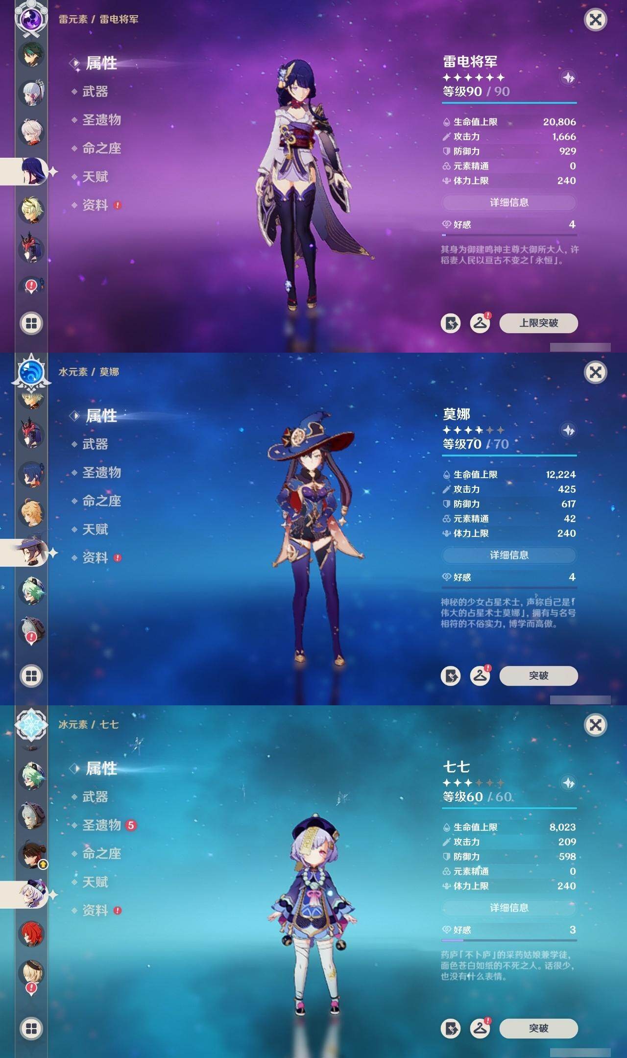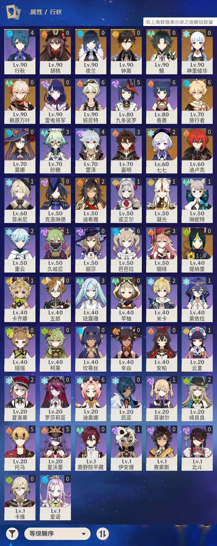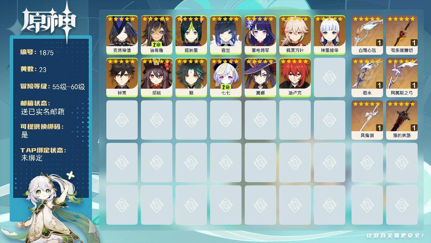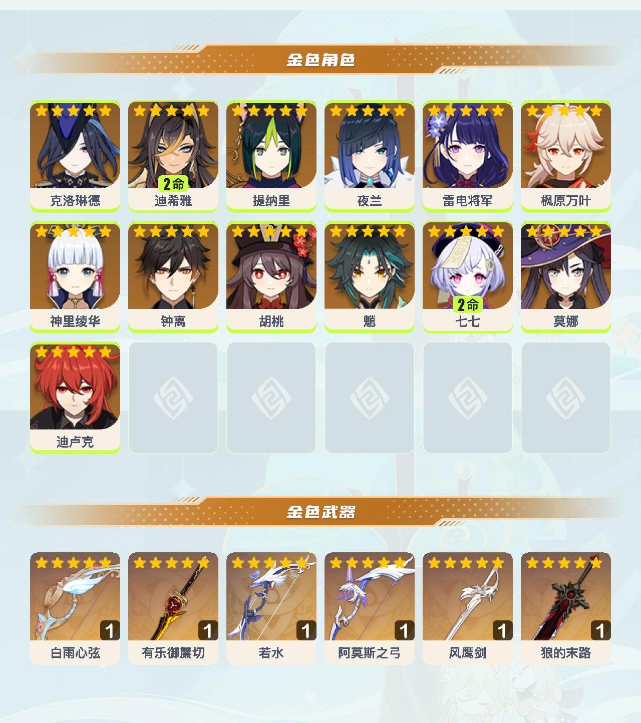 [16545227]58级/23黄/男主/13个五星角色/6个五星武器 0命克洛琳德2命迪希雅0命提纳里0命夜兰0命雷电将军0命枫原万叶0命神里绫华0命钟离0命胡桃0命魈2命七七0命莫娜0命迪卢克精1白雨心弦精1有乐御簾切精1若水精1阿莫斯之弓精1风鹰剑精1狼的末路