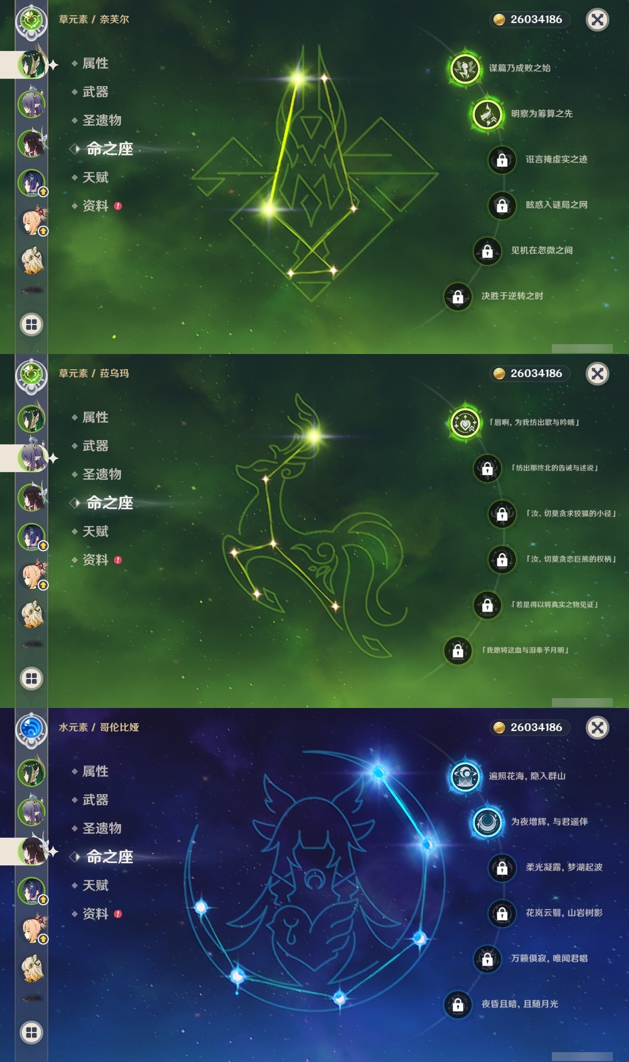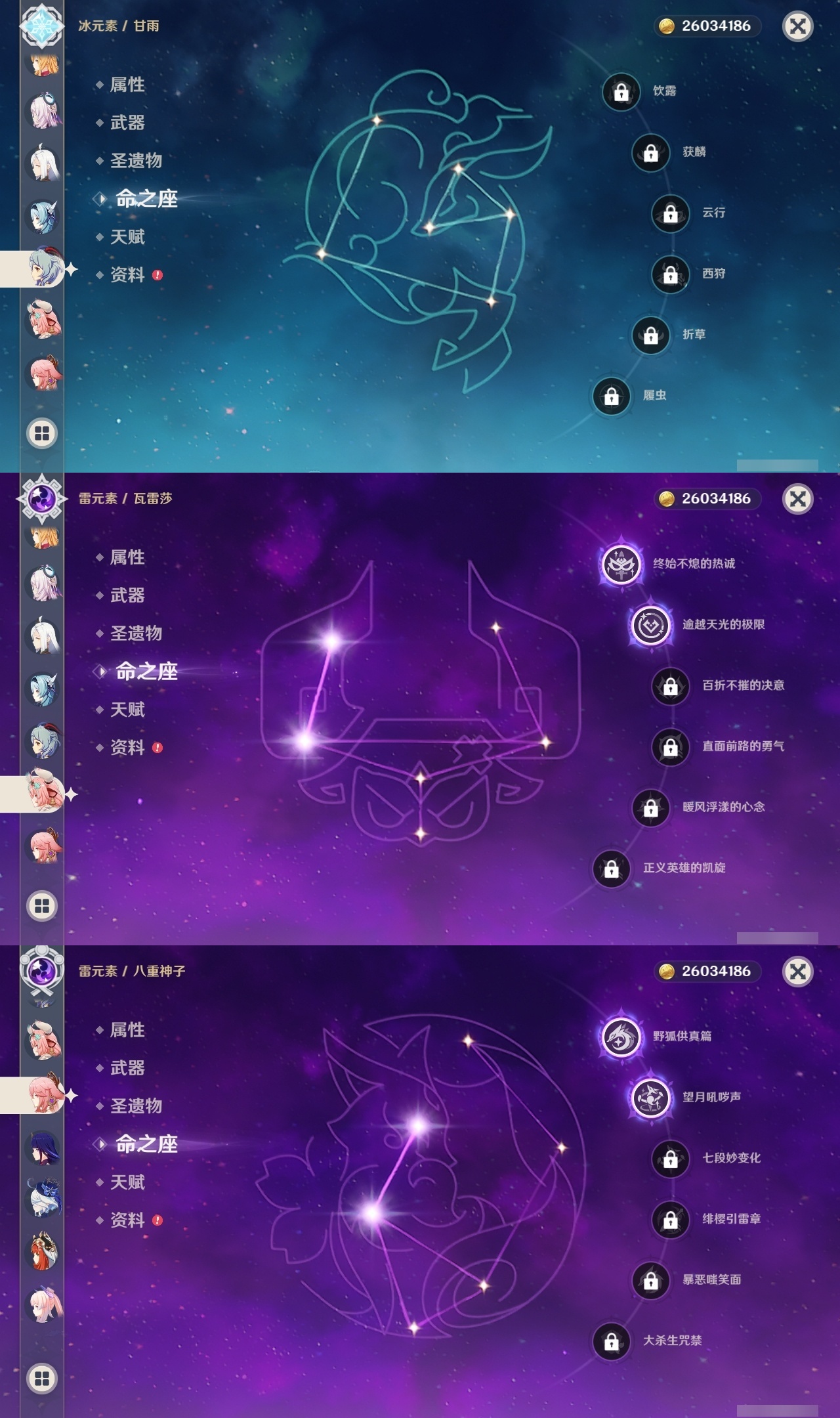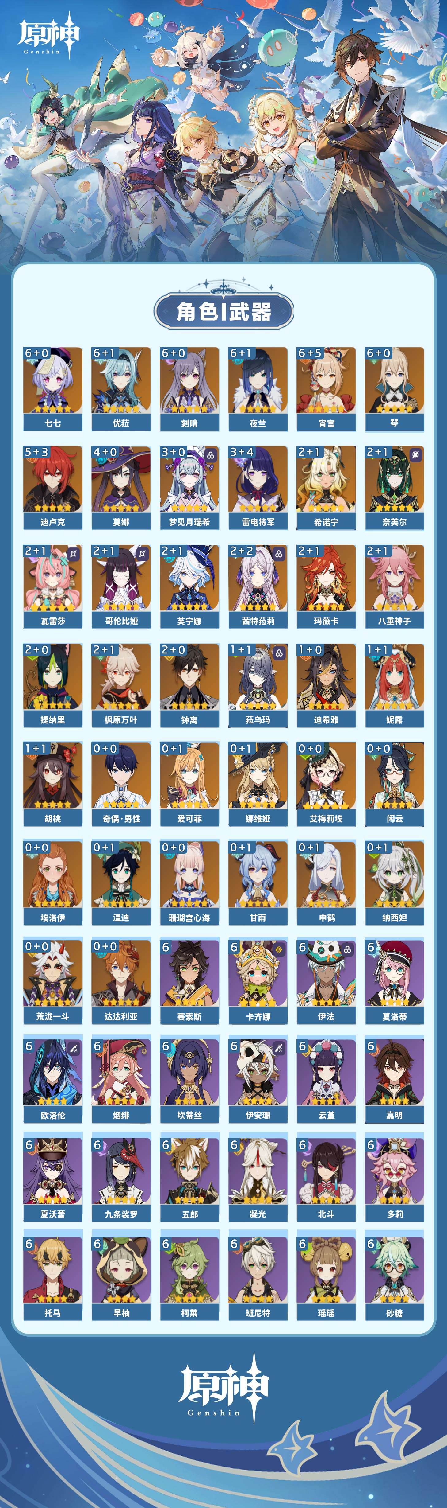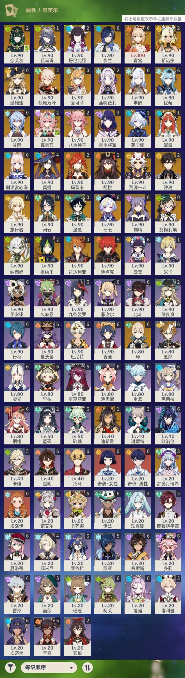 【原神】满命,冒险等级:60,五星数量:72,五星角色:刻晴 6命七七 6命琴 6命宵宫 6命优菈 6命夜兰 6命迪卢克 5命莫娜 4命梦见月瑞希 3命雷电将军 3命希诺宁 2命玛薇卡 2命茜特菈莉 2命瓦雷莎 2命芙宁娜 2命奈芙尔 2命哥伦比娅 2命枫原万叶 2命钟离 2命八重神子 2命提纳里 2命迪希雅 1命菈乌玛 1命胡桃 1命妮露 1命艾梅莉埃珊瑚宫心海温迪荒泷一斗达达利亚申鹤娜维娅闲云爱可菲纳西妲甘雨__五星武器:飞雷之弦振 5精薙草之稻光 4精和璞鸢 3精狼的末路 3精天空之翼 3精祭星者之望 2精磐岩结绿 2精四风原典 2精岩峰巡歌焚曜千阳溢彩心念静水流涌之辉裁断香韵奏者纺夜天镜真语秘匣阿莫斯之弓帷间夜曲苍古自由之誓风鹰剑护摩之杖松籁响起之时天空之傲天空之脊天空之卷天空之刃无工之剑终末嗟叹之诗息灾神乐之真意若水圣显之钥千夜浮梦__四星角色:卡齐娜 6命班尼特 6命行秋 6命九条裟罗 6命香菱 6命凝光 6命迪奥娜 6命砂糖 6命瑶瑶 6命莱依拉 6命坎蒂丝 6命多莉 6命柯莱 6命芭芭拉 6命欧洛伦 6命云堇 6命早柚 6命托马 6命五郎 6命烟绯 6命重云 6命辛焱 6命诺艾尔 6命罗莎莉亚 6命雷泽 6命菲谢尔 6命北斗 6命夏洛蒂 6命夏沃蕾 6命嘉明 6命伊法 6命伊安珊 6命赛索斯 6命鹿野院平藏 5命卡维 5命珐露珊 4命菲米尼 4命久岐忍 3命琳妮特 3命塔利雅 3命绮良良 2命蓝砚 2命米卡 1命埃洛伊奇偶·女性奇偶·男性爱诺