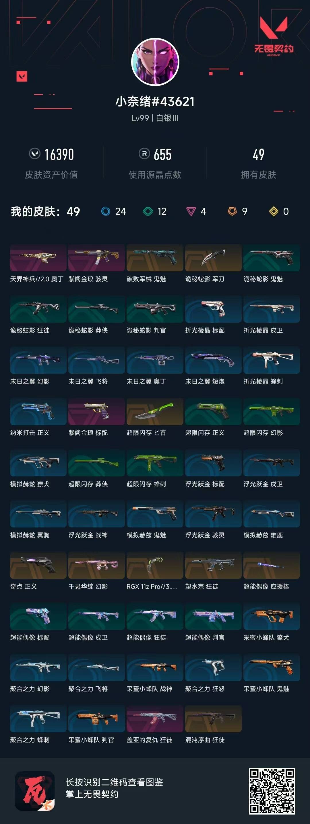 [10019987]9橙皮 4紫皮 49皮肤 26英雄 75卡面 655已用源晶 白银 佩呛皮肤:正义-奇点鬼魅-破败军械标配-紫阙金琅 冲锋呛皮肤:骇灵-紫阙金琅 步呛皮肤:狂徒-混沌序曲狂徒-塑水宗狂徒-盖亚的复仇幻影-千灵华绽 机呛皮肤:奥丁-天界神兵2.0 近战武器皮肤:匕首-超限闪存诡秘蛇影爪刀-rgx 11z pro 3.0超能偶像 应援棒