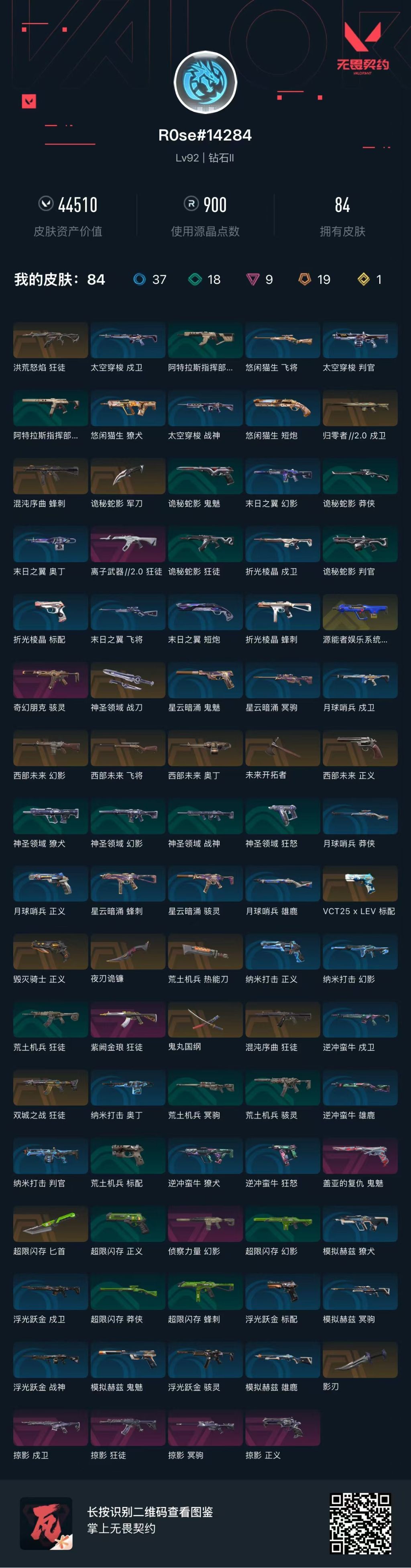 [10069032]r25511 剩余点券:509 lv92 ,皮肤总价值44510,钻石ii,总皮肤84,刀皮8呛皮76终极1传奇11卓越9,套装2传奇1卓越1,具体详情看图