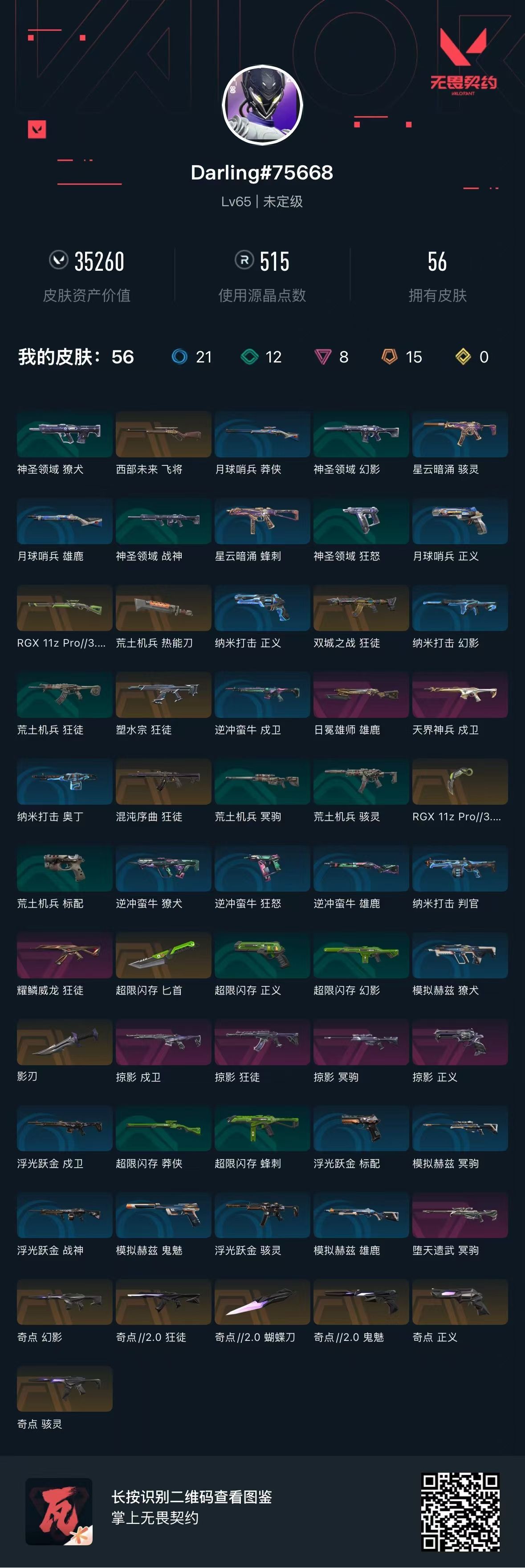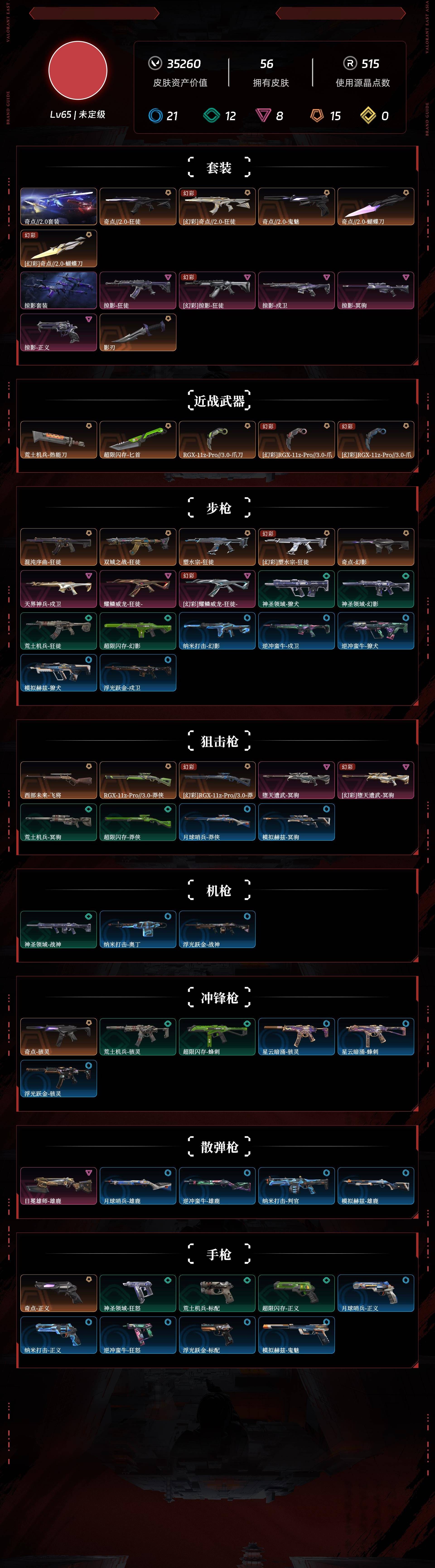 [10089635]r25595 lv65 ,皮肤总价值35260,未定级,总皮肤56,刀皮5呛皮51传奇10卓越8,套装2传奇1卓越1,奇点2.0套装,具体详情看图