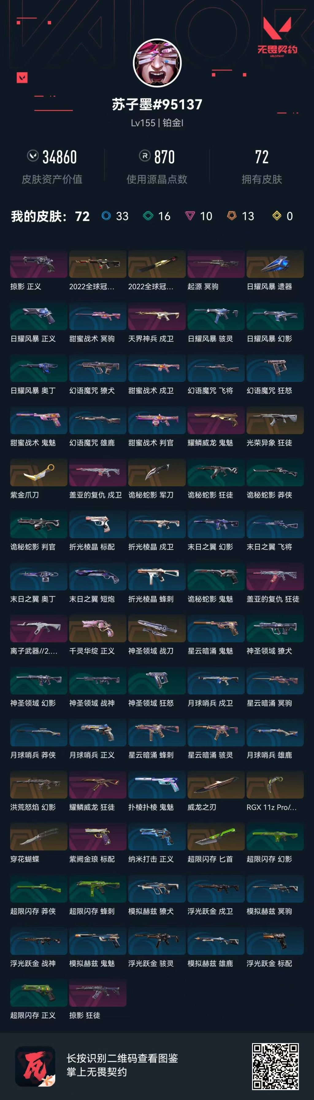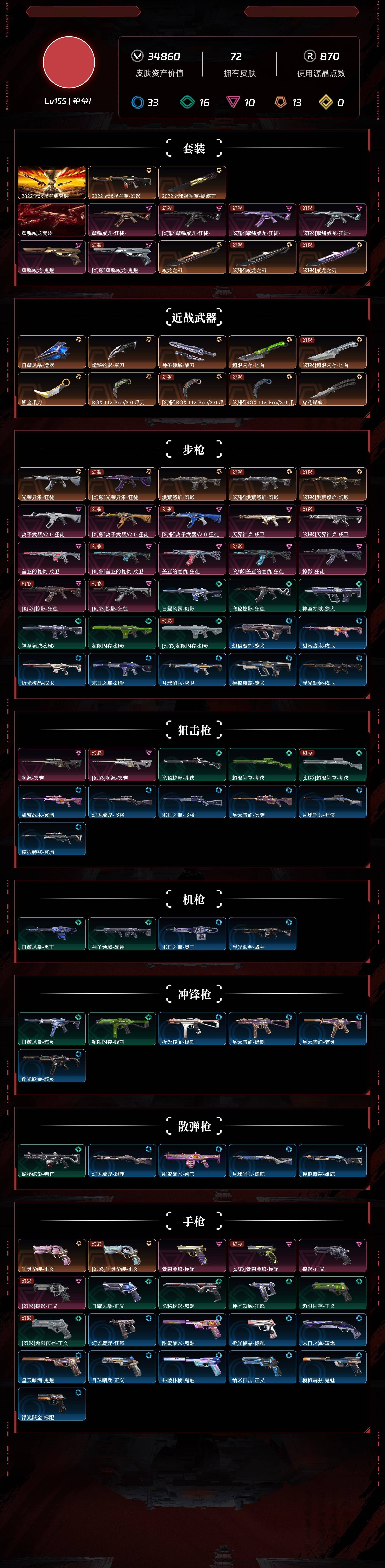 [10127190]r25725 剩余点券:66 lv155 ,皮肤总价值34860,铂金i,总皮肤72,刀皮9呛皮63传奇4卓越10,套装2传奇1卓越1,耀鳞威龙套装,具体详情看图