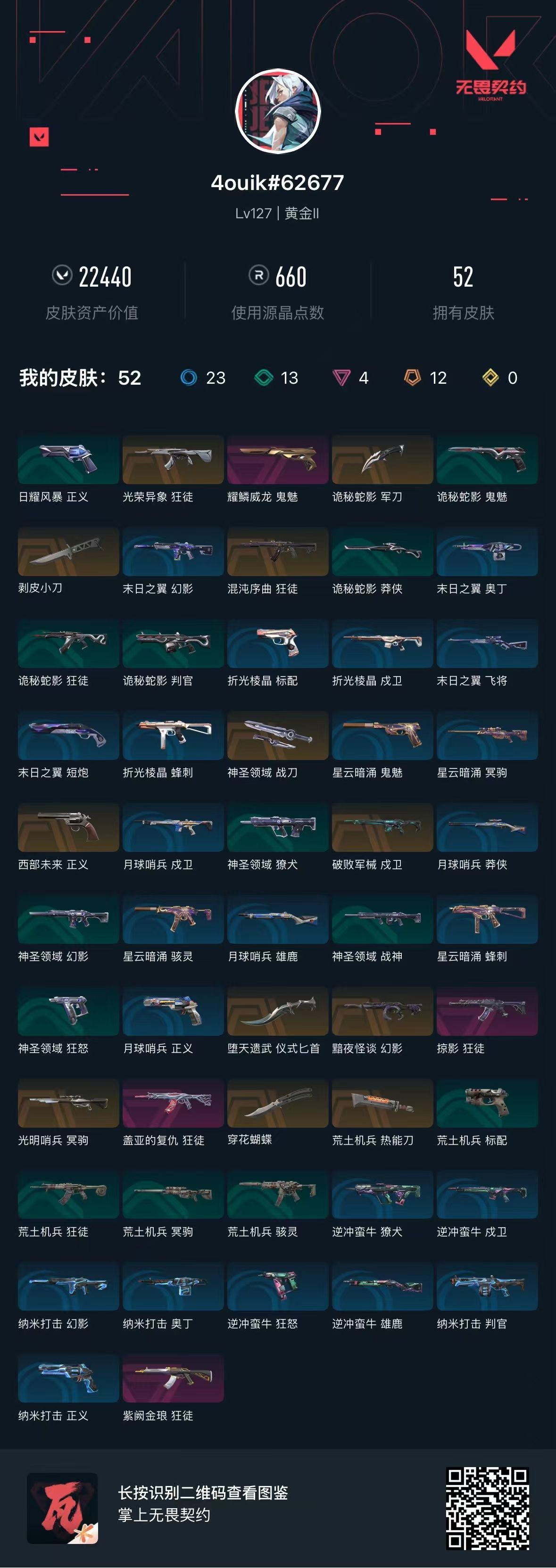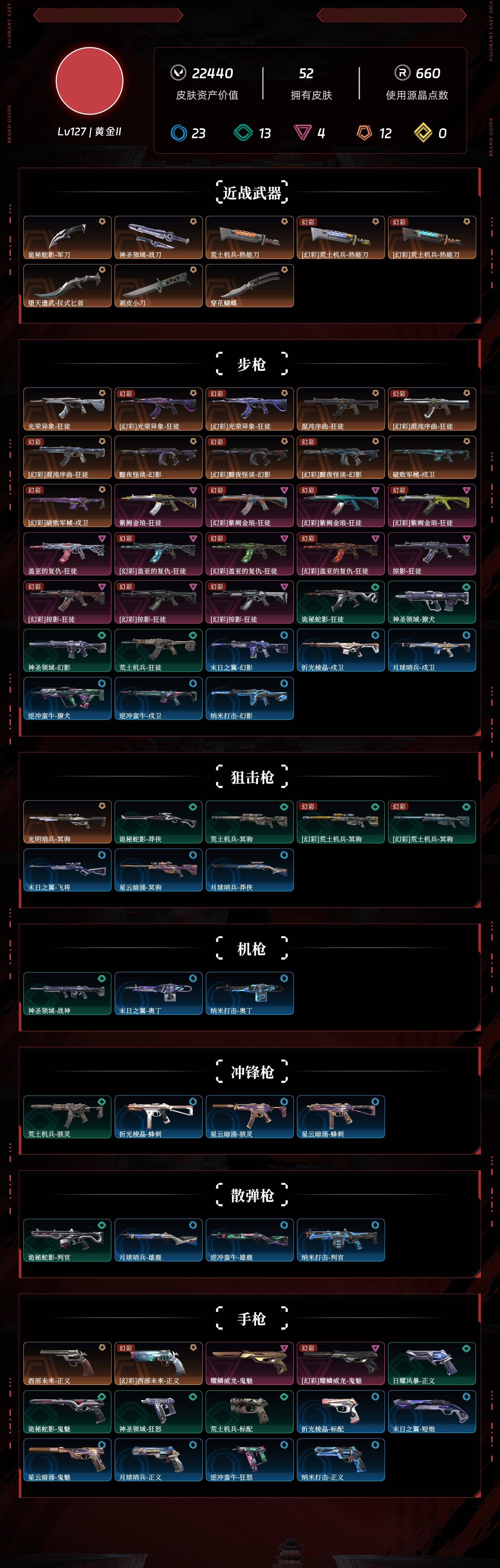 [10130098]r25752 剩余点券:28 lv127 ,皮肤总价值22440,黄金ii,总皮肤52,刀皮6呛皮46传奇6卓越4,具体详情看图