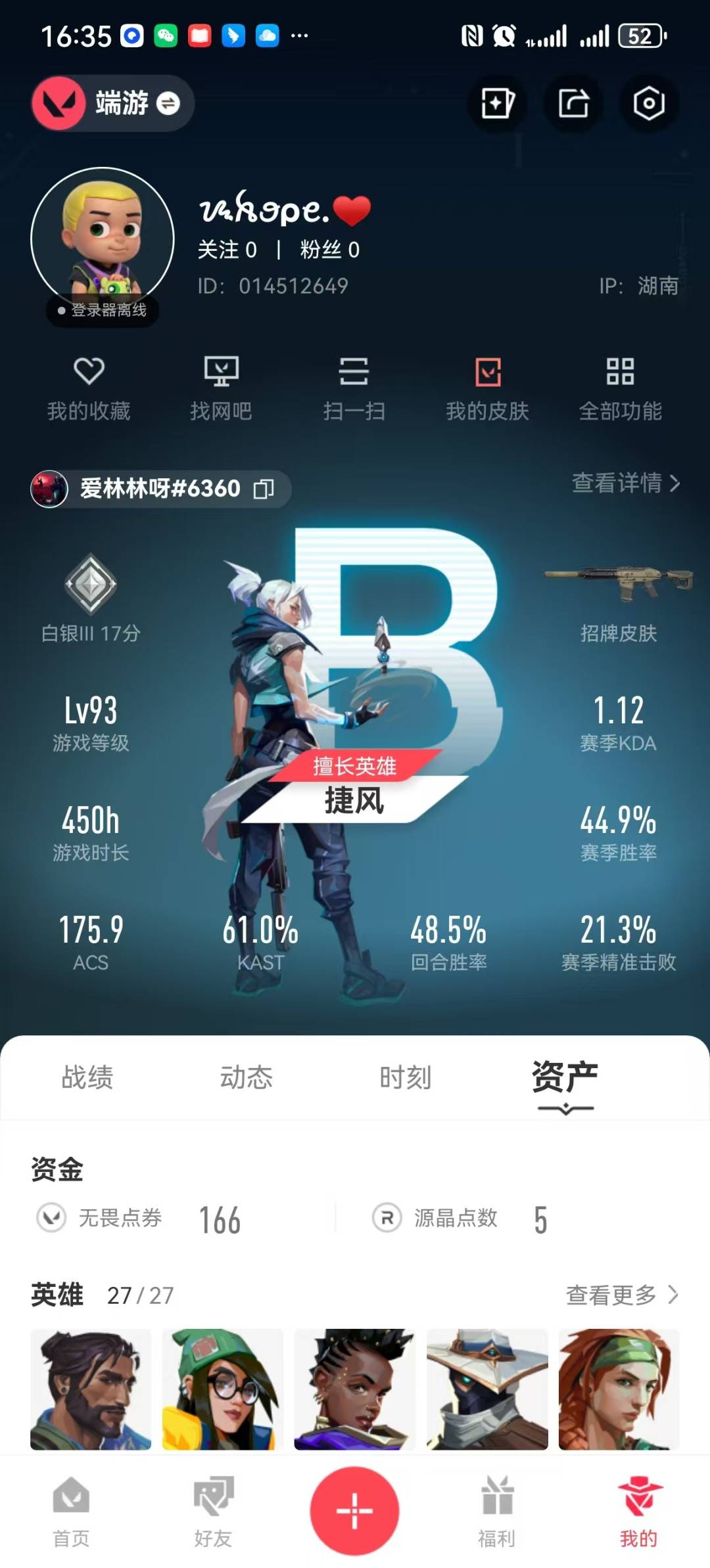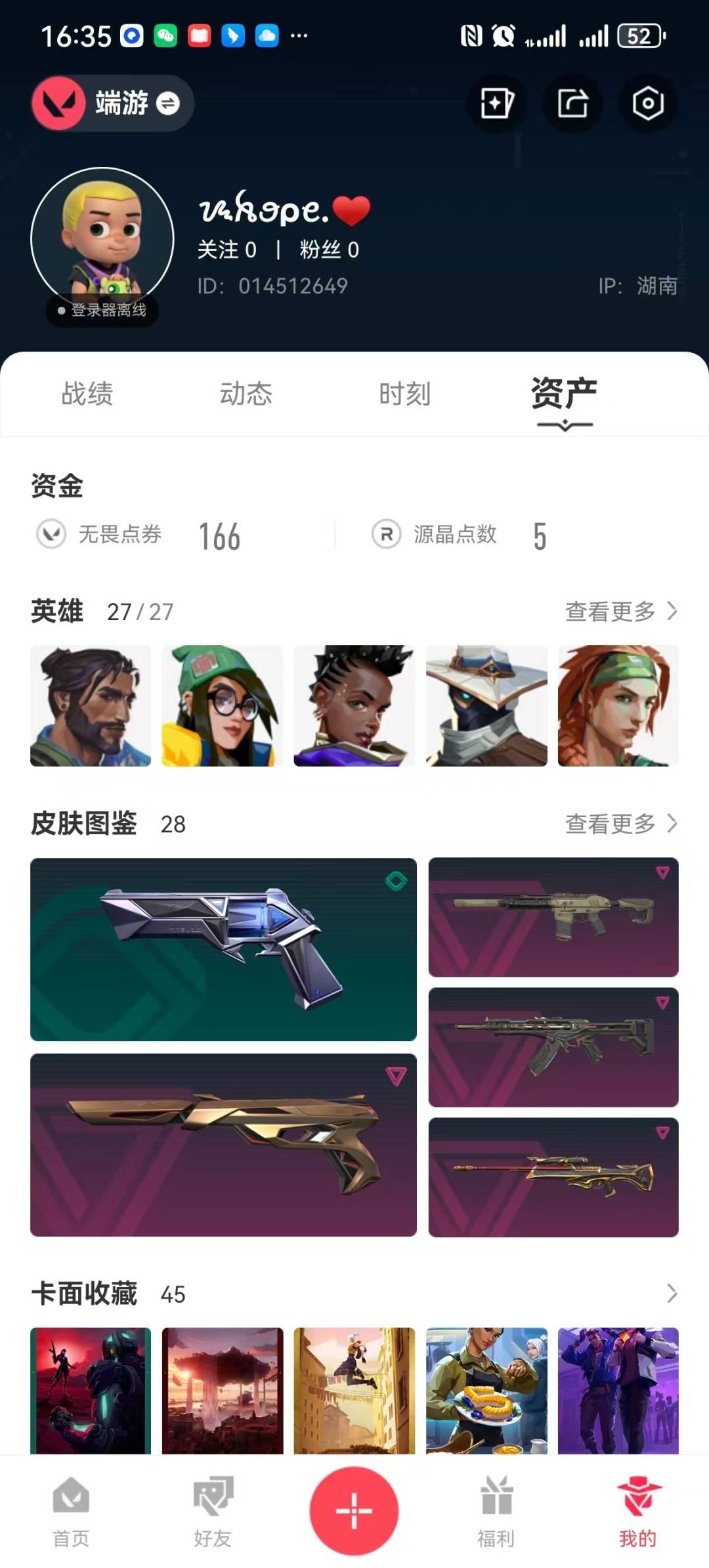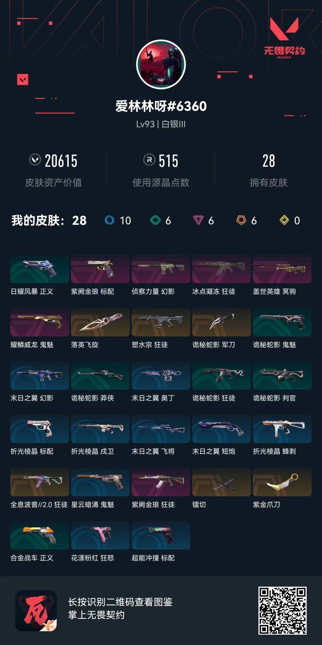 [10147045]6橙皮 6紫皮 28皮肤 27英雄 45卡面 515已用源晶 白银 佩呛皮肤:鬼魅-耀鳞威龙标配-紫阙金琅 步呛皮肤:狂徒-紫阙金琅狂徒-塑水宗狂徒-全息波普//2.0狂徒-冰点凝冻幻影-侦察力量 狙击呛皮肤:冥驹-盖世英雄 近战武器皮肤:镭切紫金爪刀落英飞旋