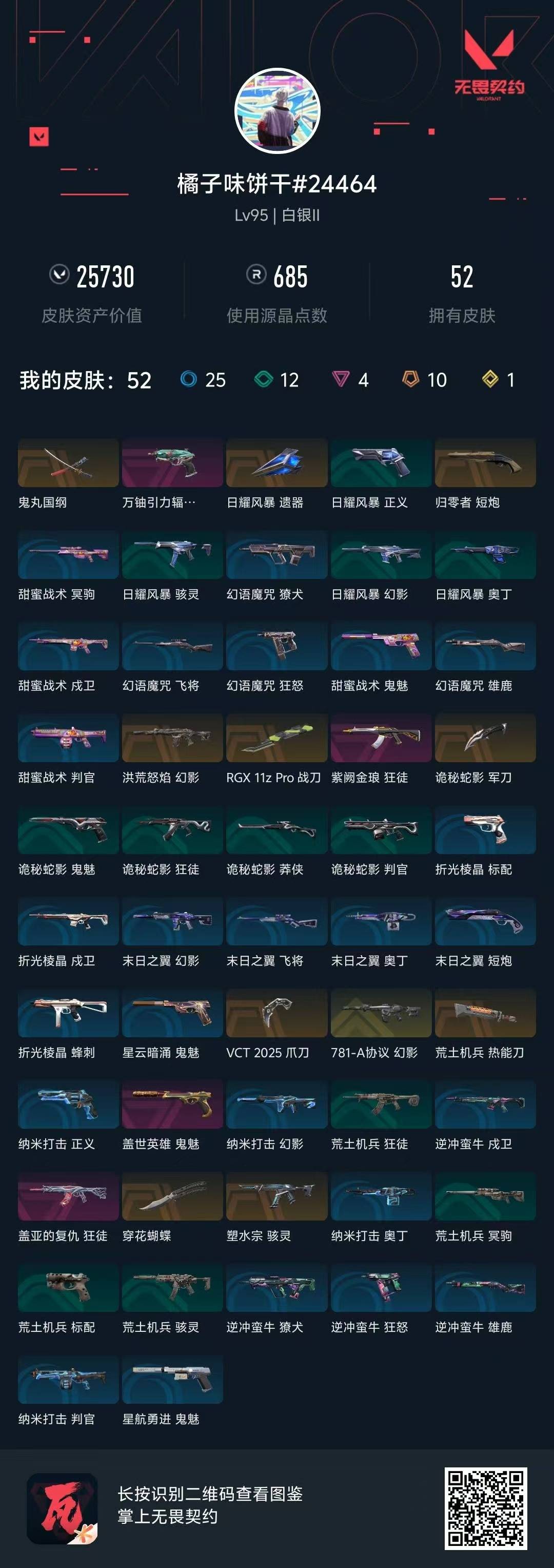 [10147518]10橙皮 1金皮 4紫皮 52皮肤 21英雄 68卡面 685已用源晶 白银 套装:vct 2025赛季礼包vctcn2025套装 佩呛皮肤:标配-万铀引力辐爆者鬼魅-盖世英雄短炮-归零者 冲锋呛皮肤:骇灵-塑水宗 步呛皮肤:狂徒-紫阙金琅狂徒-盖亚的复仇幻影-781-a协议幻影-洪荒怒焰 近战武器皮肤:vct 2025 爪刀穿花蝴蝶鬼丸国纲荒土机兵热能刀rgx 11z pro 战刀