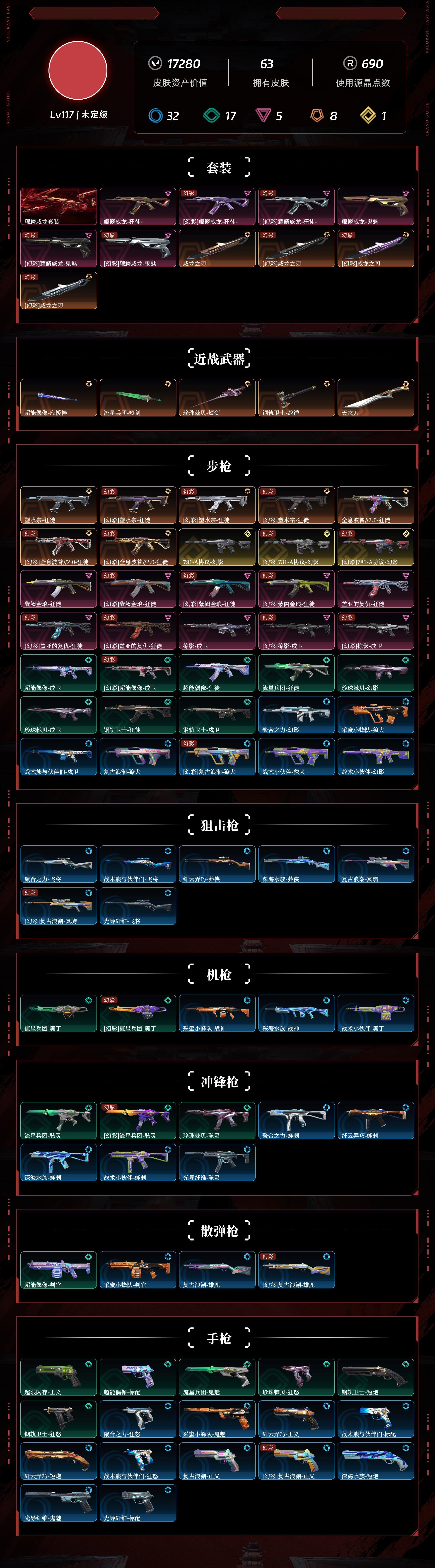 [10179757]r25934,有二次,剩余点券:73 lv117 ,皮肤总价值17280,未定级,总皮肤63,刀皮6呛皮57终极1传奇2卓越5,套装1卓越1,耀鳞威龙套装,具体详情看图