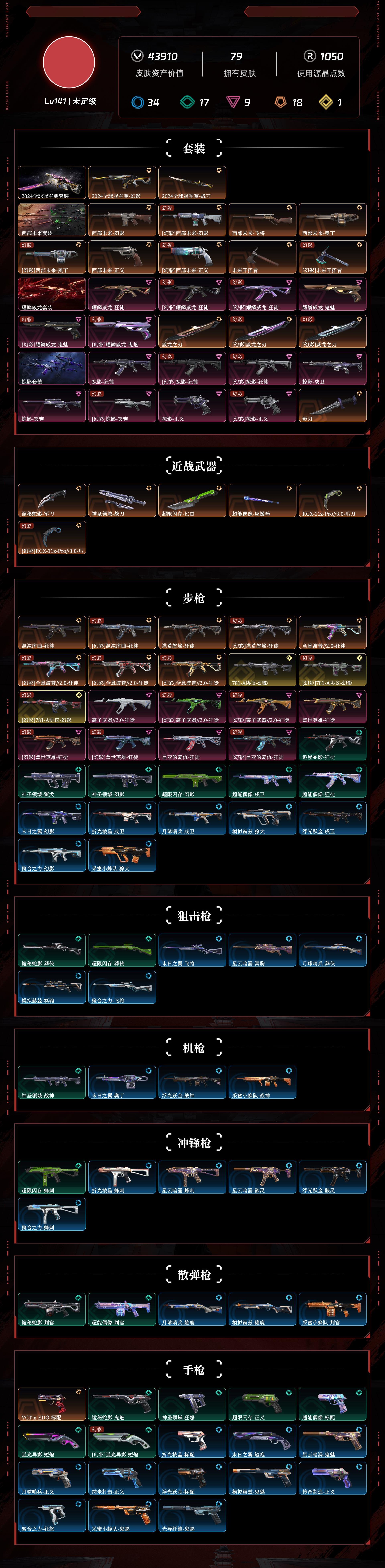 [10184463]r24258,有二次,剩余点券:62 lv141 ,皮肤总价值43910,未定级,总皮肤79,刀皮9呛皮70终极1传奇9卓越9,套装4传奇2卓越2,2024全球冠军赛套装,耀鳞威龙套装,具体详情看图