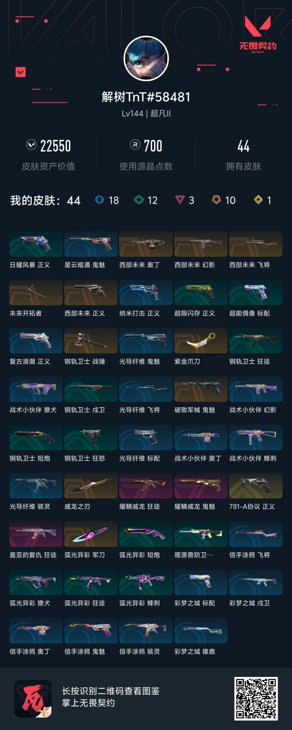 10橙皮 1金皮 3紫皮 44皮肤 25英雄 96卡面 700已用源晶 超凡 套装:西部未来耀鳞威龙套装 佩呛皮肤:正义-西部未来正义-781-a协议鬼魅-破败军械鬼魅-耀鳞威龙 步呛皮肤:幻影-西部未来狂徒-盖亚的复仇狂徒-耀鳞威龙 狙击呛皮肤:飞将-西部未来 机呛皮肤:奥丁-西部未来
