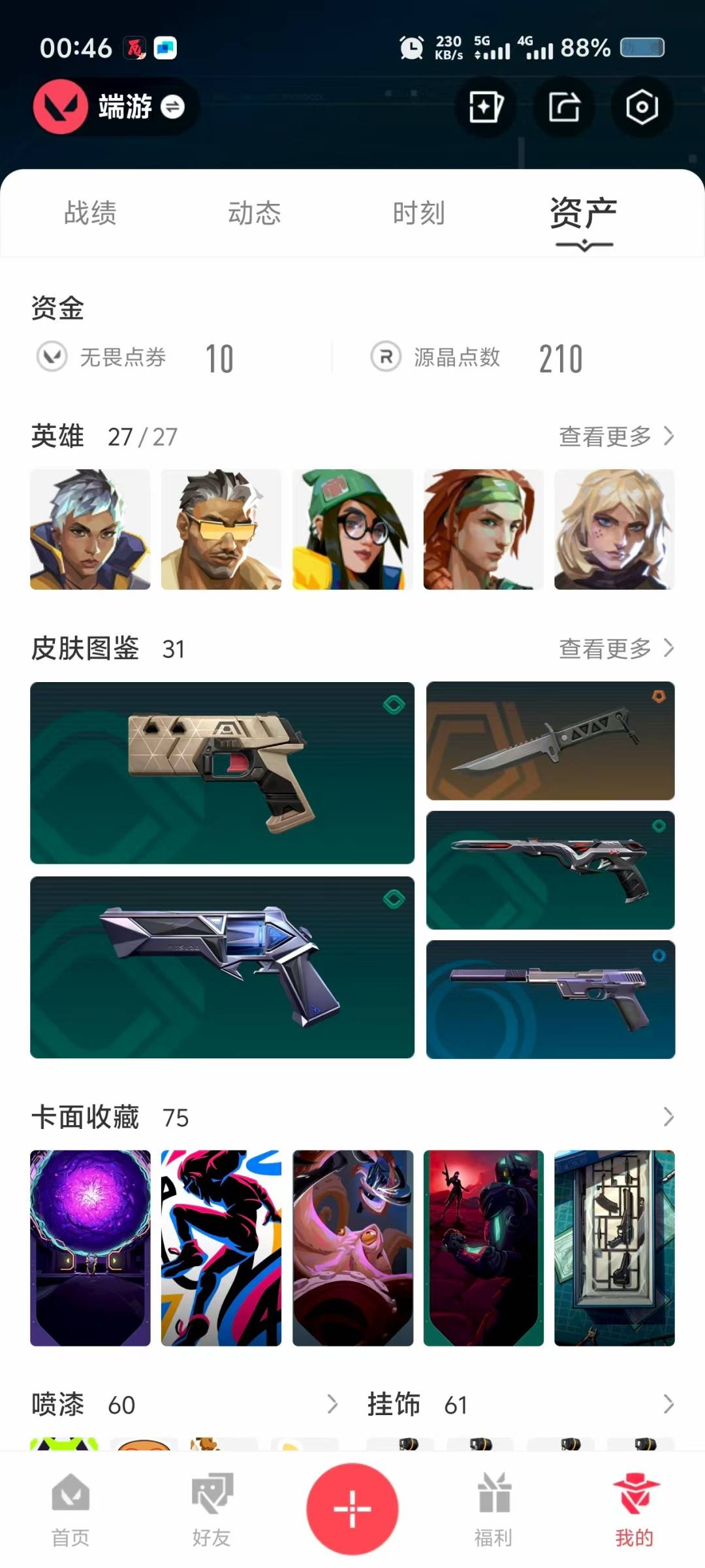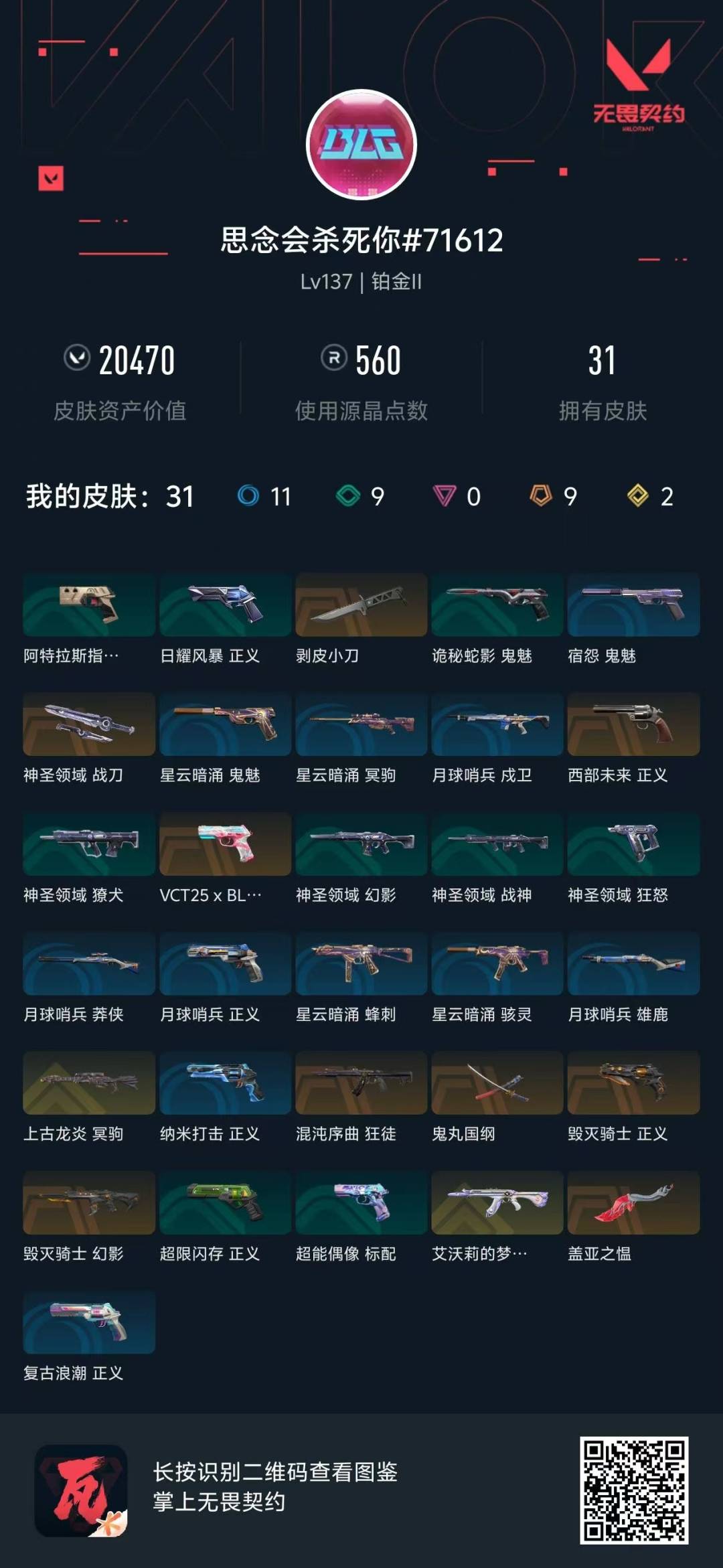 9橙皮 2金皮 31皮肤 27英雄 75卡面 560已用源晶 铂金 佩呛皮肤:正义-毁灭骑士标配-vct25xblg正义-西部未来 步呛皮肤:狂徒-混沌序曲幻影-毁灭骑士狂徒-艾沃莉的梦之翼 狙击呛皮肤:冥驹-上古龙炎 近战武器皮肤:神圣领域 战刀鬼丸国纲剥皮小刀盖亚之愠