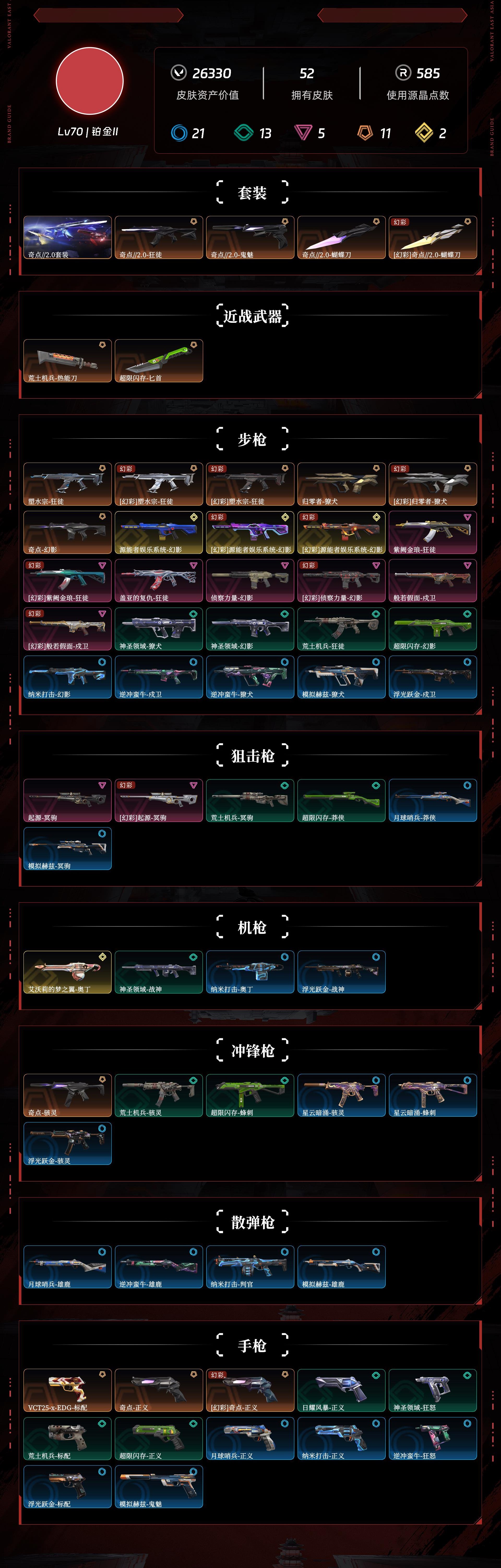 [10259519]r26281 有二次 剩余点券:13 lv70 ,皮肤总价值26330,铂金ii,总皮肤52,刀皮3呛皮49终极2传奇8卓越5,套装1传奇1,奇点2.0套装,具体详情看图