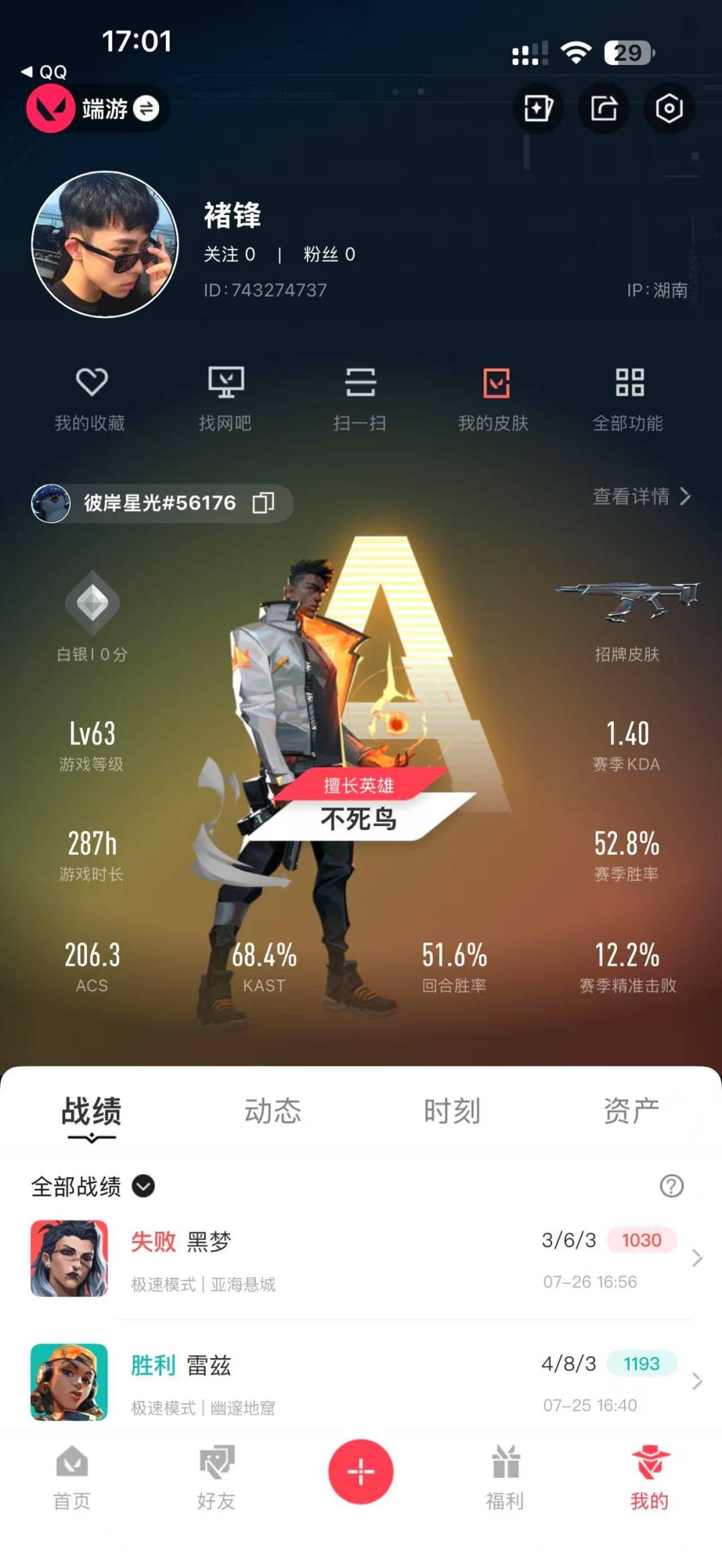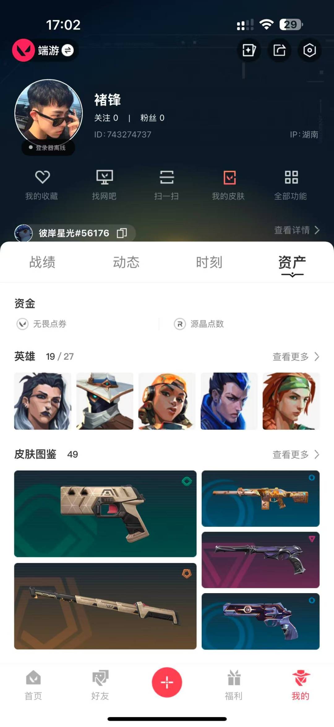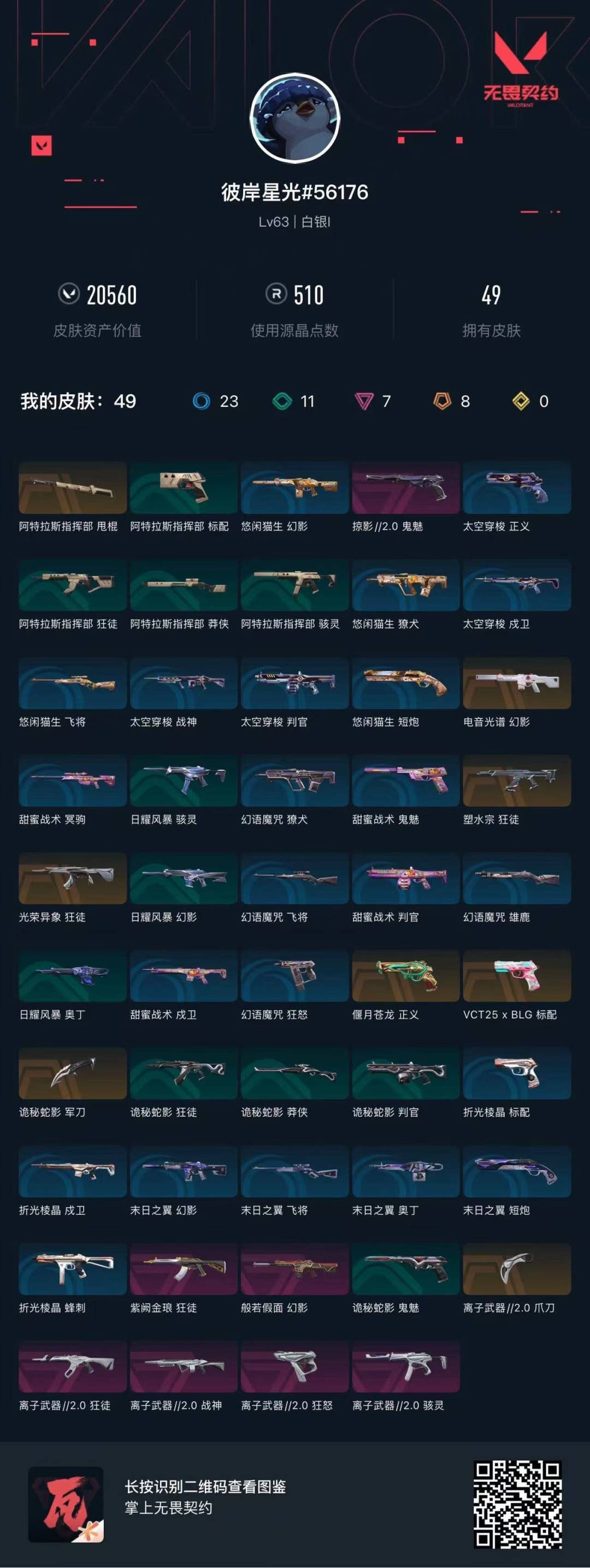 6橙皮 6紫皮 23皮肤 15英雄 40卡面 345已用源晶 青铜 套装:离子武器2.0 佩呛皮肤:标配-vct25xblg狂怒-离子武器2.0正义-偃月苍龙 冲锋呛皮肤:骇灵-离子武器2.0 步呛皮肤:狂徒-光荣异象狂徒-离子武器2.0狂徒-紫阙金琅狂徒-塑水宗幻影-般若假面 机呛皮肤
