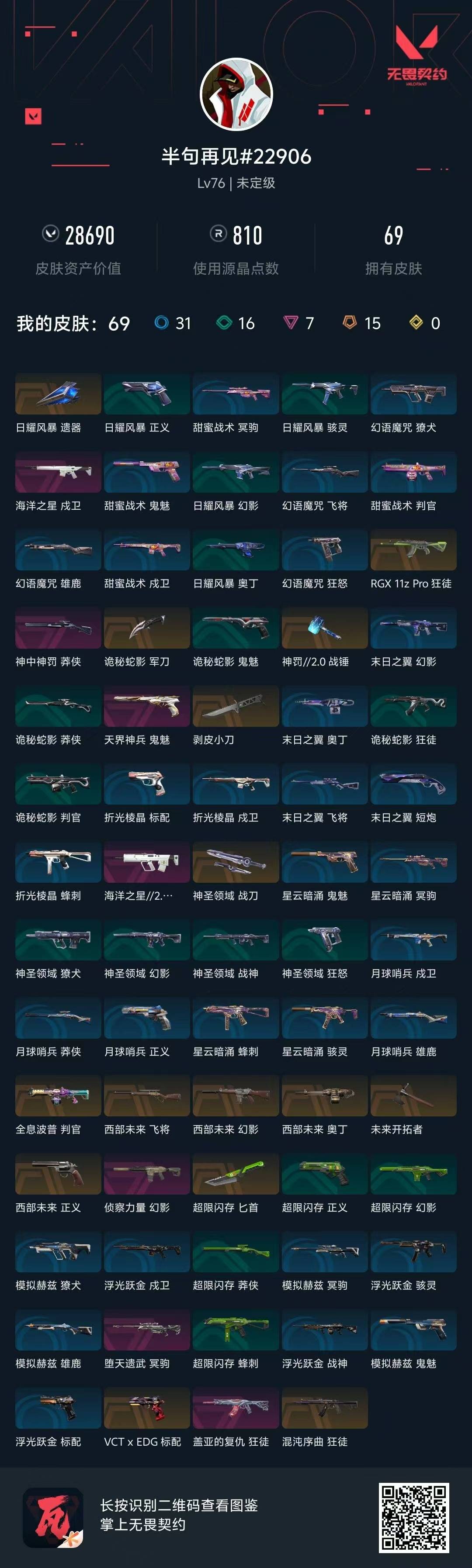 15橙皮 7紫皮 69皮肤 21英雄 95卡面 810已用源晶 未定级 套装:西部未来 佩呛皮肤:正义-西部未来鬼魅-天界神兵标配-vctxedg 霰弹呛皮肤:判官-全息波普 步呛皮肤:幻影-西部未来獠犬-海洋之星2.0狂徒-混沌序曲rgx 11z pro 狂徒狂徒-盖亚的复仇幻影-侦