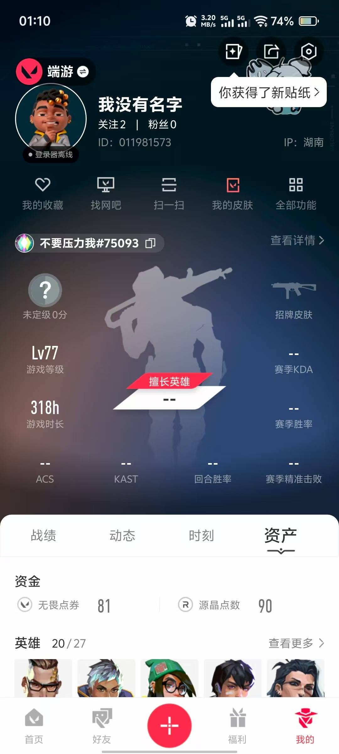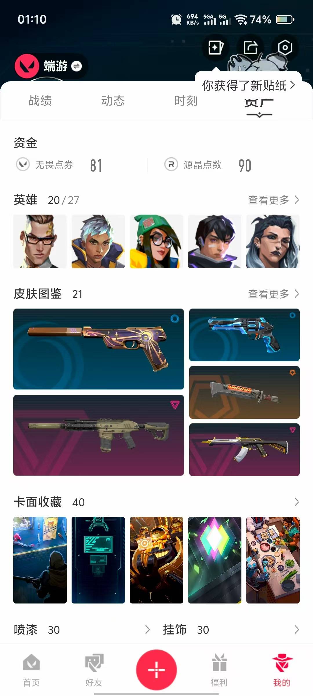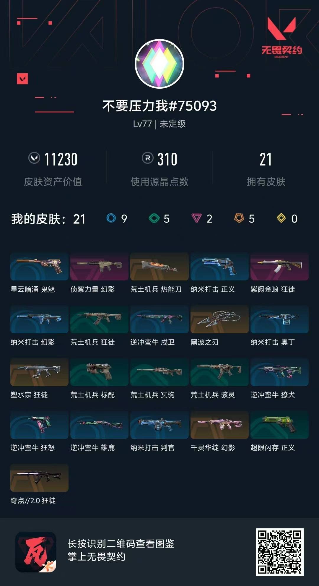 5橙皮 2紫皮 21皮肤 20英雄 40卡面 310已用源晶 未定级 步呛皮肤:狂徒-奇点//2.0狂徒-紫阙金琅狂徒-塑水宗幻影-侦察力量幻影-千灵华绽 近战武器皮肤:荒土机兵热能刀黑波之刃