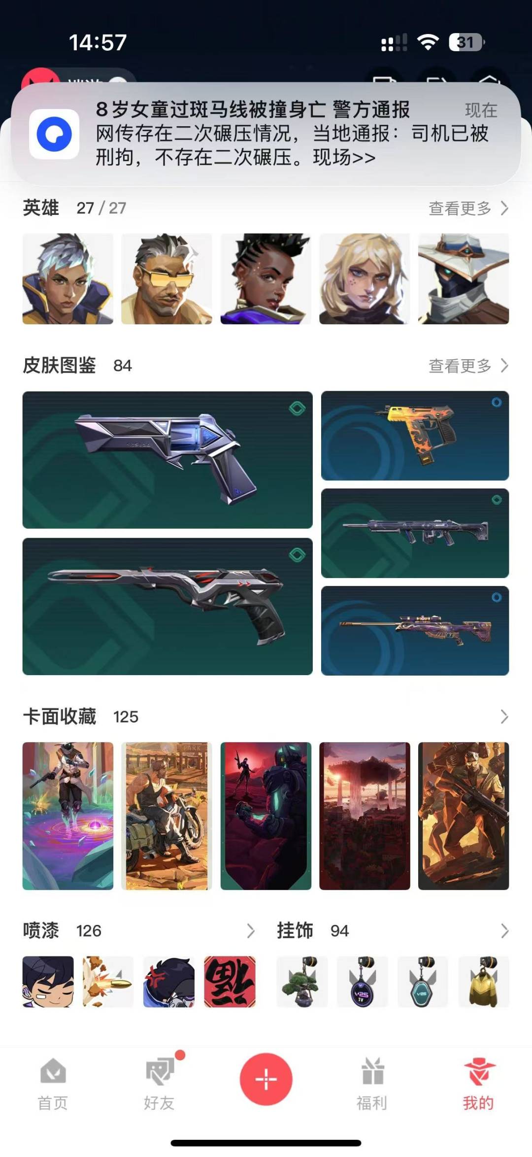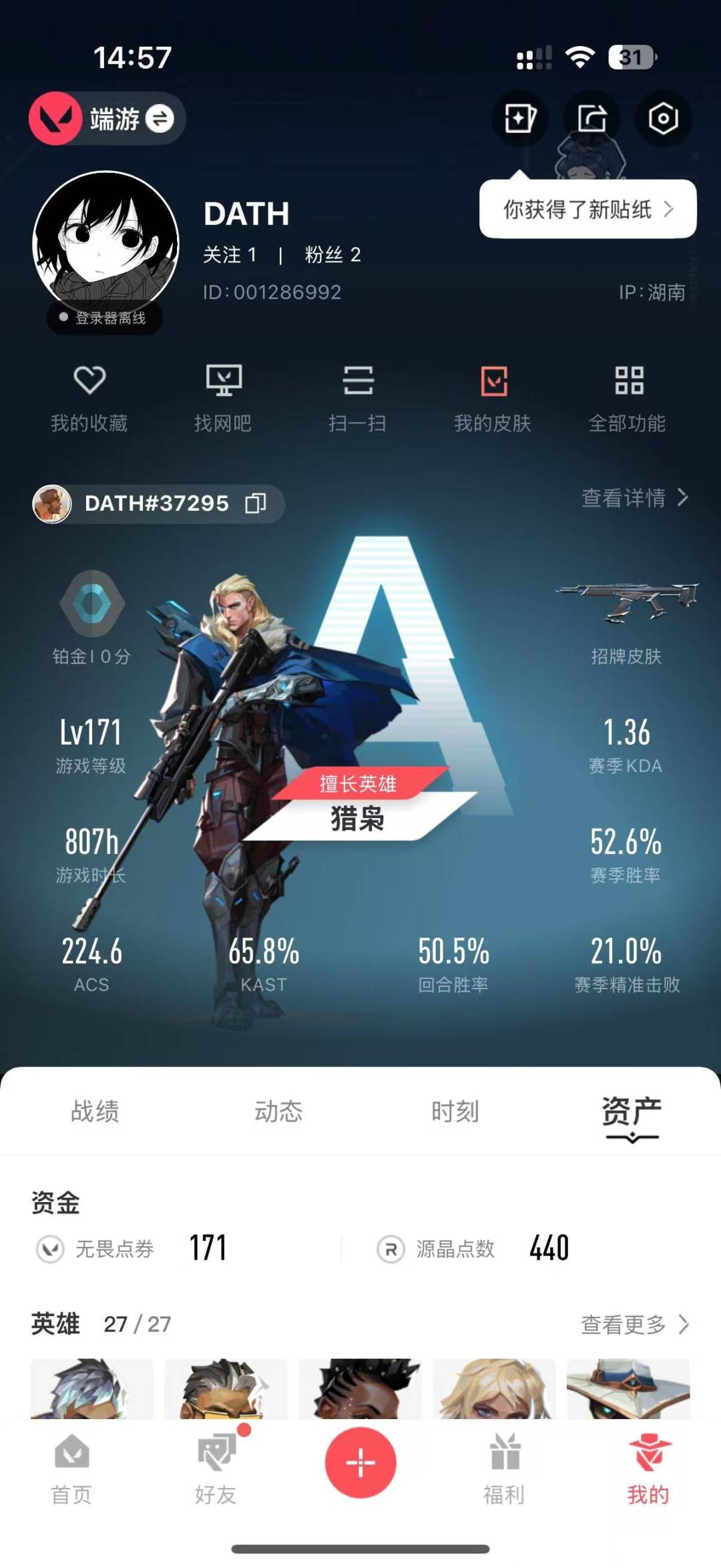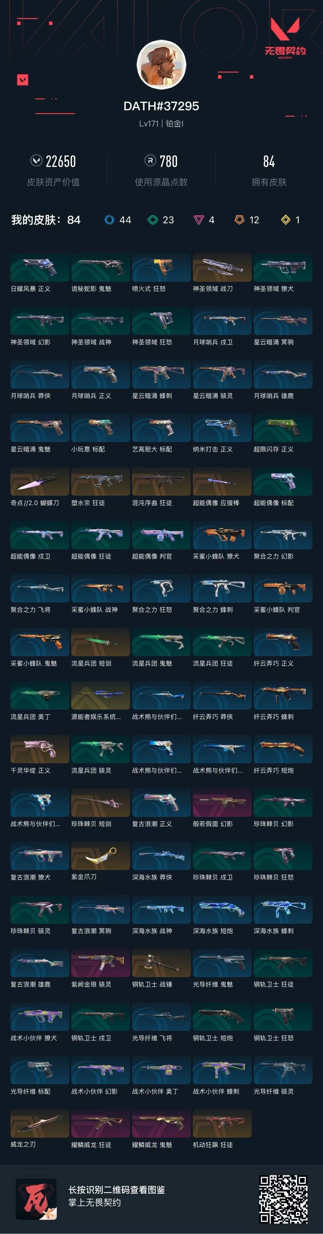 12橙皮 1金皮 4紫皮 84皮肤 27英雄 125卡面 780已用源晶 铂金 套装:耀鳞威龙套装 佩呛皮肤:正义-千灵华绽鬼魅-耀鳞威龙 冲锋呛皮肤:骇灵-紫阙金琅 步呛皮肤:狂徒-混沌序曲狂徒-塑水宗狂徒-耀鳞威龙狂徒-机动狂飙幻影-般若假面 狙击呛皮肤:冥驹-源能者娱乐系统 近战武器