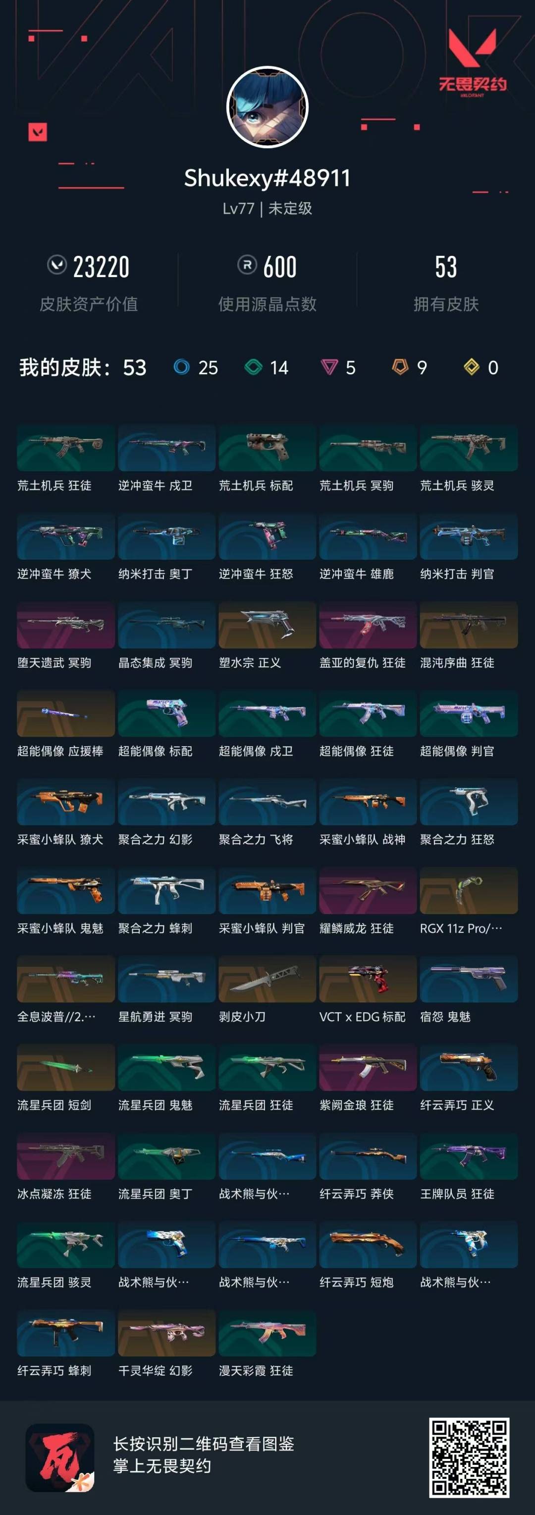 9橙皮 5紫皮 53皮肤 20英雄 75卡面 600已用源晶 未定级 佩呛皮肤:正义-塑水宗标配-vctxedg 步呛皮肤:狂徒-混沌序曲狂徒-紫阙金琅狂徒-盖亚的复仇狂徒-耀鳞威龙狂徒-冰点凝冻幻影-千灵华绽 狙击呛皮肤:冥驹-全息波普//2.0冥驹-堕天遗武 近战武器皮肤:短剑-流