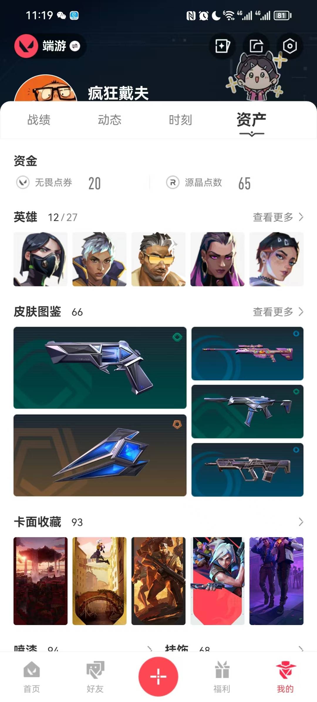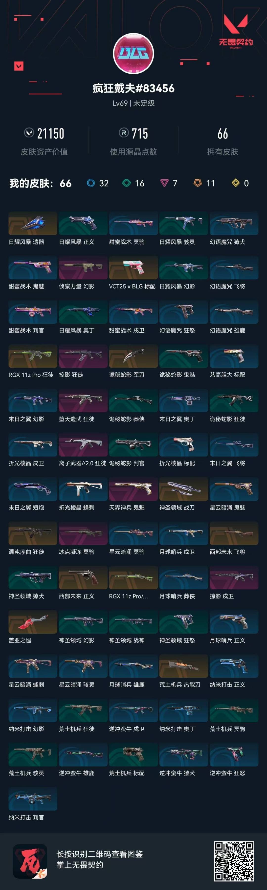 11橙皮 7紫皮 66皮肤 12英雄 93卡面 715已用源晶 未定级 佩呛皮肤:标配-vct25xblg正义-西部未来鬼魅-天界神兵 步呛皮肤:狂徒-掠影狂徒-混沌序曲戍卫-掠影狂徒-离子武器2.0rgx 11z pro 狂徒狂徒-堕天遗武幻影-侦察力量 狙击呛皮肤:飞将-西部未来