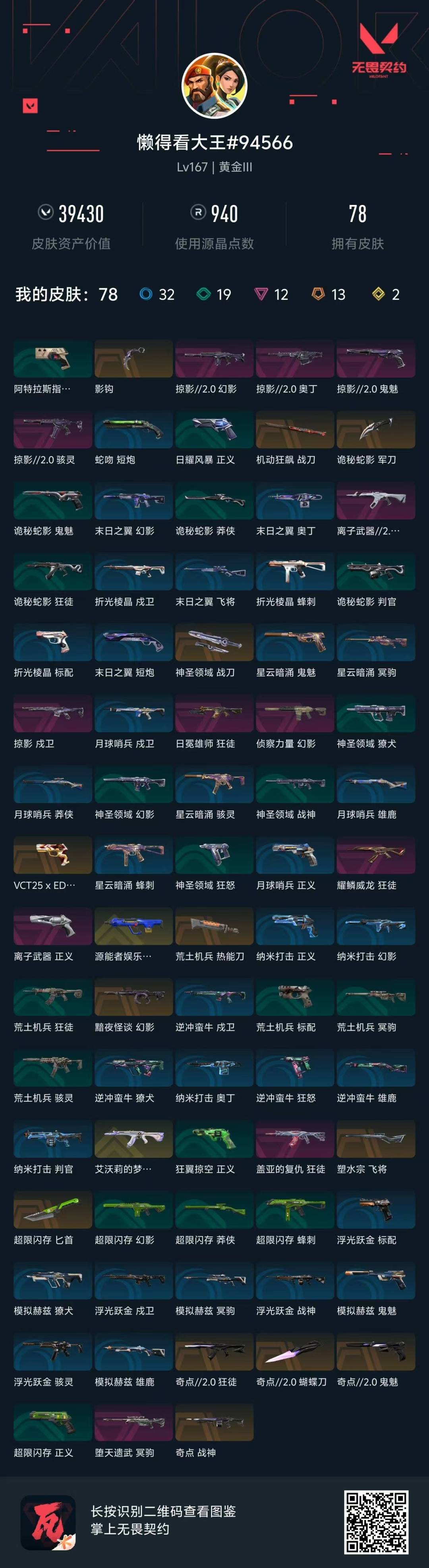 13橙皮 2金皮 12紫皮 78皮肤 22英雄 116卡面 940已用源晶 黄金 套装:奇点//2.0套装掠影2.0套装 佩呛皮肤:鬼魅-掠影2.0标配-vct25xedg鬼魅-奇点//2.0正义-离子武器 冲锋呛皮肤:骇灵-掠影2.0 步呛皮肤:幻影-掠影2.0幻影-黯夜怪谈狂徒-奇点