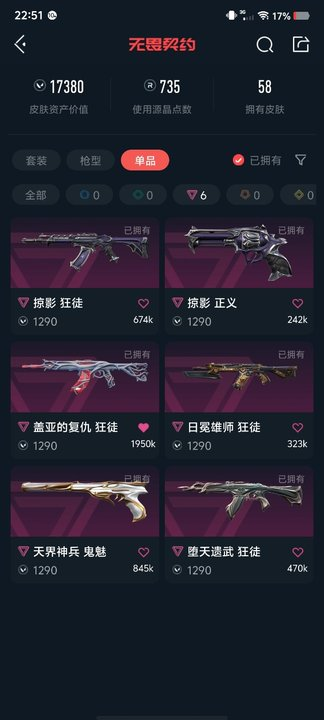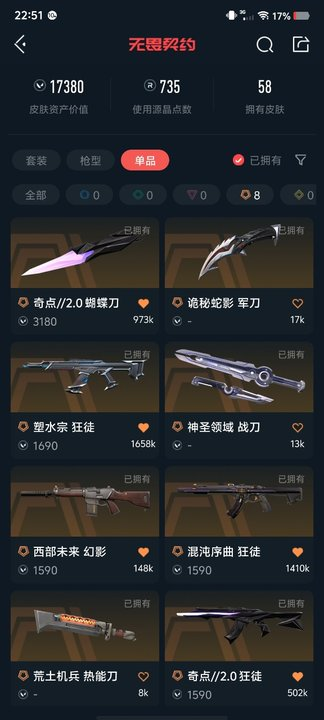 [10506622]s189036 无畏契约/148等级/黄金段位/22英雄/58皮肤/资产17380/已使用r点735/剩余r点105/诡秘蛇影-军刀,神圣领域-战刀,荒土机兵-热能刀,奇点//2.0-蝴蝶刀,西部未来-幻影,混沌序曲-狂徒,塑水宗-狂徒,奇点//2.0-狂徒,堕天遗武-狂徒,盖亚的复仇-狂徒,日冕雄师-狂徒,掠影-狂徒,天界神兵-鬼魅,掠影-正义,
