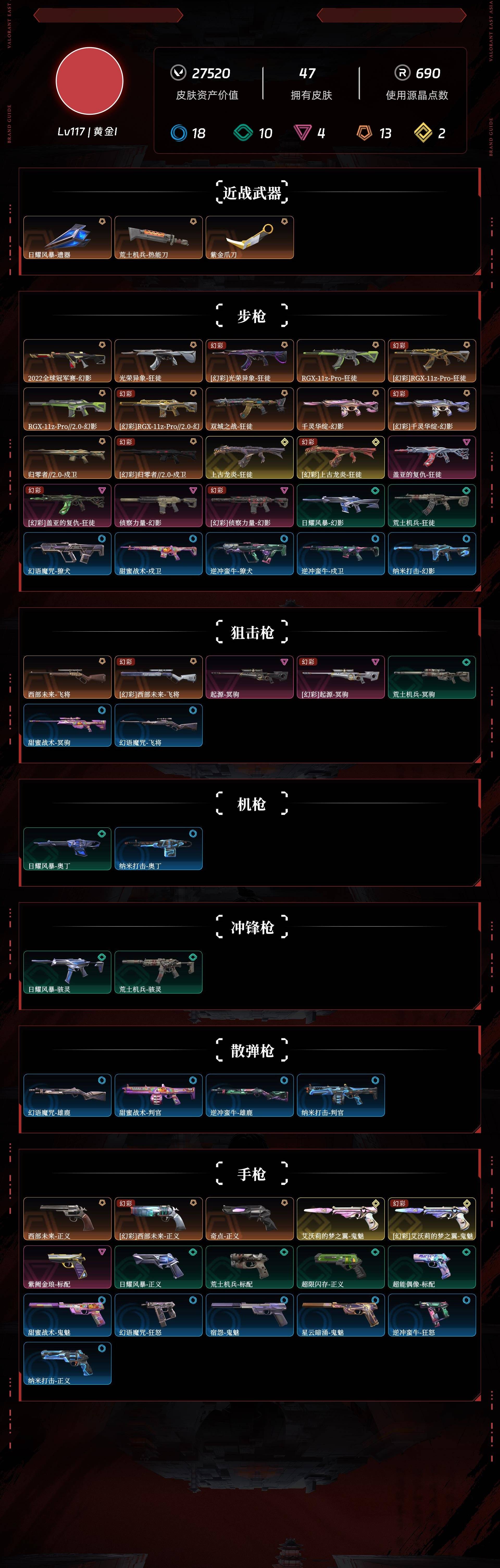 [10515969]r25053 剩余点券:187 lv117 ,皮肤总价值27520,黄金i,总皮肤47,刀皮3呛皮44终极2传奇10卓越4,具体详情看图