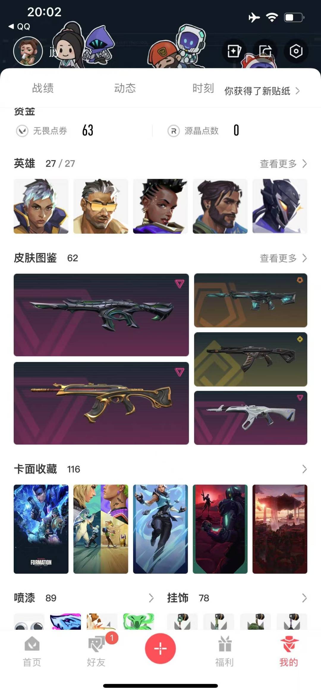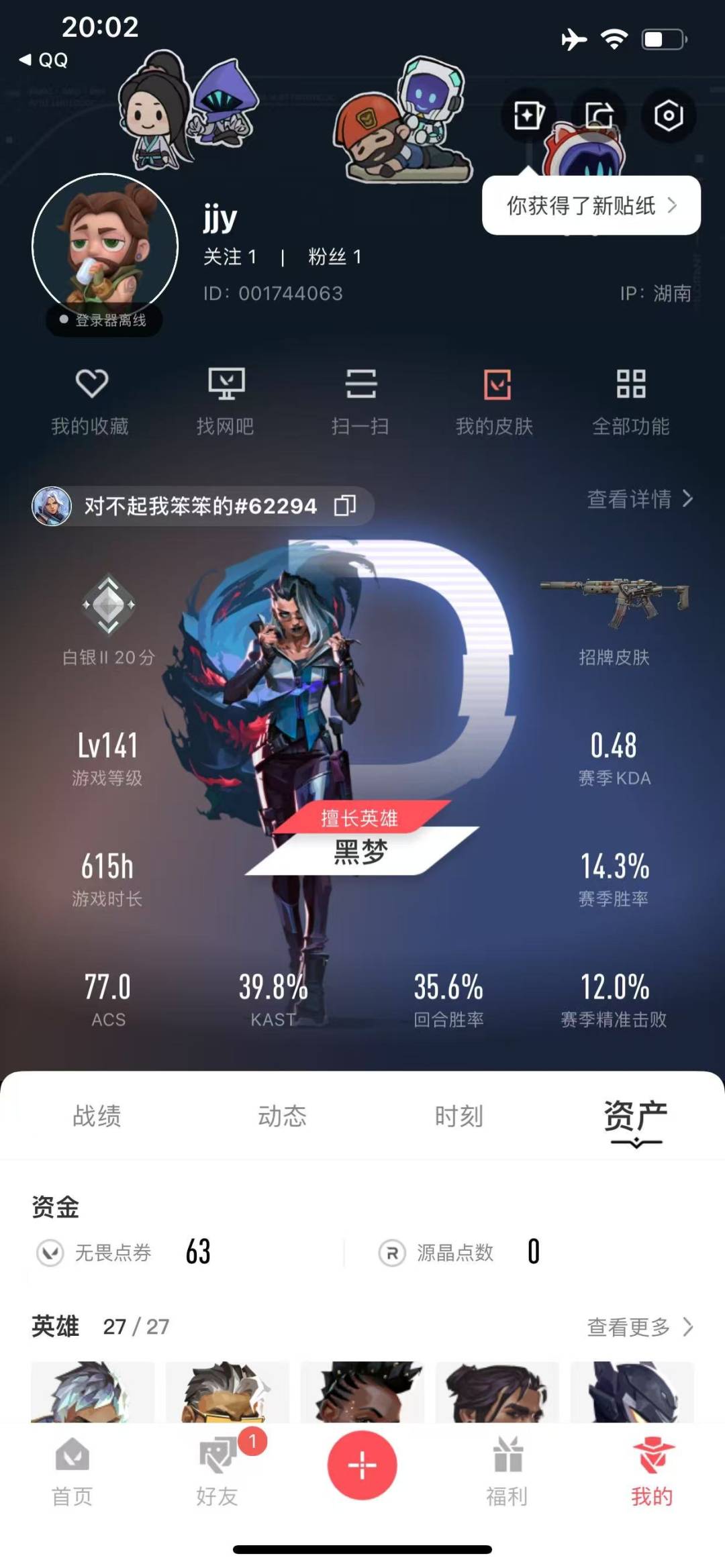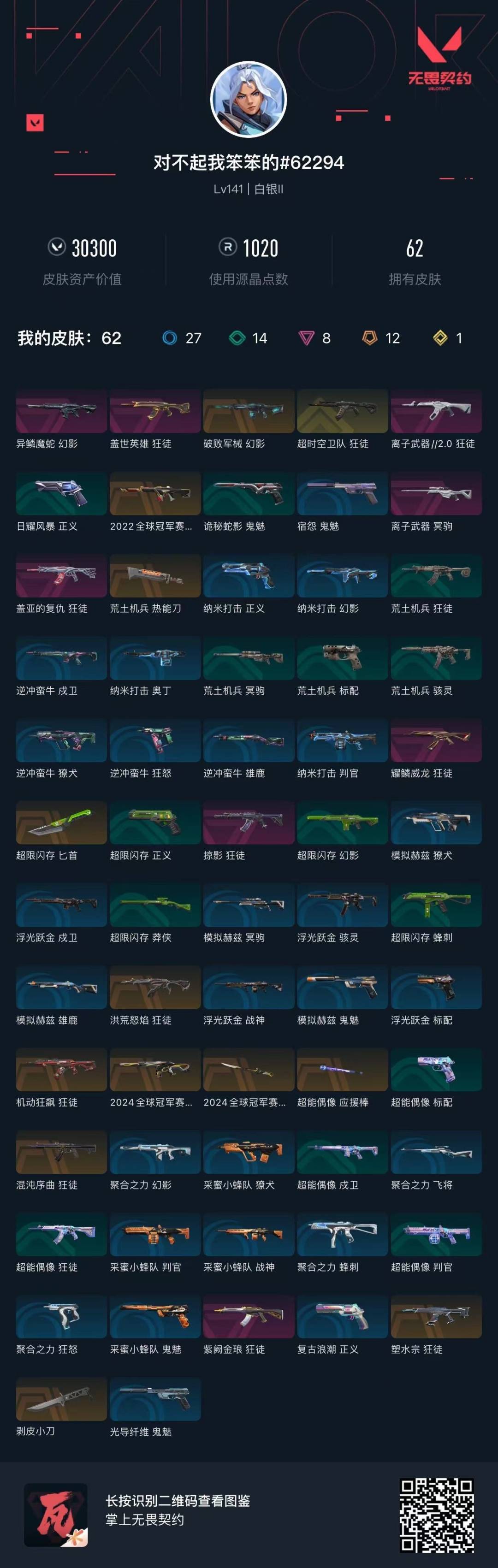 12橙皮 1金皮 8紫皮 62皮肤 27英雄 116卡面 1020已用源晶 白银 亮点皮肤:幻影-2024全球冠军赛战刀-2024全球冠军赛 套装:2024全球冠军赛套装 步呛皮肤:狂徒-掠影狂徒-混沌序曲狂徒-离子武器2.0幻影-异鳞魔蛇狂徒-超时空卫队狂徒-紫阙金琅狂徒-洪荒怒焰