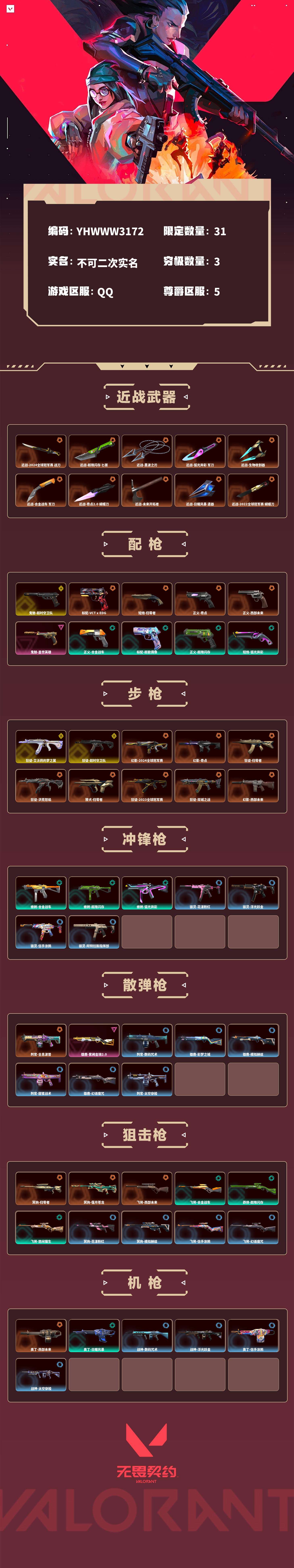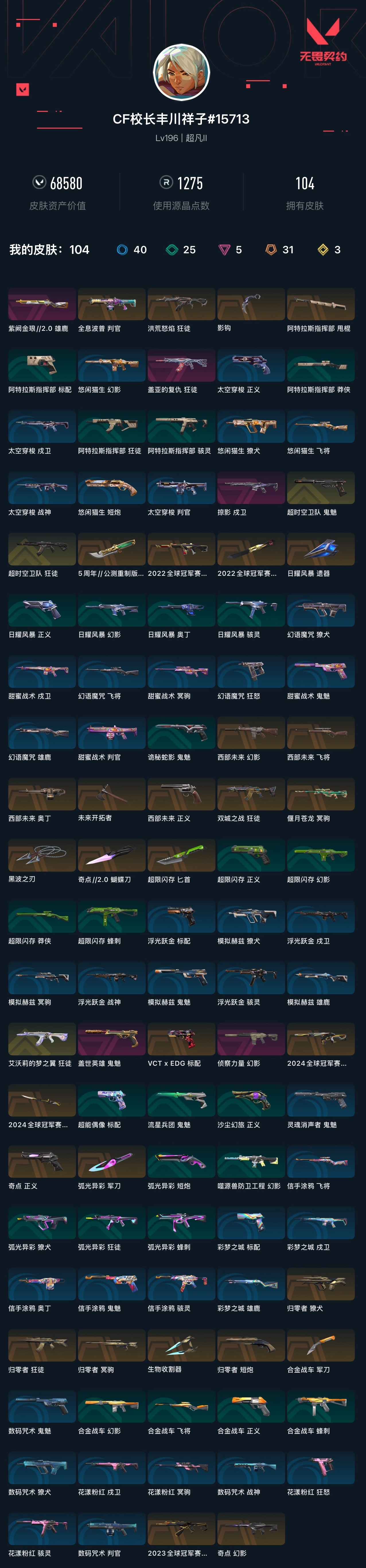 【无畏契约】【yhwww3172】等级:196,已用无畏点68580,已用源晶点1275,金皮:狂徒-艾沃莉的梦之翼|狂徒-超时空卫队|鬼魅-超时空卫队__橙皮:标配-vct x edg|短炮-归零者|幻影-2024全球冠军赛|近战-2024全球冠军赛 战刀|幻影-奇点|近战-超限闪存 匕首|近战-黑波之刃|近战-弧光异彩 军刀|近战-生物收割器|狂徒-归零者|狂徒-洪荒怒焰|獠犬-归零者|狂徒-2023全球冠军赛|正义-奇点|判官-全息波普|冥驹-归零者|冥驹-偃月苍龙|近战-合金战车 军刀|近战-奇点2.0 蝴蝶刀|狂徒-双城之战|飞将-西部未来|正义-西部未来|奥丁-西部未来|幻影-西部未来|近战-未来开拓者|近战-日耀风暴 遗器|近战-2022全球冠军赛 蝴蝶刀|幻影-2022全球冠军赛|近战-阿特拉斯指挥部 甩棍__紫皮:鬼魅-盖世英雄|幻影-侦察力量|狂徒-盖亚的复仇|雄鹿-紫阙金琅2.0|戍卫-掠影__段位:超凡__蓝皮:狂怒-花漾粉红|骇灵-花漾粉红|戍卫-花漾粉红|冥驹-花漾粉红|战神-数码咒术|獠犬-数码咒术|判官-数码咒术|鬼魅-数码咒术|鬼魅-灵魂消声者|戍卫-彩梦之城|雄鹿-彩梦之城|标配-彩梦之城|骇灵-浮光跃金|标配-浮光跃金|戍卫-浮光跃金|战神-浮光跃金|鬼魅-模拟赫兹|獠犬-模拟赫兹|冥驹-模拟赫兹|雄鹿-模拟赫兹|鬼魅-信手涂鸦|骇灵-信手涂鸦|奥丁-信手涂鸦|飞将-信手涂鸦|鬼魅-甜蜜战术|判官-甜蜜战术|戍卫-甜蜜战术|雄鹿-幻语魔咒|獠犬-幻语魔咒|飞将-幻语魔咒|狂怒-幻语魔咒|正义-太空穿梭|战神-太空穿梭|判官-太空穿梭|戍卫-太空穿梭|骇灵-阿特拉斯指挥部|莽侠-阿特拉斯指挥部|标配-阿特拉斯指挥部|狂徒-阿特拉斯指挥部__绿皮:蜂刺-合金战车|正义-合金战车|幻影-合金战车|飞将-合金战车|标配-超能偶像|正义-超限闪存|莽侠-超限闪存|幻影-超限闪存|蜂刺-超限闪存|短炮-弧光异彩|獠犬-弧光异彩|蜂刺-弧光异彩|狂徒-弧光异彩|鬼魅-流星兵团|正义-沙尘幻旅|幻影-噬源兽防卫工程|鬼魅-诡秘蛇影|正义-日耀风暴|幻影-日耀风暴|奥丁-日耀风暴|短炮-悠闲猫生|飞将-悠闲猫生|幻影-悠闲猫生|獠犬-悠闲猫生22套冠军 24套冠军 23冠军 苍龙小刀 影钩 流脓ak 小猫ak 黑波之刃 已用无畏点68580