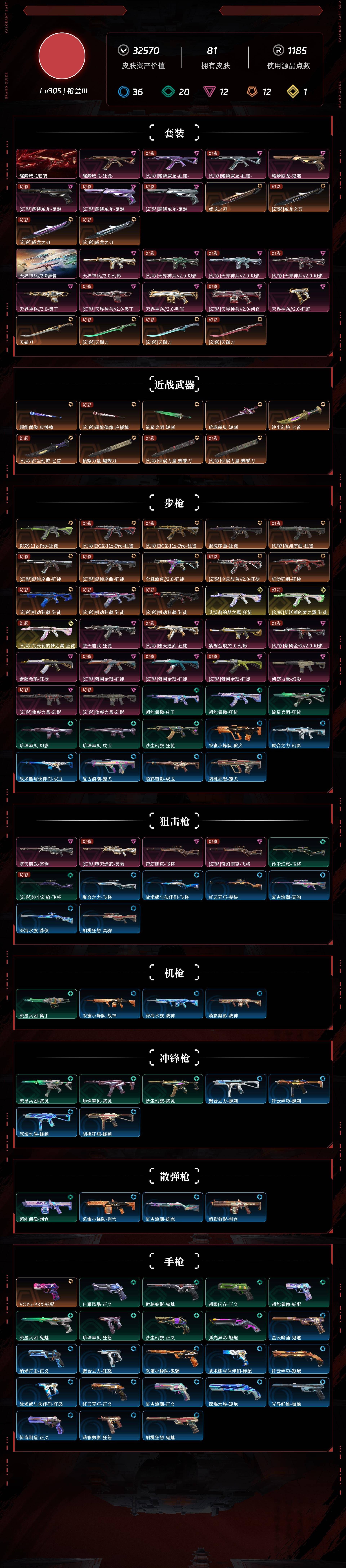 [10555868]r25185 剩余点券:77 lv305 ,皮肤总价值32570,铂金iii,总皮肤81,刀皮7呛皮74终极1传奇5卓越12,套装2卓越2,耀鳞威龙套装,具体详情看图