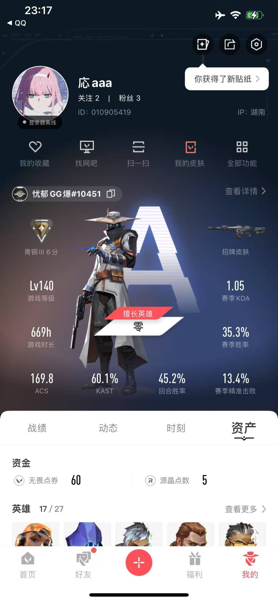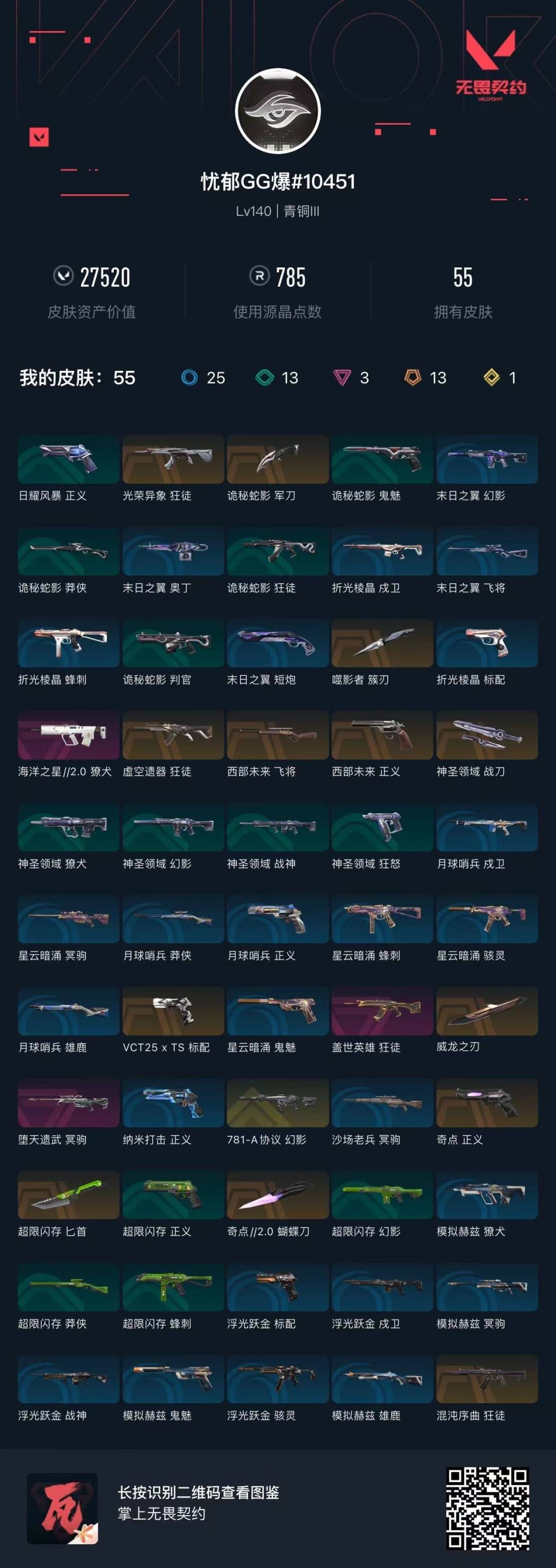 13橙皮 1金皮 3紫皮 55皮肤 17英雄 77卡面 785已用源晶 青铜 佩呛皮肤:标配-vct25xts正义-西部未来正义-奇点 步呛皮肤:狂徒-虚空遗器獠犬-海洋之星2.0狂徒-混沌序曲狂徒-光荣异象狂徒-盖世英雄幻影-781-a协议 狙击呛皮肤:飞将-西部未来冥驹-堕天遗武